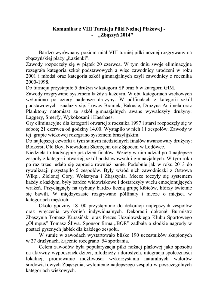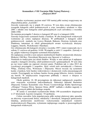 Komunikat z VIII Turnieju Piłki Nożnej Plażowej - „Zbąszyń 2014” Bardzo wyrównany poziom miał VIII turniej piłki nożnej rozgrywany na zbąszyńskiej plaży „Łazienki”. Zawody rozpoczęły się w piątek 20 czerwca. W tym dniu swoje eliminacyjne rozegrała kategoria szkół podstawowych a więc zawodnicy urodzeni w roku 2001 i młodsi oraz kategoria szkół gimnazjalnych czyli zawodnicy z rocznika 2000-1998. Do turnieju przystąpiło 5 drużyn w kategorii SP oraz 6 w kategorii GIM. Zawody rozgrywano systemem każdy z każdym. W obu kategoriach wiekowych wyłoniono po cztery najlepsze drużyny. W półfinałach z kategorii szkół podstawowych znalazły się: Łowcy Bramek, Bakusie, Drużyna Actimela oraz Planktony natomiast ze szkół gimnazjalnych awans wywalczyły drużyny: Laggery, Smerfy, Wykokosani i Haeshaes. Gry eliminacyjne dla kategorii otwartej z rocznika 1997 i starsi rozpoczęły się w sobotę 21 czerwca od godziny 14.00. Wystąpiło w nich 11 zespołów. Zawody w tej grupie wiekowej rozegrano systemem brazylijskim. Do najlepszej czwórki a tym samym niedzielnych finałów awansowały drużyny: Blokersi, Old Boy, Niewidomi Skorzęcin oraz Spoceni w Lodówce. Niedziela to tradycyjnie już dzień finałów. Wzięły w nim udział po 4 najlepsze zespoły z kategorii otwartej, szkół podstawowych i gimnazjalnych. W tym roku po raz trzeci udało się zaprosić również panie. Podobnie jak w roku 2013 do rywalizacji przystąpiło 5 zespołów. Były wśród nich zawodniczki z Ostrowa Wlkp., Zielonej Góry, Wolsztyna i Zbąszynia. Mecze toczyły się systemem każdy z każdym, były bardzo widowiskowe i dostarczyły wielu emocjonujących wrażeń. Przyciągnęły na trybuny bardzo liczną grupę kibiców, którzy świetnie się bawili. W międzyczasie rozgrywano półfinały i mecze o miejsca w kategoriach męskich. Około godziny 18. 00 przystąpiono do dekoracji najlepszych zespołów oraz wręczenia wyróżnień indywidualnych. Dekoracji dokonał Burmistrz Zbąszynia Tomasz Kurasiński oraz Prezes Uczniowskiego Klubu Sportowego „Olimpus” Tomasz Śliwa. Sponsor firma „BOR” zadbała o słodkie nagrody w postaci pysznych jabłek dla każdego zespołu. W sumie w zawodach wystartowało blisko 190 uczestników skupionych w 27 drużynach. Łącznie rozegrano 54 spotkania. Celem zawodów była popularyzacja piłki nożnej plażowej jako sposobu na aktywny wypoczynek dzieci, młodzieży i dorosłych, integracja społeczności lokalnej, promowanie możliwości wykorzystania naturalnych walorów środowiskowych Zbąszynia, wyłonienie najlepszego zespołu w poszczególnych kategoriach wiekowych. Organizatorami zawodów było Zbąszyńskie Centrum Sportu, Turystyki i Rekreacji oraz Uczniowski Klub Sportowy „Olimpus” działający przy miejscowym Liceum Garczyńskiego. KOOCOWA KOLEJNOŚD VIII TURNIEJU PIŁKI NOŻNEJ PLAŻOWEJ „ZBĄSZYO 2014” Boiska na plaży „Łazienki” 20-22 czerwca 2014 SZKOŁY PODSTAWOWE 1. DRUŻYNA ACTIMELA 2. ŁOWCY BRAMEK 3. BAKUSIE 4. PLANKTONY GIMNAZJA 1. LAGGERY 2. WYKOKOSANI 3. SMERFY 4. HAEHHAES OPEN 1. NIEWIDOMI SKORZĘCIN 2. OLD BOY 3. SPOCENI W LODÓWCE 4. BLOKERSI KOBIETY 1.STELMET UKP ZIELONA GÓRA / OPÓR 2.TP OSTRAVIA OSTRÓW WIELKOPOLSKI 3. STELMET UKP ZIELONA GÓRA / OGIEO 4. LICEUM OGÓLNOKSZTAŁCĄCE W ZBĄSZYNIU 5.KS GROM WOLSZTYN WYRÓŻNIENIA INDYWIDUALNE NAJSKUTECZNIEJSZY ZAWODNIK KOBIETY EWA SIEMIANOWSKA – STELMET / OPÓR SP KRYSTIAN BRYCHCY – ŁOWCY BRAMEK GIM NORBERT MAZEPA – LAGGERY OPEN MARCIN WALDA – NIEWIDOMI SKORZĘCIN NAJLEPSZY BRAMKARZ KOBIETY ADRIANNA GROCHOLEWSKA – LO ZBĄSZYO SP TOMIAK OSKAR– ŁOWCY BRAMEK GIM ERYK LEKKI - SMERFY OPEN JAKUB BORKOWSKI – SPOCENI W LODÓWCE NAJLEPSZY ZAWODNIK KOBIETY KAROLINA SIEPKO – STELMET / OGIEO SP GABRIEL ZILIOSKI – DRUŻYNA ACTIMELA GIM GRACJAN BARTCZAK - LAGGERY OPEN JACEK ZMUDA – OLD BOY