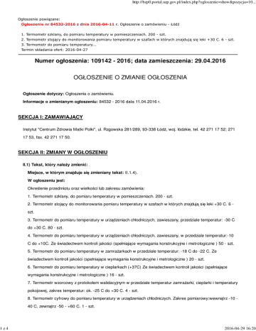 1z4 http://bzp0.portal.uzp.gov.pl/index.php?ogloszenie=show&pozycja=10... Ogłoszenie powiązane: Ogłoszenie nr 84532-2016 z dnia 2016-04-11 r. Ogłoszenie o zamówieniu - Łódź 1. Termometr szklany, do pomiaru temperatury w pomieszczeniach. 200 - szt. 2. Termometr stojący do monitorowania pomiaru temperatury w szafach w których znajdują się leki +30 C. 6 - szt. 3. Termometr do pomiaru temperatury... Termin składania ofert: 2016-04-27 Numer ogłoszenia: 109142 - 2016; data zamieszczenia: 29.04.2016 OGŁOSZENIE O ZMIANIE OGŁOSZENIA Ogłoszenie dotyczy: Ogłoszenia o zamówieniu. Informacje o zmienianym ogłoszeniu: 84532 - 2016 data 11.04.2016 r. SEKCJA I: ZAMAWIAJĄCY Instytut "Centrum Zdrowia Matki Polki", ul. Rzgowska 281/289, 93-338 Łódź, woj. łódzkie, tel. 42 271 17 52; 271 17 53, fax. 42 271 17 50. SEKCJA II: ZMIANY W OGŁOSZENIU II.1) Tekst, który należy zmienić: Miejsce, w którym znajduje się zmieniany tekst: II.1.4). W ogłoszeniu jest: Określenie przedmiotu oraz wielkości lub zakresu zamówienia: 1. Termometr szklany, do pomiaru temperatury w pomieszczeniach. 200 - szt. 2. Termometr stojący do monitorowania pomiaru temperatury w szafach w których znajdują się leki +30 C. 6 szt. 3. Termometr do pomiaru temperatury w urządzeniach chłodniczych, zawieszany, przedziale temperatur: -30 C do +30 C. 80 - szt. 4. Termometr do pomiaru temperatury w urządzeniach chłodniczych, zawieszany, w przedziale temperatur:-10 C do +10C. Ze świadectwem kontroli jakości (spełniające wymagania konstrukcyjne i metrologiczne ) 50 - szt. 5. Termometr do pomiaru temperatury w zamrażarkach w przedziale temperatur: -18 C do -22 C. Ze świadectwem kontroli jakości (spełniające wymagania konstrukcyjne i metrologiczne ) 20 - szt. 6. Termometr do pomiaru temperatury w cieplarkach (+37C) Ze świadectwem kontroli jakości (spełniające wymagania konstrukcyjne i metrologiczne ) 16 - szt. 7. Termometr wzorcowy z protokołem walidacyjnym w przedziale temperatur zamrażarki, cieplarki i temperatury pokojowej, zakres temperatur: ok. -25 C do +30 C. 4 - szt. 8. Termometr cyfrowy do pomiaru temperatury w urządzeniach chłodniczych. Zakres pomiarowy:wewnątrz -10 40 C, zewnątrz -50 - +60 C. 1 - szt. 2016-04-29 16:20 2z4 http://bzp0.portal.uzp.gov.pl/index.php?ogloszenie=show&pozycja=10... 9. Termometr laboratoryjny do wymogów akredytacyjnych, szklany, do lodówek i cieplarek zakres temperatur: -50 C do + 50 C 22 - szt. 10. Termometr bezprzewodowy, elektroniczny z czujnikiem wewnętrznym do lodówek. 16 - szt. 11. Termometr wyposażony w funkcję rejestracji temperatur do zamontowania w lodówkach 6 - szt. 12. Termometr elektroniczny przeznaczony do pomiaru temperatury ciała noworodów przedwcześnie urodzonych i przebywających w inkubatorach. 15 - szt. 13. Elektroniczny rejestrator pomiaru temperatur z GSM z powiadomieniem na telefon o spadku lub wzroście pomiaru temperatur z lodówki. 3 - szt. 14. Barometr (do pomiaru wilgotności ciśnienia i temperatury w pracowni badań czynnościowych układu oddechowego). 1 - szt. 15. Termohigrometr do pomieszczeń w których są przechowywane lub wytwarzane leki oraz do kontroli wilgotności temperatury w pomieszczeniu przechowywania pakietów sterylnych. 10 - szt. 16. Termometr elektroniczny do pomiaru temperatury w lodówce do przechowywania szczepionek z alarmem dźwiękowym i sondą zewnątrzną, dokładność 0,5-0,7 C. 1 - szt. 17. Termometr do bezdotykowego pomiaru temperatury ciała noworodka do stosowania w inkubatorze zamkniętym/otwartym z funkcją szybkiej ręcznej kalibracji i sensorem odległości: zakres pomiaru 1,0/55,0 C. Gwarancja min. 24 miesiące. 10 - szt. 18. Termohigrometr przenośny z sondą na przewodzie.Temperatura powietrza -zakres pomiarowy: -40 +70 C; wilgotność powietrza zakres: 0-100%RH. Ze świadectwem wzorcowania. 1 - szt. 19. Termometr elektroniczny do pomiaru temperatury u pacjentek, bezdotykowy, łatwy w dezynfekcji, odporny na działanie środków dezynfekcynych, zasilany bateriami alkalicznymi. 50 - szt. W ogłoszeniu powinno być: Określenie przedmiotu oraz wielkości lub zakresu zamówienia: 1. Termometr szklany, do pomiaru temperatury w pomieszczeniach. 200 - szt. 2. Termometr stojący do monitorowania pomiaru temperatury w szafach w których znajdują się leki +30 C. Zamawiający wymaga znaku WE, oraz świadectwo kontroli jakości z indywidualnym numerem i numerem fabrycznym - 6 - szt. 3. Termometr do pomiaru temperatury w urządzeniach chłodniczych, zawieszany, przedziale temperatur: -30 C do +30 C. Zamawiający wymaga znaku WE, oraz świadectwo kontroli jakości z indywidualnym numerem i numerem fabrycznym - 80 - szt. 4. Termometr do pomiaru temperatury w urządzeniach chłodniczych, zawieszany, w przedziale temperatur:-10 C do +10C. Ze świadectwem kontroli jakości (spełniające wymagania konstrukcyjne i metrologiczne ) Zamawiający wymaga znaku WE, oraz świadectwo kontroli jakości z indywidualnym numerem i numerem fabrycznym -50 - szt. 5. Termometr do pomiaru temperatury w zamrażarkach w przedziale temperatur: -18 C do -22 C. Ze świadectwem kontroli jakości (spełniające wymagania konstrukcyjne i metrologiczne ) Zamawiający wymaga znaku WE, oraz świadectwo kontroli jakości z indywidualnym numerem i numerem fabrycznym - 20 - szt. 6. Termometr do pomiaru temperatury w cieplarkach (+37C) Ze świadectwem kontroli jakości (spełniające 2016-04-29 16:20 3z4 http://bzp0.portal.uzp.gov.pl/index.php?ogloszenie=show&pozycja=10... wymagania konstrukcyjne i metrologiczne ) Zamawiający wymaga znaku WE, oraz świadectwo kontroli jakości z indywidualnym numerem i numerem fabrycznym -16 - szt. 7. Termometr wzorcowy z protokołem walidacyjnym w przedziale temperatur zamrażarki, cieplarki i temperatury pokojowej, zakres temperatur: ok. -25 C do +30 C. System/termometr wzorcowy do samodzielnej walidacji zamrażarki, cieplarki i temperatury powinien spełniać wymagania zgodnie z przywołanym 