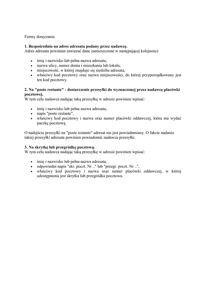 Formy doręczania 1. Bezpośrednio na adres adresata podany przez nadawcę. Adres adresata powinien zawierać dane zamieszczone w następującej kolejności: imię i nazwisko lub pełna nazwa adresata, nazwa ulicy, numer domu i mieszkania lub lokalu, miejscowość, w której znajduje się siedziba adresata, właściwy kod pocztowy oraz nazwa miejscowości, do której przyporządkowany jest ten kod pocztowy. 2. Na "poste restante" - dostarczenie przesyłki do wyznaczonej przez nadawcę placówki pocztowej. W tym celu nadawca nadając taką przesyłkę w adresie powinien wpisać: imię i nazwisko lub pełna nazwa adresata, napis "poste restante", właściwy kod pocztowy i nazwa oraz numer placówki oddawczej, która ma wydać paczkę pocztową. O nadejściu przesyłki na "poste restante" adresat nie jest powiadamiany. O fakcie nadania takiej przesyłki adresata powinien powiadomić nadawca przesyłki. 3. Na skrytkę lub przegródkę pocztową. W tym celu nadawca nadając taką przesyłkę w adresie powinien wpisać: imię i nazwisko lub pełna nazwa adresata, odpowiedni napis "skr. poczt. Nr .." lub "przegr. poczt. Nr ..", właściwy kod pocztowy i nazwa oraz numer placówki oddawczej, w której udostępniona jest skrytka lub przegródka pocztowa.