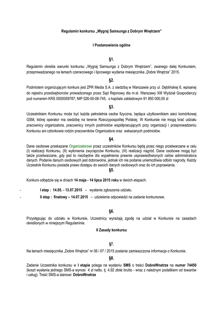 Regulamin konkursu „Wygraj Samsunga z Dobrym Wnętrzem” I Postanowienia ogólne §1. Regulamin określa warunki konkursu „Wygraj Samsunga z Dobrym Wnętrzem”, zwanego dalej Konkursem, przeprowadzanego na łamach czerwcowego i lipcowego wydania miesięcznika „Dobre Wnętrze” 2015. §2. Podmiotem organizującym konkurs jest ZPR Media S.A. z siedzibą w Warszawie przy ul. Dęblińskiej 6, wpisanej do rejestru przedsiębiorców prowadzonego przez Sąd Rejonowy dla m.st. Warszawy XIII Wydział Gospodarczy pod numerem KRS 0000059787; NIP 526-00-08-745, o kapitale zakładowym 91 850 000,00 zł §3. Uczestnikiem Konkursu może być każda pełnoletnia osoba fizyczna, będąca użytkownikiem sieci komórkowej GSM, której operator ma siedzibę na terenie Rzeczypospolitej Polskiej. W Konkursie nie mogą brać udziału pracownicy organizatora, pracownicy innych podmiotów współpracujących przy organizacji i przeprowadzeniu Konkursu ani członkowie rodzin pracowników Organizatora oraz wskazanych podmiotów. §4. Dane osobowe przekazane Organizatorowi przez uczestników Konkursu będą przez niego przetwarzane w celu (I) realizacji Konkursu, (II) wyłonienia zwycięzców Konkursu, (III) realizacji nagród. Dane osobowe mogą być także przetwarzane, gdy jest to niezbędne dla wypełnienia prawnie usprawiedliwionych celów administratora danych. Podanie danych osobowych jest dobrowolne, jednak ich nie podanie uniemożliwia odbiór nagrody. Każdy Uczestnik Konkursu posiada prawo dostępu do swoich danych osobowych oraz do ich poprawiania. §5. Konkurs odbędzie się w dniach 14 maja - 14 lipca 2015 roku w dwóch etapach: - I etap : 14.05. - 13.07.2015 – wysłanie zgłoszenia udziału. - II etap : finałowy – 14.07.2015 – udzielenie odpowiedzi na zadanie konkursowe. §6. Przystępując do udziału w Konkursie, Uczestnicy wyrażają zgodę na udział w Konkursie na zasadach określonych w niniejszym Regulaminie. II Zasady konkursu §7. Na łamach miesięcznika „Dobre Wnętrze” nr 06 i 07 / 2015 zostanie zamieszczona informacja o Konkursie. §8. Zadanie Uczestnika konkursu w I etapie polega na wysłaniu SMS o treści DobreWnetrze na numer 74450 (koszt wysłania jednego SMS-a wynosi 4 zł netto, tj. 4,92 złote brutto - wraz z należnym podatkiem od towarów i usług). Treść SMS-a stanowi: DobreWnetrze §9. SMS należy wysłać w takim czasie, aby dotarł on do Organizatora w terminie trwania I etapu Konkursu, tj. od dnia 14.05.2015 (od godziny 00:00:00,) do 13.07.2015 r. (do godziny 23:59:59). SMS-y, które dotrą do Organizatora przed lub po wskazanym terminie, nie będą uwzględniane w konkursie. §10. Jedna osoba może wysłać dowolną liczbę SMS. W konkursie jedna osoba może wygrać tylko jedną nagrodę. §11. Do wszystkich osób, które wysłały SMS zgodnie z §8. i §9. Organizator wyśle dnia 14.07.2015 r. SMS z pytaniem finałowym. Czas na udzielenie odpowiedzi wyniesie 24 godziny. §12. Zadaniem Uczestników w II finałowym etapie konkursu jest udzielenie opisowej odpowiedzi na zadanie finałowe. Odpowiedź należy wysłać za pomocą SMS-a na numer 74450 oraz o podanej przez organizatora treści w SMS-ie, o którym mowa w §11. §13. Dwie osoby, których odpowiedzi będą najbardziej ciekawe i wyczerpujące dla Jury Konkursu, otrzymują nagrody. Wyboru Laureatów dokona Jury Konkursu w składzie: - Beata Pierzchała - Dyrektor Biura Reklamy Wnętrza - Marzena Zielińska – SAMSUNG - Alicja Strzelczak – Dyrektor Działu Marketingu Wnętrza §14. Nagrodami w Konkursie są: 2 x Telewizor Samsung SUHD, Model 48” JS9000 o wartości - 10.699 zł. brutto (1 nagroda = 1 telewizor). §15. W przypadku niespełnienia przez Laureata wymogów Regulaminu, nie przesłania danych do wysyłki nagrody w ciągu tygodnia od powiadomienia o wygranej lub nieodebrania przez Laureata nagrody głównej w wyznaczonym terminie, nagroda przechodzi na własność ZPR Media S.A. §16. Lista zwycięzców konkursu, zawierająca imiona, nazwiska, miejscowości zamieszkania oraz informację o uzyskanym przez nich prawie do nagrody, opublikowana będzie na łamach wrześniowego wydania miesięcznika „Dobre Wnętrze” 09/15. §17. Organizator podejmie trzy próby połączenia telefonicznego z Uczestnikiem. Przez nieudaną próbę połączenia z Uczestnikiem rozumie się: nieodebranie połączenia, przez co najmniej 5 sygnałów, włączenie się poczty głosowej, brak możliwości połączenia z użytkownikiem telefonu (np. przebywanie poza zasięgiem, wyłączony aparat telefoniczny). §18. Zwycięzca - Laureat nagrody której wartość przekracza 760 zł. zobowiązany jest do wpłacenia podatku w wysokości 10% wartości nagrody na konto ZPR Media S.A. III. Postanowienia końcowe §19. Za chwilę dotarcia SMS do organizatora uważa się chwilę jego wpływu na serwer wyspecjalizowanego podmiotu obsługującego na zlecenie organizatora ruch SMS. §20. Organizator nie zwraca kosztów wysłania SMS. §21. We wszystkich postanowieniach niniejszego Regulaminu, w których mowa o wysłaniu SMS przez Organizatora do uczestników Konkursu, rozumie się przez to przekazanie przez wyspecjalizowany podmiot obsługujący ruch SMS wiadomości tekstowych do operatora GSM z żądaniem ich dostarczenia. Organizator nie bierze odpowiedzialności za sposób realizacji tego żądania przez operatorów GSM. §22. Ewentualne reklamacje należy nadsyłać pisemnie listem poleconym pod adres Organizatora, w terminie 14 dni od dnia zakończenia Konkursu, tj. dnia opublikowania listy nagrodzonych, z dopiskiem „Konkurs Wygraj Samsunga z Dobrym Wnętrzem”. §23. Wszelkich informacji dotyczących zasad konkursu Organizator udziela pod adresem mailowym: [email protected] §24. Niniejszy regulamin zostanie udostępniony do wglądu w biurze ZPR Media S.A. przy ul. Dęblińskiej 6 w Warszawie oraz na stronie www.dobrewnetrze.pl W imieniu Organizatora Alicja Strzelczak Dyrektor Marketingu Warszawa dnia 20 kwietnia 