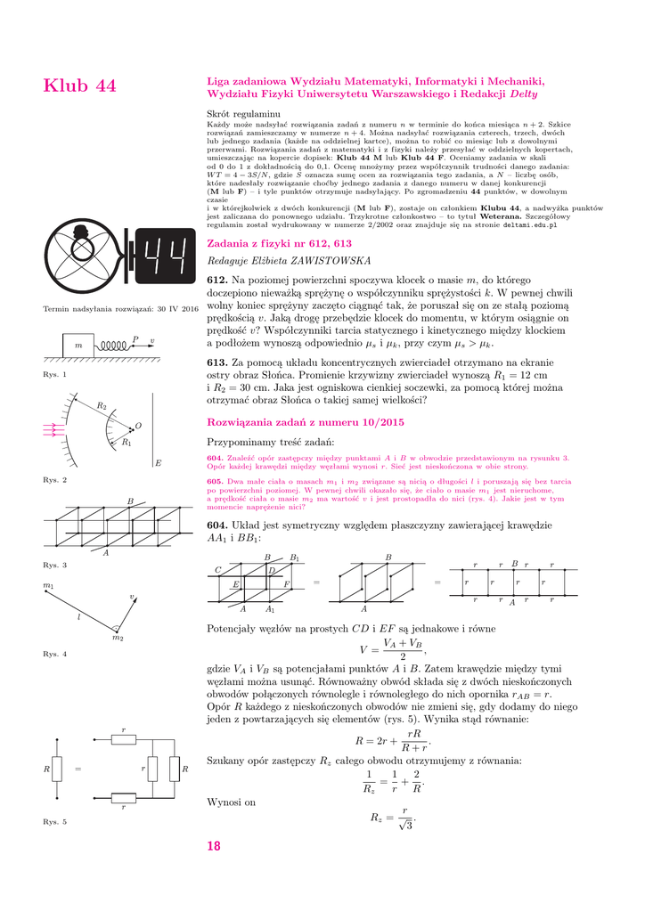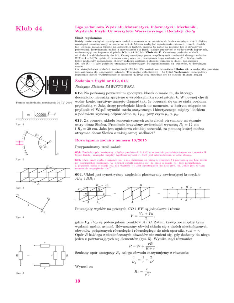 Klub 44 Liga zadaniowa Wydziału Matematyki, Informatyki i Mechaniki, Wydziału Fizyki Uniwersytetu Warszawskiego i Redakcji Delty Skrót regulaminu Każdy może nadsyłać rozwiązania zadań z numeru n w terminie do końca miesiąca n + 2. Szkice rozwiązań zamieszczamy w numerze n + 4. Można nadsyłać rozwiązania czterech, trzech, dwóch lub jednego zadania (każde na oddzielnej kartce), można to robić co miesiąc lub z dowolnymi przerwami. Rozwiązania zadań z matematyki i z fizyki należy przesyłać w oddzielnych kopertach, umieszczając na kopercie dopisek: Klub 44 M lub Klub 44 F. Oceniamy zadania w skali od 0 do 1 z dokładnością do 0,1. Ocenę mnożymy przez współczynnik trudności danego zadania: W T = 4 − 3S/N , gdzie S oznacza sumę ocen za rozwiązania tego zadania, a N – liczbę osób, które nadesłały rozwiązanie choćby jednego zadania z danego numeru w danej konkurencji (M lub F) – i tyle punktów otrzymuje nadsyłający. Po zgromadzeniu 44 punktów, w dowolnym czasie i w którejkolwiek z dwóch konkurencji (M lub F), zostaje on członkiem Klubu 44, a nadwyżka punktów jest zaliczana do ponownego udziału. Trzykrotne członkostwo – to tytuł Weterana. Szczegółowy regulamin został wydrukowany w numerze 2/2002 oraz znajduje się na stronie deltami.edu.pl Zadania z f izyki nr 612, 613 Redaguje Elżbieta ZAWISTOWSKA Termin nadsyłania rozwiązań: 30 IV 2016 Rys. 1 612. Na poziomej powierzchni spoczywa klocek o masie m, do którego doczepiono nieważką sprężynę o współczynniku sprężystości k. W pewnej chwili wolny koniec sprężyny zaczęto ciągnąć tak, że poruszał się on ze stałą poziomą prędkością v. Jaką drogę przebędzie klocek do momentu, w którym osiągnie on prędkość v? Współczynniki tarcia statycznego i kinetycznego między klockiem a podłożem wynoszą odpowiednio µs i µk , przy czym µs > µk . 613. Za pomocą układu koncentrycznych zwierciadeł otrzymano na ekranie ostry obraz Słońca. Promienie krzywizny zwierciadeł wynoszą R1 = 12 cm i R2 = 30 cm. Jaka jest ogniskowa cienkiej soczewki, za pomocą której można otrzymać obraz Słońca o takiej samej wielkości? Rozwiązania zadań z numeru 10/2015 Przypominamy treść zadań: 604. Znaleźć opór zastępczy między punktami A i B w obwodzie przedstawionym na rysunku 3. Opór każdej krawędzi między węzłami wynosi r. Sieć jest nieskończona w obie strony. Rys. 2 605. Dwa małe ciała o masach m1 i m2 związane są nicią o długości l i poruszają się bez tarcia po powierzchni poziomej. W pewnej chwili okazało się, że ciało o masie m1 jest nieruchome, a prędkość ciała o masie m2 ma wartość v i jest prostopadła do nici (rys. 4). Jakie jest w tym momencie naprężenie nici? 604. Układ jest symetryczny względem płaszczyzny zawierającej krawędzie AA1 i BB1 : Rys. 3 Rys. 4 Rys. 5 Potencjały węzłów na prostych CD i EF są jednakowe i równe V A + VB , V = 2 gdzie VA i VB są potencjałami punktów A i B. Zatem krawędzie między tymi węzłami można usunąć. Równoważny obwód składa się z dwóch nieskończonych obwodów połączonych równolegle i równoległego do nich opornika rAB = r. Opór R każdego z nieskończonych obwodów nie zmieni się, gdy dodamy do niego jeden z powtarzających się elementów (rys. 5). Wynika stąd równanie: rR R = 2r + . R+r Szukany opór zastępczy Rz całego obwodu otrzymujemy z równania: 1 1 2 = + . Rz r R Wynosi on r Rz = √ . 3 18 605. W płaszczyźnie poziomej nie działają na ciała żadne siły zewnętrzne, zatem środek masy układu wyznacza pewien inercjalny układ odniesienia. Wektory położenia ciał w układzie środka masy r1 i r2 spełniają związki: m1 r1 + m2 r2 = 0 oraz l = r1 + r2 . Stąd lm1 r2 = . m1 + m2 Analogiczny związek spełnia w CMS wektor prędkości ciała drugiego: m1 v , v2 = m1 + m2 gdzie v jest prędkością względną ciał. Szukane naprężenie nici dane jest wzorem: N= m2 v22 µv 2 = , r2 l gdzie µ= m1 m2 m1 + m2 jest masą zredukowaną układu. Rozszerzona czołówka ligi zadaniowej Klubu 44 F po 601 zadaniach Tomasz Rudny Tomasz Wietecha Marian Łupieżowiec Jacek Konieczny Michał Koźlik Ryszard Woźniak Krzysztof Magiera Karol Łukanowski Jacek Piotrowski Andrzej Nowogrodzki Jan Zambrzycki Jacek Grela Paweł Kubit Piotr Maślankowski Jędrzej Biedrzycki 37,68 10 – 29,64 1 – 28,11 27,92 3 – 26,32 22.51 3 – 14,40 11,97 2 – 10.49 3 – 3,08 7,34 3,02 1,09 0,64 0,46 Liczba przed pauzą oznacza krotność zdobycia 44 punktów. ∗ ∗ ∗ Podczas analizy współczynników trudności oraz liczby nadsyłanych w ubiegłym roku rozwiązań poszczególnych zadań nasuwa się refleksja, że najlepiej wypadają zadania z mechaniki. Uczestnicy Klubu często nadsyłają ogólniejsze niż oczekiwane rozwiązania problemów. Tak było, między innymi, w przypadku zadania 596 o zbliżających się statkach. Tomasz Wietecha podał pełne rozwiązanie problemu „krzywej pogoni”, część rozwiązań korzystała z gotowych, dostępnych w literaturze wzorów. I zostało to, oczywiście, uznane za poprawne, chociaż moją intencją było zachęcenie do poszukiwań jak najprostszych rozwiązań, które nie wymagają zaawansowanego aparatu matematycznego. Zdarzały się jednak zadania, gdzie liczba nadsyłanych rozwiązań była bardzo mała, lub były one niepoprawne. Do takich należały zadanie 598 na temat obwodu prądu zmiennego, zadanie 600 z termodynamiki (tu, być może, w treści nie zostało wyraźnie podkreślone, że utrzymywane są różne temperatury w dwóch częściach naczynia), czy zadanie 601 z optyki, gdzie nie nadeszły żadne rozwiązania – być może z powodu wakacji? Mam nadzieję, że zamieszczone w kolejnych numerach rozwiązania wyjaśniły zaistniałe problemy. Komentarza wymagają chyba zadanie 585 z optyki oraz 595 z termodynamiki. Pierwsza część zadania z optyki dotycząca przechodzenia promieni przez połączone czę