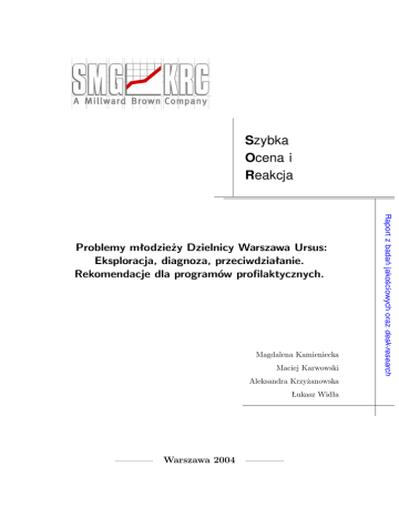 Szybka Ocena i Reakcja Magdalena Kamieniecka Maciej Karwowski Aleksandra Krzyżanowska Łukasz Widła Warszawa 2004 Raport z badań jakościowych oraz desk-research Problemy młodzieży Dzielnicy Warszawa Ursus: Eksploracja, diagnoza, przeciwdziałanie. Rekomendacje dla programów profilaktycznych. Spis treści Główne wnioski i rekomendacje Dzieci i młodzież . . . . . . . . . . . . . . . . . . . . . . . . . . . . . . . 4 4 Rekomendacje w zakresie dotychczas prowadzonych działań profilaktycznych . . . . . . . . . . . . . . . . . . . . . . . . . . . . . . . . . . . Uwagi wstępne 5 7 Definicja problemu/cel badania . . . . . . . . . . . . . . . . . . . . . . . 8 Cel badania . . . . . . . . . . . . . . . . . . . . . . . . . . . . . . . 8 Metodologia i próba 9 . . . . . . . . . . . . . . . . . . . . . . . . . . Obserwacja miejsc i sytuacji zwiększonego ryzyka . . . . . . . . . . 10 1 Dzielnica Ursus - podstawowe informacje, obszary zagrożenia 11 Młodzież Ursusa . . . . . . . . . . . . . . . . . . . . . . . . . . . . . . . 13 Jaka jest młodzież Ursusa? Reanaliza danych zastanych . . . . . . . . . . 15 Młodzież Ursusa w świetle innych badań . . . . . . . . . . . . . . . . . . 17 2 Dzieci i młodzież zamieszkujące dzielnicę Ursus - problemy, używki, sposoby aktywizacji 21 Charakterystyka poszczególnych grup wiekowych młodzieży . . . . . . . 22 Szkoła podstawowa . . . . . . . . . . . . . . . . . . . . . . . . . . . 22 Spis treści 2 Gimnazjum . . . . . . . . . . . . . . . . . . . . . . . . . . . . . . . 25 Szkoła średnia . . . . . . . . . . . . . . . . . . . . . . . . . . . . . . 29 Sposoby spędzania wolnego czasu . . . . . . . . . . . . . . . . . . . . . . 31 Alkohol, papierosy . . . . . . . . . . . . . . . . . . . . . . . . . . . . . . 33 Narkotyki . . . . . . . . . . . . . . . . . . . . . . . . . . . . . . . . . . . 35 Nauczyciel/psycholog/pedagog/ksiądz - autorytet? . . . . . . . . . . . . 36 3 Dorośli zajmujący się problemami młodzieży 39 Koordynacja i współpraca . . . . . . . . . . . . . . . . . . . . . . . . . . 40 Uzależnienia i problemy . . . . . . . . . . . . . . . . . . . . . . . . . . . 42 Sfera makro i finansowanie . . . . . . . . . . . . . . . . . . . . . . . . . . 44 Podsumowanie . . . . . . . . . . . . . . . . . . . . . . . . . . . . . . . . 45 4 Dyskusja i wnioski 47 Informacje o zespole realizującym badanie 51 Raport z badań jakościowych oraz desk-research. Spis rysunków 1.1 Struktura wiekowa mieszkańców Ursusa . . . . . . . . . . . . . . . . 14 1.2 Dynamika zmian liczebności młodzieży w Ursusie w różnych grupach wiekowych . . . . . . . . . . . . . . . . . . . . . . . . . . . . . 15 1.3 Czyny karalne popełniane przez młodzież z Ursusa . . . . . . . . . 16 1.4 Agresja w oczach uczniów . . . . . . . . . . . . . . . . . . . . . . . 19 4.1 Programy profilaktyczne . . . . . . . . . . . . . . . . . . . . . . . . 48 Główne wnioski i rekomendacje - zestawienie najważniejszych wyników Mimo, iż badania psychologiczno - socjologiczne (Warsaw Area Study ) pokazują, iż mieszkańcy Warszawy są bardziej szczęśliwi niż reszta kraju, widoczne są pewne problemy, które powinny być rozwiązane, by móc działać w pełni efektywnie. Dzieci i młodzież • Wydaje się, iż krytycznym okresem jest przejście ze szkoły podstawowej do gimnazjum - to tu powinna ogniskować się większa uwaga osób prowadzących działania profilaktyczne, • Należy umożliwić młodzieży rozpoczynającej naukę w gimnazjum ”miękkie wejście” w nową dla nich sytuację; zapewnienie im bezpieczeństwa - zarówno psychologicznego (oswojenie nowej i trudnej sytuacji), jak również fizycznego (aktywna walka z ”koceniem”), • Należy aktywizować dzieci i młodzież gimnazjalną oferując jej alternatywne sposoby spędzania czasu. Pokutuje stwierdzenie, że Główne wnioski i rekomendacje 5 ”żeby być fajnym w gimnazjum trzeba palić, pić i ćpać” - należy starać się zmienić ten stan rzeczy. • Zmiana obecnej niepokojącej sytuacji powinna przebiegać na kilku etapach: . Pokazywanie alternatywnych form spędzania czasu niekojarzących się z profilaktyką, czy socjoterapią - promowanie aktywności sportowej (sala gimnastyczna, siłownia, basen), czy kulturalnej (zespoły rockowe, czy hip-hopowe; kółka literackie, czy dziennikarskie), np. te oferowane przez Domy Kultury, . Akcentowanie wartości twórczego nonkonformizmu - przekonywanie, że nie trzeba być takim jak wszyscy, że większość nie zawsze ma rację - uczenie asertywności poprzez podwyższanie samooceny a nie zajęcia, które w opinii młodych ludzi są sztuczne, . Podkreślanie roli wykształcenia - pokazywanie konkretnych przypadków (wzorców) ludzi z ich okolicy, którym udało się dzięki wykształceniu; walka ze „stereotypem kujona”, . Działania na polu polityki społecznej - szkolenia i kursy dla rodziców; to w domu następuje transmisja wzorów bierności i apatii; aktywizacja rodziców i budowanie w nich przekonania, iż są w stanie coś zrobić jest daleko trudniejsza, ale konieczna dla skuteczności każdego działania profilaktycznego. Rekomendacje w zakresie dotychczas prowadzonych działań profilaktycznych • Kontrola dotychczas realizowanych programów pod kątem ich jakości merytorycznej oraz przygotowania prowadzących (ukończone studia podyplomowe oraz dodatkowe kursy), Raport z badań jakościowych oraz desk-research. Główne wnioski i rekomendacje 6 • Regularne działania o charakterze audytu, czy też superwizji szkolenia trenerów dokonywane przez osoby z zewnątrz - przygotowane do tego typu działalności, • Koordynacja działań pomiędzy różnymi - publicznymi i niepublicznymi organizacjami zajmującymi się profilaktyką - wyznaczenie jednego ośrodka koordynacyjnego zajmującego się szkoleniami i nadzorem, • Stworzenie bazy danych głównych obszarów realizowanych programów wraz z jasnym określeniem osób odpowiedzi