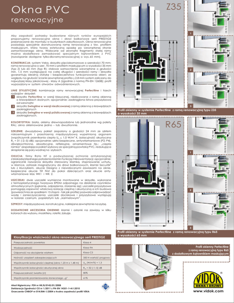 Z35 Okna PVC renowacyjne Aby zaspokoić potrzeby budowlane różnych rynków europejskich proponujemy renowacyjne okna i drzwi balkonowe serii PRESTIGE przeznaczone do montażu w budynkach zabytkowych. Okna renowacyjne posiadają specjalnie skonstruowaną ramę renowacyjną z tzw. profilem maskującym, która tworzy estetyczną opaskę po wewnętrznej stronie zamontowanego okna. Widoczne od zewnątrz fragmenty starej ramy można dodatkowo zamaskować specjalnym kątownikiem z PVC (rozwiązanie dostępne tylko dla ramy renowacyjnej o wys. 65 mm). KONSTRUKCJA: system Veka, skrzydło pięciokomorowe o szerokości 70 mm; rama renowacyjna o szer. 70 mm z profilem maskującym o wysokości 35 mm (typ Z) lub 65 mm (typ R); stalowe wzmocnienia wewnętrzne o grubości min. 1,5 mm występujące na całej długości i szerokości ramy i skrzydła gwarantują idealną statykę i bezpieczeństwo funkcjonowania okien; ze względu na grubość ścianki zewnętrznej profila ≥ 2,8 mm system zaliczany do najwyższej klasy jakościowej - klasy A (zgodnie z normą PN-EN 12608); profil wyposażony w system otworów odwodnieniowych. 1 70 51 80 111 146 60 2 66 35 LINIE STYLISTYCZNE: kombinacje ramy renowacyjnej Perfectline i trzech rodzajów skrzydeł: - 1 skrzydło Perfectline w wersji klasycznej, niezlicowane z ramą okienną 70 o krawędziach skośnych; opcjonalnie: zaokrąglona listwa przyszybowa od wewnątrz Profil okienny Perfectline z ramą renowacyjną typu "Z" o wys. 35 mm. - 2 skrzydło Swingline w wersji niezlicowanej z ramą okienną o krawędziach 3 zaokrąglonych Profil okienny w systemie Perfectline z ramą renowacyjną typu Z35 3 skrzydło Swingline w wersji półzlicowanej z ramą okienną o krawędziach o wysokości 35 mm zaokrąglonych. R65 KOLORYSTYKA: biała, okleiny drewnopodobne lub jednorodne wg palety RAL; okna okleinowane jedno – lub dwustronnie. SZKLENIE: dwuszybowy pakiet zespolony o grubości 24 mm ze szkłem niskoemisyjnym i przestrzenią międzyszybową wypełnioną argonem 2 (współczynnik przenikania ciepła Ug ≤ 1,0 W/m K, izolacyjność akustyczna Rw = 31 (-2;-5) dB); opcjonalnie: szkło bezpieczne, antywłamaniowe (P2; P4), dźwiękochłonne, absorbcyjne, refleksyjne, ornamentowe itp.; „ciepła ramka” zespalająca pakiet szybowy ze specjalną powłoką PVC, redukująca skraplanie się pary wodnej na szybach. OKUCIA: firmy Roto NT o podwyższonej ochronie antykorozyjnej z blokadą błędnego położenia klamki i funkcją mikrowentylacji; opcjonalnie: ogranicznik rozwarcia skrzydła sterowany klamką, stopniowanie uchyłu, ® w klamce, zatrzask magnetyczny do drzwi balkonowych, klamki Secustik lub z kluczykiem, okucie Designo z niewidocznymi zawiasami na oknie, bezpieczne okucie Tilt First do pokoi dziecięcych oraz okucie antywłamaniowe klas WK1 i WK 2. 1 70 51 80 USZCZELKI: dwie uszczelki wymienne montowane w skrzydle, wykonane z termoplastycznego tworzywa EPDM odpornego na działanie czynników atmosferycznych (pękanie, odprężenia, starzenie się); uszczelki przyszybowe pomagają zapewnić właściwą izolację cieplną i akustyczną a ich budowa (powierzchnia ze spadkiem 15 stopni - tak jak profile) pozwala odprowadzać wodę i zanieczyszczenia; uszczelki dociskowe i przyszybowe występują w kolorze czarnym, popielatym lub „karmelowym”. 43 159 2 SZPROSY: międzyszybowe, konstrukcyjne, naklejane zewnętrznie na szybę. DODATKOWE AKCESORIA OKIENNE: klamki i osłonki na zawiasy w kilku kolorach do wyboru, moskitiery, roletki, żaluzje. 79 65 70 Klasyfikacja właściwości okna renowacyjnego serii PRESTIGE Przepuszczalnośc powietrza Klasa 4 Wodoszczelność Klasa 9A Odporność na obciążenie wiatrem Klasa C5 Nośność urządzeń zabezpieczających 350 N wartość progowa Współczynnik izolacyjności cieplnej (okno 1,23 m x 1,48 m) Uw (W/m K) = 1,3 Współczynnik izolacyjności akustycznej okna Rw = 32 (-1;-5) dB Przepuszczalność światła (Lt) 80% Współczynnik promieniowania słonecznego „g” 61% 3 Profil okienny w systemie Perfectline z ramą renowacyjną typu R65 o wysokości 65 mm Profil okienny Perfectline z ramą renowacyjną typu R65 z dodatkowym kątownikiem maskującym 2 Atest Higieniczny: PZH nr HK/B/0143/01/2008 Deklaracja Zgodności CE nr 1/2011 z PN-EN 14351-1+A1:2010 Orzeczenie CNBOP nr 014/BM-1/2004 o trudno zapalności profili VEKA www.vidok.com