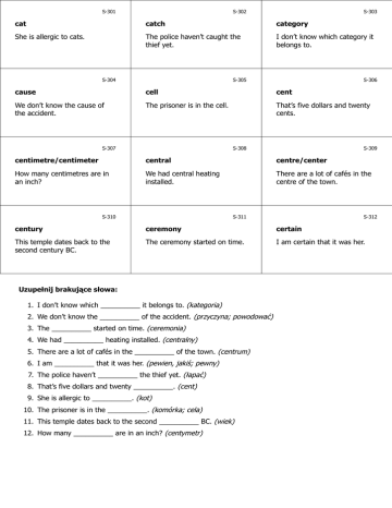 S-301 S-302 S-303 cat catch category She is allergic to cats. The police haven’t caught the thief yet. I don’t know which category it belongs to. S-304 S-305 S-306 cause cell cent We don’t know the cause of the accident. The prisoner is in the cell. That’s five dollars and twenty cents. S-307 S-308 S-309 centimetre/centimeter central centre/center How many centimetres are in an inch? We had central heating installed. There are a lot of cafés in the centre of the town. S-310 S-311 S-312 century ceremony certain This temple dates back to the second century BC. The ceremony started on time. I am certain that it was her. Uzupełnij brakujące słowa: 1. I don’t know which __________ it belongs to. (kategoria) 2. We don’t know the __________ of the accident. (przyczyna; powodować) 3. The __________ started on time. (ceremonia) 4. We had __________ heating installed. (centralny) 5. There are a lot of cafés in the __________ of the town. (centrum) 6. I am __________ that it was her. (pewien, jakiś; pewny) 7. The police haven’t __________ the thief yet. (łapać) 8. That’s five dollars and twenty __________. (cent) 9. She is allergic to __________. (kot) 10. The prisoner is in the __________. (komórka; cela) 11. This temple dates back to the second __________ BC. (wiek) 12. How many __________ are in an inch? (centymetr) S-303 S-302 S-301 kategoria łapać kot Nie wiem, do której kategorii to należy. Policja jeszcze nie złapała złodzieja. Ona ma alergię na koty. www.isel.edu.pl www.isel.edu.pl www.isel.edu.pl S-306 S-305 S-304 cent komórka; cela przyczyna; powodować To jest pięć dolarów i dwadzieścia centów. Więzień jest w celi. Nie znamy przyczyny wypadku. www.isel.edu.pl www.isel.edu.pl www.isel.edu.pl S-309 S-308 S-307 centrum centralny centymetr W centrum miasta jest wiele kawiarni. Zleciliśmy instalację centralnego ogrzewania. Ile centymetrów jest się w jednym calu? www.isel.edu.pl www.isel.edu.pl www.isel.edu.pl S-312 S-311 S-310 pewien, jakiś; pewny ceremonia wiek Jestem pewien, że to była ona. Ceremonia zaczęła się punktualnie. Historia tej świątyni sięga II wieku p.n.e. www.isel.edu.pl Odpowiedzi: 1. category 2. cause 3. ceremony 4. central 5. centre 6. certain 7. caught 8. cents 9. cats 10. cell 11. century 12. centimetres www.isel.edu.pl www.isel.edu.pl