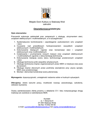 Miejski Dom Kultury w Stalowej Woli zatrudni Oświetleniowca/elektryka Opis stanowiska: Pracownik wykonuje całokształt prac związanych z obsługą, utrzymaniem sieci, urządzeń elektrycznych i multimedialnych, a w szczególności: 1. Systematyczne kontrolowanie i zapobieganie uszkodzeniom w/w urządzeń i sieci. 2. Czuwanie nad prawidłowym funkcjonowaniem wszystkich urządzeń elektrycznych i multimedialnych. 3. Dokonywanie bieżących napraw oraz konserwacji sieci i urządzeń elektrycznych oraz multimedialnych. 4. Instalowanie i uruchamianie nowych maszyn oraz urządzeń elektrycznych i multimedialnych zgodnie z dokumentacją techniczną. 5. Dokonywanie bieżącej oceny stanu technicznego powierzonych urządzeń i sieci. 6. Obsługa techniczna prób zespołów artystycznych. 7. Obsługa techniczna imprez organizowanych przez MDK w instytucji oraz poza jej terenem. 8. Obsługa imprez zleconych przez podmioty zewnętrzne przy użyciu sprzętu MDK oraz powierzonego. 9. Montaż i demontaż konstrukcji sceny plenerowej. Wymagania: dyspozycyjność, umiejętność radzenia sobie w trudnych sytuacjach. Oferujemy: dobre warunki pracy, możliwość rozwoju zawodowego, szkolenia, ciekawe wyzwania. Osoby zainteresowane ofertą prosimy o składanie CV i listu motywacyjnego drogą mailową lub osobiście w sekretariacie MDK. Kontakt ul. 1 Sierpnia 9 37-450 Stalowa Wola tel./fax 15 842 09 50 e-mail: [email protected] lub [email protected]