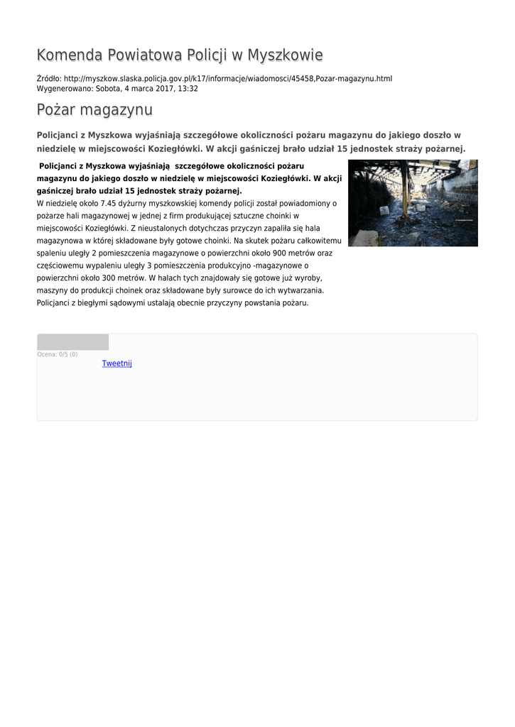 Komenda Powiatowa Policji w Myszkowie Źródło: http://myszkow.slaska.policja.gov.pl/k17/informacje/wiadomosci/45458,Pozar-magazynu.html Wygenerowano: Sobota, 4 marca 2017, 13:32 Pożar magazynu Policjanci z Myszkowa wyjaśniają szczegółowe okoliczności pożaru magazynu do jakiego doszło w niedzielę w miejscowości Koziegłówki. W akcji gaśniczej brało udział 15 jednostek straży pożarnej. Policjanci z Myszkowa wyjaśniają szczegółowe okoliczności pożaru magazynu do jakiego doszło w niedzielę w miejscowości Koziegłówki. W akcji gaśniczej brało udział 15 jednostek straży pożarnej. W niedzielę około 7.45 dyżurny myszkowskiej komendy policji został powiadomiony o pożarze hali magazynowej w jednej z firm produkującej sztuczne choinki w miejscowości Koziegłówki. Z nieustalonych dotychczas przyczyn zapaliła się hala magazynowa w której składowane były gotowe choinki. Na skutek pożaru całkowitemu spaleniu uległy 2 pomieszczenia magazynowe o powierzchni około 900 metrów oraz częściowemu wypaleniu uległy 3 pomieszczenia produkcyjno -magazynowe o powierzchni około 300 metrów. W halach tych znajdowały się gotowe już wyroby, maszyny do produkcji choinek oraz składowane były surowce do ich wytwarzania. Policjanci z biegłymi sądowymi ustalają obecnie przyczyny powstania pożaru. Ocena: 0/5 (0) Tweetnij