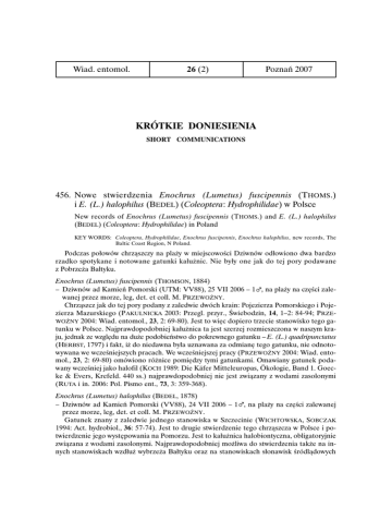 Wiad. entomol. 26 (2) Poznań 2007 KRÓTKIE DONIESIENIA SHORT COMMUNICATIONS 456. Nowe stwierdzenia Enochrus (Lumetus) fuscipennis (T HOMS .) i E. (L.) halophilus (BEDEL) (Coleoptera: Hydrophilidae) w Polsce New records of Enochrus (Lumetus) fuscipennis (THOMS.) and E. (L.) halophilus (BEDEL) (Coleoptera: Hydrophilidae) in Poland KEY WORDS: Coleoptera, Hydrophilidae, Enochrus fuscipennis, Enochrus halophilus, new records, The Baltic Coast Region, N Poland. Podczas połowów chrząszczy na plaży w miejscowości Dziwnów odłowiono dwa bardzo rzadko spotykane i notowane gatunki kałużnic. Nie były one jak do tej pory podawane z Pobrzeża Bałtyku. Enochrus (Lumetus) fuscipennis (THOMSON, 1884) – Dziwnów ad Kamień Pomorski (UTM: VV88), 25 VII 2006 – 1%, na plaży na części zalewanej przez morze, leg, det. et coll. M. PRZEWOŹNY. Chrząszcz jak do tej pory podany z zaledwie dwóch krain: Pojezierza Pomorskiego i Pojezierza Mazurskiego (PAKULNICKA 2003: Przegl. przyr., Świebodzin, 14, 1–2: 84-94; PRZEWOŹNY 2004: Wiad. entomol., 23, 2: 69-80). Jest to więc dopiero trzecie stanowisko tego gatunku w Polsce. Najprawdopodobniej kałużnica ta jest szerzej rozmieszczona w naszym kraju, jednak ze względu na duże podobieństwo do pokrewnego gatunku – E. (L.) quadripunctatus (HERBST, 1797) i fakt, iż do niedawna była uznawana za odmianę tego gatunku, nie odnotowywana we wcześniejszych pracach. We wcześniejszej pracy (PRZEWOŹNY 2004: Wiad. entomol., 23, 2: 69-80) omówiono różnice pomiędzy tymi gatunkami. Omawiany gatunek podawany wcześniej jako halofil (KOCH 1989: Die Käfer Mitteleuropas, Ökologie, Band 1. Goecke & Evers, Krefeld. 440 ss.) najprawdopodobniej nie jest związany z wodami zasolonymi (RUTA i in. 2006: Pol. Pismo ent., 73, 3: 359-368). Enochrus (Lumetus) halophilus (BEDEL, 1878) – Dziwnów ad Kamień Pomorski (VV88), 24 VII 2006 – 1%, na plaży na części zalewanej przez morze, leg, det. et coll. M. PRZEWOŹNY. Gatunek znany z zaledwie jednego stanowiska w Szczecinie (WICHTOWSKA, SOBCZAK 1994: Act. hydrobiol., 36: 57-74). Jest to drugie stwierdzenie tego chrząszcza w Polsce i potwierdzenie jego występowania na Pomorzu. Jest to kałużnica halobiontyczna, obligatoryjnie związana z wodami zasolonymi. Najprawdopodobniej możliwa do stwierdzenia także na innych stanowiskach wzdłuż wybrzeża Bałtyku oraz na stanowiskach słonawisk śródlądowych 122 KRÓTKIE DONIESIENIA w głębi kraju (RUTA i in. 2006: Pol. Pismo ent., 73, 3: 359-368). Chrząszcz należy do trudnej w oznaczaniu grupy gatunków „quadripunctatus” i jest bardzo podobny do pokrewnych gatunków, z tego względu najprawdopodobniej wcześniej nie był odróżniany. Od podobnie ubarwionego E. (L.) ochropterus (MARSH.) różni się wyraźnie obecnością okręgu większych punktów po bokach przedplecza, a od E. (L.) fuscipennis (THOMS.) i E. (L.) quadripunctatus (HERBST) – ubarwieniem głowy, przedplecza i głaszczków szczekowych, które u E. (L.) halophilus są całkowicie jasne, a na głowie zaciemnione jest tylko czoło. W wodach słonawych może także występować E. (L.) bicolor (FABR.), jednak gatunek ten wyróżnia się całkowicie jasnym ubarwieniem ciała oraz odmiennym jego pokrojem, jest też większy. W odróżnieniu od omawianego gatunku, E. (L.) bicolor może także występować w wodach słodkich. Marek PRZEWOŹNY, Zakł. Zool. Syst. UAM, Poznań 457. Nowe stanowiska rzadziej spotykanych Hydrophiloidea i Hydraenidae (Staphylinoidea) w Polsce New records of rare Hydrophiloidea and Hydraenidae (Staphylinoidea) in Poland KEY WORDS: Coleoptera, Hydrochidae, Hydrophilidae, Hydraenidae, new records, Poland. Praca ta ma na celu uzupełnienie danych o pięciu rzadko spotykanych w Polsce przedstawicielach kałużnic i Hydraenidae. Hydrochus megaphallus BERGE HENEGOUWEN, 1988 (Hydrochidae) – Nizina Wielkopolsko-Kujawska: Myszkowo ad Szamotuły (UTM: XU02), 21 VII 2005 – 1%, w napływkach, leg. T. BARŁOŻEK. Chrząszcz znany jak do tej pory tylko z 5 krain i kilku stanowisk, rzadko spotkany, nie odróżniany od pokrewnego Hydrochus brevis (HERBST, 1793), który jest jednym z pospoliciej spotykanych przedstawicieli tej rodziny w Polsce (P RZEWOŹNY i in. 2006: Nowy Pam. fizjogr., 4 (1–2): 23-54). Gatunek nowy dla Niziny Wielkopolsko-Kujawskiej. Crenitis (Crenitis) punctatostriata (LETZNER, 1840) (Hydrophilidae) – Sudety Zachodnie: Szklarska Poręba (WS33), 27 VII 2003 – 1 ex., w kałuży, leg. T. BARŁOŻEK. Gatunek górski, znany z zaledwie 5 krain górskich i podgórskich, rzadko poławiany i wykazywany. Z Sudetów Zachodnich podany ostatnio ponad 80 lat temu (B URAKOWSKI i in. 1976: Kat. Fauny Pol., Warszawa, XXIII, 4: 1-307). Współcześnie podany zaledwie z dwóch stanowisk: w Gorczańskim Parku Narodowym i Tatrach (CHANIECKA 2004: Wiad. entomol., 23 Supl. 2: 127-129; PRZEWOŹNY 2004: Wiad. entomol., 23, 2: 69-80). Berosus (Enoplurus) frontifoveatus KUWERT, 1888 (Hydrophilidae) – Nizina Wielkopolsko-Kujawska: Mokrz ad Wronki (WU84), 17 VIII 2006 – 1%, ad lucem, leg. T. BARŁOŻEK. Jeden z najrzadszych przedstawicieli rodzaju Berosus LEACH w Polsce. Znany zaledwie z 5 krain (PRZEWOŹNY, LUBECKI 2006: Wiad. entomol., 25, 4: 213-217). WIAD. ENTOMOL., 26 (2): POZNAŃ 2007 123 Sphaeridium substriatum FALDERMANN, 1838 (Hydrophilidae) – Nizina Wielkopolsko-Kujawska: Białków ad Koło (CC38), 25 VII 1998 – 1%, dawna żwirownia, leg. M. KAŹMIERCZAK. Najrzadziej spotykany w Polsce przedstawiciel rodzaju Sphaeridium FABR., znany zaledwie z 4 krain na podstawie starych danych pochodzących z lat 30-tych ubiegłego wieku (BURAKOWSKI i in. 1976: ibid.). Od tej pory występowanie w Polsce omawianego chrząszcza nie było potwierdzane. Gatunek ten jest trudny do oznaczenia, jednak różni się wyraźnie w budowie kopulatora od pozostałych polskich przedstawicieli rodzaju – na paramerach występuje charakterystyczne bruzdowanie, którego nie posiadają pozostałe gat