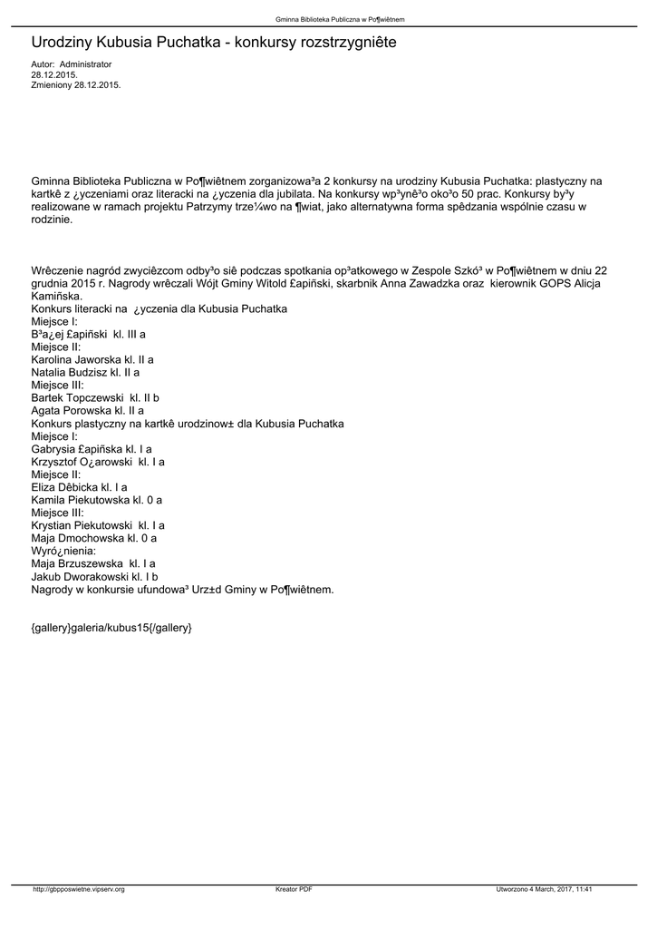 Konkurs literacki na ¿yczenia dla Kubusia Puchatka