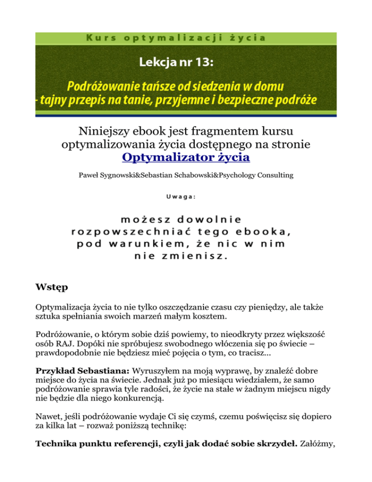 Niniejszy ebook jest fragmentem kursu optymalizowania życia dostępnego na stronie Optymalizator życia Paweł Sygnowski&Sebastian Schabowski&Psychology Consulting Wstęp Optymalizacja życia to nie tylko oszczędzanie czasu czy pieniędzy, ale także sztuka spełniania swoich marzeń małym kosztem. Podróżowanie, o którym sobie dziś powiemy, to nieodkryty przez większość osób RAJ. Dopóki nie spróbujesz swobodnego włóczenia się po świecie – prawdopodobnie nie będziesz mieć pojęcia o tym, co tracisz... Przykład Sebastiana: Wyruszyłem na moją wyprawę, by znaleźć dobre miejsce do życia na świecie. Jednak już po miesiącu wiedziałem, że samo podróżowanie sprawia tyle radości, że życie na stałe w żadnym miejscu nigdy nie będzie dla niego konkurencją. Nawet, jeśli podróżowanie wydaje Ci się czymś, czemu poświęcisz się dopiero za kilka lat – rozważ poniższą technikę: Technika punktu referencji, czyli jak dodać sobie skrzydeł. Załóżmy, że pracujesz od kilku lat i masz odłożone kilkanaście tysięcy złotych. Oto, co możesz zrobić: wybrać się np. na sześciotygodniowe zwiedzanie Ameryki Środkowej. Spełnić podczas swojego pobytu wiele marzeń (surfować, nurkować, uczyć się hiszpańskiego, salsy, jeść lokalne specjały, wylegiwać się na plaży, skoczyć ze spadochronem, czy cokolwiek innego, co chcesz). Oto dwie oczywiste korzyści płynące z tego rozwiązania: • spełnisz wiele swoich marzeń bez czekania, aż przejdziesz na emeryturę czy też osiągniesz niezależność finansową, • naprawdę odpoczniesz – będzie Ci dzięki temu łatwiej pracować, wrócisz z zapałem do pracy, unikniesz wypalenia zawodowego itd. Oto ukryta korzyść: Będziesz posiadać w swoim doświadczeniu punkt referencyjny – coś, do czego możesz wracać w myślach, kiedy jest ciężko, kiedy musisz się zmobilizować do działania, a nie bardzo Ci się chce. Poczuj wtedy po prostu te wszystkie smaki, zapachy, przypomnij sobie dotyk wiatru na skórze i salwy śmiechu w gronie międzynarodowych podróżników. Twój umysł zda sobie sprawę z tego, że jeśli chcesz mieć więcej tych wspaniałych doświadczeń – teraz jest czas, by pracować, teraz jest czas, by siać. Przedstawiliśmy Ci właśnie jedną z najpotężniejszych technik motywacyjnych, która może dodać Ci skrzydeł i bardzo wzmocnić Cię na drodze do Twojego celu. Oczywiście, podobny efekt można uzyskać bez wydawania kilkunastu tysięcy złotych, ale im Twoje doświadczenie z „punktu referencyjnego” będzie bliższe Twojemu wymarzonemu stylowi życia, tym większa będzie motywacja i tym bardziej Twój umysł będzie postrzegał wymarzony styl życia jako coś realnego. Już za chwilę pokażemy Ci między innymi: • jak uzyskać darmowe noclegi we wszystkich krajach świata, • jak podróżować bardzo tanio lub za darmo, • jak skorzystać z bardzo ciekawych międzynarodowych programów, by np. pracować legalnie w USA i nawet ...dostawać pieniądze za podróżowanie :), Cały kurs znajdziesz na stronie Optymalizator życia • jak sprytnie zaplanować podróż, by minimalnym kosztem uzyskać maksymalną satysfakcję, • jak jest naprawdę podczas odkrywczej włóczęgi po świecie, • co zrobić, by było bezpiecznie, • gdzie jeść, skąd brać gotówkę i wiele innych szczegółów, które zapewnią Ci tanią, bezpieczną i satysfakcjonującą podróż. Owocnej lektury! Nieoczywiste nie oczywistości o podróżowaniu Rozprawmy się najpierw z kilkoma mitami: MIT 1: Podróżowanie w pojedynkę oznacza samotność podczas podróży. W większości przypadków jest wręcz przeciwnie – ludzie podróżujący w parach często nie integrują się do tego stopnia z otoczeniem, co samotni podróżnicy, przez co omija ich wiele ciekawych okazji. Czymś - z czego trudno sobie zdać sprawę bez zobaczenia, jak to jest w praktyce - jest fakt błyskawicznego nawiązywania bardzo satysfakcjonujących relacji z innymi podróżnikami czy też uczestnikami jakiejś formy aktywności (dajmy na to kursu salsy). Jest to bardzo ciekawe zjawisko, które powoduje, że po dwóch dniach znajomości wydaje Ci się, że znasz daną osobę od dziesięciu lat... Dzieje się tak między innymi dlatego, że: • jesteście razem w podobnej sytuacji, • jesteście pod wieloma względami podobni do siebie (społeczność podróżników składa się w większości z ludzi wykształconych, znających po kilka języków i mających na swoim koncie wyprawy w naprawdę wiele miejsc na świecie), • macie wolny czas i podobne cele (to prowadzi do częstego podróżowania w grupach nowo poznanych przyjaciół ← fantastyczna sprawa!), • jesteście dla siebie wartościowym źródłem informacji o miejscu, w którym aktualnie przebywacie i innych miejscach z Waszych poprzednich wypraw. Cały kurs znajdziesz na stronie Optymalizator życia Oczywiście, warunkiem łatwej komunikacji z innymi osobami jest znajomość wspólnego języka – standardem, praktycznie wszędzie, jest wśród podróżników angielski. Poprzez spotykanie ludzi z całego świata niesamowicie poszerzysz swoje horyzonty i dowiesz się na przykład o różnych modelach zarabiania, które pozwalają ludziom na podróżowanie – powiedzmy - przez dziewięć miesięcy co roku... Do tego – możesz dalej utrzymywać kontakt z niektórymi poznanymi w podróży osobami, odwiedzać się wzajemnie itd. Kilkumiesięczna podróż może dać Ci znajomych praktycznie na całym świecie. MIT 2: Podróżowanie jest niebezpieczne. Zwykle jest tak, że podróżowanie może być niebezpieczne dla nieostrożnych turystów. Dla podróżników stosujących się do wskazówek zawartych w tej lekcji – jest prawdopodobnie bezpieczniejsze niż siedzenie w domu. Przykład Sebastiana: W Panamie, poza stolicą, czułem się bezpieczniej niż gdziekolwiek w Polsce. Nigdy podczas mojej podróży dookoła świata nikt mnie nie okradł an