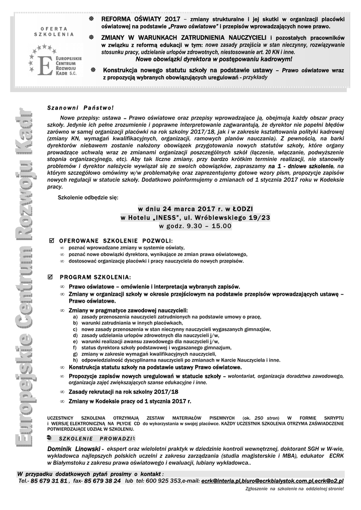 REFORMA OŚWIATY 2017 – zmiany strukturalne i jej skutki w organizacji placówki oświatowej na podstawie „Prawo oświatowe” i przepisów wprowadzających nowe prawo. OFERTA SZKOLENIA ZMIANY W WARUNKACH ZATRUDNIENIA NAUCZYCIELI i pozostałych pracowników w związku z reformą edukacji w tym: nowe zasady przejścia w stan nieczynny, rozwiązywanie stosunku pracy, udzielanie urlopów zdrowotnych, niestosowanie art. 20 KN i inne. Nowe obowiązki dyrektora w postępowaniu kadrowym! Konstrukcja nowego statutu szkoły na podstawie ustawy – Prawo oświatowe wraz z propozycją wybranych obowiązujących uregulowań - przykłady Szanowni Państwo! Nowe przepisy: ustawa – Prawo oświatowe oraz przepisy wprowadzające ją, obejmują każdy obszar pracy szkoły. Jedynie ich pełne zrozumienie i poprawne interpretowanie zagwarantują, że dyrektor nie popełni błędów zarówno w samej organizacji placówki na rok szkolny 2017/18, jak i w zakresie kształtowania polityki kadrowej (zmiany KN, wymagań kwalifikacyjnych, organizacji, ramowych planów nauczania). Z pewnością, na barki dyrektorów niebawem zostanie nałożony obowiązek przygotowania nowych statutów szkoły, które organy prowadzące uchwalą wraz ze zmianami organizacji poszczególnych szkół (łączenie, włączanie, podwyższenie stopnia organizacyjnego, etc). Aby tak liczne zmiany, przy bardzo krótkim terminie realizacji, nie stanowiły problemów i dyrektor należycie wywiązał się ze swoich obowiązków, zapraszamy na 1 - dniowe szkolenie, na którym szczegółowo omówimy w/w problematykę oraz zaprezentujemy gotowe wzory pism, propozycje zapisów nowych regulacji w statucie szkoły. Dodatkowo poinformujemy o zmianach od 1 stycznia 2017 roku w Kodeksie pracy. Szkolenie odbędzie się: w dniu 24 marca 2017 r . w ŁODZI w Hotelu „INESS”, ul. Wróblewski ego 19/23 w godz. 9.30 – 15.00 O FE R O WA NE S Z K OL E NIE P O Z W O LI: • • • poznać wprowadzane zmiany w systemie oświaty, poznać nowe obowiązki dyrektora, wynikające ze zmian prawa oświatowego, dostosować organizację placówki i pracy nauczyciela do nowych przepisów. P R OG R A M S Z K O LE N I A: • Prawo oświatowe – omówienie i interpretacja wybranych zapisów. • Zmiany w organizacji szkoły w okresie przejściowym na podstawie przepisów wprowadzających ustawę – Prawo oświatowe. • Zmiany w pragmatyce zawodowej nauczycieli: a) b) c) d) e) f) g) h) zasady przenoszenia nauczycieli zatrudnionych na podstawie umowy o pracę, warunki zatrudniania w innych placówkach, nowe zasady przenoszenia w stan nieczynny nauczycieli wygaszanych gimnazjów, zasady udzielania urlopów zdrowotnych dla nauczycieli j/w, warunki realizacji awansu zawodowego dla nauczycieli j/w, status dyrektora szkoły podstawowej i wygaszanego gimnazjum, zmiany w zakresie wymagań kwalifikacyjnych nauczycieli, odpowiedzialność dyscyplinarna nauczycieli po zmianach w Karcie Nauczyciela i inne. • Konstrukcja statutu szkoły na podstawie ustawy Prawo oświatowe. • Propozycje zapisów nowych uregulowań w statucie szkoły – wolontariat, organizacja doradztwa zawodowego, organizacja zajęć zwiększających szanse edukacyjne i inne. • Zasady rekrutacji na rok szkolny 2017/18 • Zmiany w Kodeksie pracy od 1 stycznia 2017 r. UCZESTNICY SZKOLENIA OTRZYMAJĄ ZESTAW MATERIAŁÓW PISEMNYCH (ok. 250 stron) W FORMIE SKRYPTU i WERSJĘ ELEKTRONICZNĄ NA PŁYCIE CD do wykorzystania w swojej placówce. KAŻDY UCZESTNIK SZKOLENIA OTRZYMA ZAŚWIADCZENIE POTWIERDZAJĄCE UDZIAŁ W SZKOLENIU. SZKOLENIE P R O W A D Z I ::: Dominik Linowski - ekspert oraz wieloletni praktyk w dziedzinie kontroli wewnętrznej, doktorant SGH w W-wie, wykładowca najlepszych polskich uczelni z zakresu zarządzania (studia magisterskie i MBA), edukator ECRK w Białymstoku z zakresu prawa oświatowego i ewaluacji, lubiany wykładowca.. W przypadku dodatkowych pytań prosimy o kontakt : Tel.- 85 679 31 81 , fax- 85 679 38 24 lub tel: 600 925 353,e-mail: [email protected],[email protected],[email protected] Zgłoszenie na szkolenie na oddzielnej stronie! ZGŁASZAM UDZIAŁ W SZKOLENIU, KTÓRE ODBĘDZIE SIĘ: w dniu 24 marca 2017 r. w ŁODZI w Hotelu „INESS”, ul. Wróblewskiego 19/23 cena szkolenia: 420,00 zł netto / os.* * w przypadku finansowania ze środków publicznych (warunkiem jest podpisanie oświadczenia o źródle finansowania). W pozostałych przypadkach doliczany jest 23% VAT. obejmuje koszt wykładów, materiałów szkoleniowych, przerw kawowych, obiadu Osoby zainteresowane szkoleniem prosimy o wypełnienie poniższego formularza zgłoszenia i odesłanie go : faksem na nr 85 679 38 24 (po wysłaniu prosimy o kontrolny telefon w celu potwierdzenia przyjęcia zgłoszenia) lub pocztą elektroniczną na e-adres : [email protected] , [email protected] , [email protected] O przyjęciu na FORMULARZ szkolenie decyduje kolejność zgłoszeń. Ilość miejsc ograniczona!!! ZGŁOSZENIA : ( prosimy o wypełnienie czarnym długopisem i drukowanymi literami ) nazwa i adres jednostki organizacyjnej - placówki , urzędu pieczątka placówki , urzędu e-mail: ……………………………………………………………… Niniejszym zgłaszamy do udziału w szkoleniu na temat: REFORMA EDUKACJI, które odbędzie się w Łodzi w dniu 24 marca 2017 r. następujące osoby: Lp. Nazwisko i imię uczestnika szkolenia tel. do kontaktu (komórkowy) cena w zł. 1 2 3 Zobowiązujemy się wpłacić w/w kwotę stanowiącą należność za szkolenie (po szkoleniu , na podstawie faktury) na konto ECRK w Białymstoku w banku ALIOR BANK nr : 28 2490 0005 0000 4530 4807 4524 w tytule przelewu umieszczając nazwę płatnika , miejsce i datę szkolenia , w terminie wskazanym na fakturze. Oświadczenie Oświadczam, że w/w szkolenie jest finansowane w 100% ze środków publicznych. ……………………………………………………. (imię i nazwisko osoby składającej oświadczenie) Przyjmuję do wi