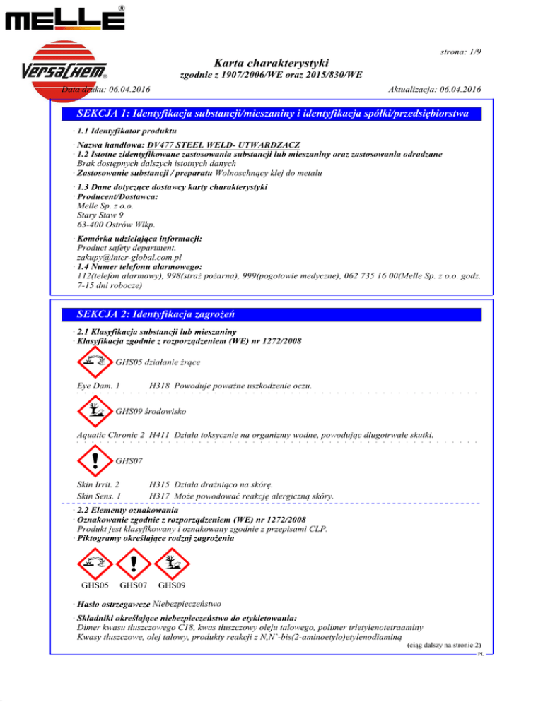 42.2.8 strona: 1/9 Karta charakterystyki zgodnie z 1907/2006/WE oraz 2015/830/WE Data druku: 06.04.2016 Aktualizacja: 06.04.2016 SEKCJA 1: Identyfikacja substancji/mieszaniny i identyfikacja spółki/przedsiębiorstwa · 1.1 Identyfikator produktu · Nazwa handlowa: DV477 STEEL WELD- UTWARDZACZ · 1.2 Istotne zidentyfikowane zastosowania substancji lub mieszaniny oraz zastosowania odradzane Brak dostępnych dalszych istotnych danych · Zastosowanie substancji / preparatu Wolnoschnący klej do metalu · 1.3 Dane dotyczące dostawcy karty charakterystyki · Producent/Dostawca: Melle Sp. z o.o. Stary Staw 9 63-400 Ostrów Wlkp. · Komórka udzielająca informacji: Product safety department. [email protected] · 1.4 Numer telefonu alarmowego: 112(telefon alarmowy), 998(straż pożarna), 999(pogotowie medyczne), 062 735 16 00(Melle Sp. z o.o. godz. 7-15 dni robocze) SEKCJA 2: Identyfikacja zagrożeń · 2.1 Klasyfikacja substancji lub mieszaniny · Klasyfikacja zgodnie z rozporządzeniem (WE) nr 1272/2008 GHS05 działanie żrące Eye Dam. 1 H318 Powoduje poważne uszkodzenie oczu. GHS09 środowisko Aquatic Chronic 2 H411 Działa toksycznie na organizmy wodne, powodując długotrwałe skutki. GHS07 Skin Irrit. 2 Skin Sens. 1 H315 Działa drażniąco na skórę. H317 Może powodować reakcję alergiczną skóry. · 2.2 Elementy oznakowania · Oznakowanie zgodnie z rozporządzeniem (WE) nr 1272/2008 Produkt jest klasyfikowany i oznakowany zgodnie z przepisami CLP. · Piktogramy określające rodzaj zagrożenia GHS05 GHS07 GHS09 · Hasło ostrzegawcze Niebezpieczeństwo · Składniki określające niebezpieczeństwo do etykietowania: Dimer kwasu tłuszczowego C18, kwas tłuszczowy oleju talowego, polimer trietylenotetraaminy Kwasy tłuszczowe, olej talowy, produkty reakcji z N,N`-bis(2-aminoetylo)etylenodiaminą (ciąg dalszy na stronie 2) PL 42.2.8 strona: 2/9 Karta charakterystyki zgodnie z 1907/2006/WE oraz 2015/830/WE Data druku: 06.04.2016 Aktualizacja: 06.04.2016 Nazwa handlowa: DV477 STEEL WELD- UTWARDZACZ (ciąg dalszy od strony 1) 3,6-diazaoktano-1,8-diamina · Zwroty wskazujące rodzaj zagrożenia H315 Działa drażniąco na skórę. H318 Powoduje poważne uszkodzenie oczu. H317 Może powodować reakcję alergiczną skóry. H411 Działa toksycznie na organizmy wodne, powodując długotrwałe skutki. · Zwroty wskazujące środki ostrożności P102 Chronić przed dziećmi. P273 Unikać uwolnienia do środowiska. P264 Dokładnie umyć ręce po użyciu. P271 Stosować wyłącznie na zewnątrz lub w dobrze wentylowanym pomieszczeniu. P305+P351+P338 W PRZYPADKU DOSTANIA SIĘ DO OCZU: Ostrożnie płukać wodą przez kilka minut. Wyjąć soczewki kontaktowe, jeżeli są i można je łatwo usunąć.Nadal płukać. P501 Zawartość/pojemnik usuwać do pojemnika na odpady. · 2.3 Inne zagrożenia · Wyniki oceny właściwości PBT i vPvB · PBT: Nie nadający się do zastosowania. · vPvB: Nie nadający się do zastosowania. SEKCJA 3: Skład/informacja o składnikach · 3.2 Charakterystyka chemiczna: Mieszaniny · Opis: Mieszanka: składająca się z niżej wymienionych składników wraz z bezpiecznymi domieszkami. · Składniki niebezpieczne: CAS: 68082-29-1 Dimer kwasu tłuszczowego C18, kwas tłuszczowy oleju talowego, polimer 25-50% NLP: 500-191-5 trietylenotetraaminy Eye Dam. 1, H318; Aquatic Chronic 2, H411; Skin Irrit. 2, H315; Skin Sens. 1, H317 CAS: 68953-36-6 Kwasy tłuszczowe, olej talowy, produkty reakcji z N,N`-bis(2-aminoetylo) 10-<25% EINECS: 273-201-6 etylenodiaminą Eye Dam. 1, H318; Aquatic Chronic 2, H411 CAS: 90-72-2 2,4,6-tris(dimetyloaminometylo)fenol 2,5-<10% EINECS: 202-013-9 Acute Tox. 4, H302; Skin Irrit. 2, H315; Eye Irrit. 2, H319 CAS: 112-24-3 3,6-diazaoktano-1,8-diamina 1-≤ 2,5% EINECS: 203-950-6 Skin Corr. 1B, H314; Acute Tox. 4, H312; Skin Sens. 1, H317; Aquatic Chronic 3, H412 · Wskazówki dodatkowe: Pełna treść przytoczonych wskazówek dotyczących zagrożeń znajduje się w rozdziale 16. SEKCJA 4: Środki pierwszej pomocy · 4.1 Opis środków pierwszej pomocy · Wskazówki ogólne: Osoby porażone należy wynieść na świeże powietrze. · Po wdychaniu: Dostarczyć obficie świeże powietrze i dla bezpieczeństwa wezwać lekarza. W przypadku utraty przytomności ułożenie i transport w stabilnej pozycji bocznej. · Po styczności ze skórą: Natychmiast zmyć wodą i mydłem i dobrze spłukać. · Po styczności z okiem: Płukać oczy z otwartą powieką przez kilka minut pod bieżącą wodą. · Po przełknięciu: Przy trwałych dolegliwościach porozumieć się z lekarzem. (ciąg dalszy na stronie 3) PL 42.2.8 strona: 3/9 Karta charakterystyki zgodnie z 1907/2006/WE oraz 2015/830/WE Data druku: 06.04.2016 Aktualizacja: 06.04.2016 Nazwa handlowa: DV477 STEEL WELD- UTWARDZACZ (ciąg dalszy od strony 2) · 4.2 Najważniejsze ostre i opóźnione objawy oraz skutki narażenia Brak dostępnych dalszych istotnych danych · 4.3 Wskazania dotyczące wszelkiej natychmiastowej pomocy lekarskiej i szczególnego postępowania z poszkodowanym Brak dostępnych dalszych istotnych danych SEKCJA 5: Postępowanie w przypadku pożaru · 5.1 Środki gaśnicze · Przydatne środki gaśnicze: CO2, proszek gaśniczy lub strumień wody. Większy pożar zwalczać strumieniem wody lub pianą odporną na działanie alkoholu. · 5.2 Szczególne zagrożenia związane z substancją lub mieszaniną Brak dostępnych dalszych istotnych danych · 5.3 Informacje dla straży pożarnej · Specjalne wyposażenie ochronne: Środki specjalne nie są konieczne. · Inne dane Zagrożone zbiorniki ochłodzić strumieniem wody. SEKCJA 6: Postępowanie w przypadku niezamierzonego uwolnienia do środowiska · 6.1 Indywidualne środki ostrożności, sprzęt ochronny i procedury w sytuacjach awaryjnych Nie konieczne. · 6.2 Środki ostrożności w zakresie ochrony środowiska: Nie dopuścić do przeniknięcia do kanalizacji /wód powierzchniowych /wód gruntowych. · 6.3 Metody i materiały zapobiega