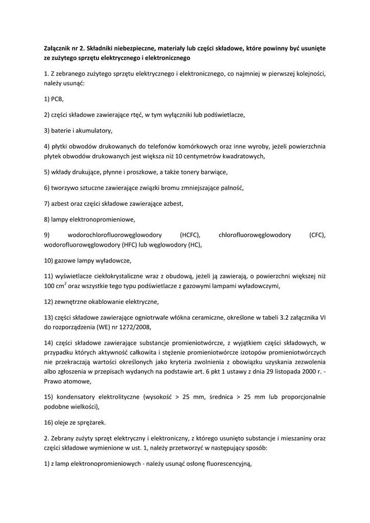 Załącznik nr 2. Składniki niebezpieczne, materiały lub części składowe, które powinny być usunięte ze zużytego sprzętu elektrycznego i elektronicznego 1. Z zebranego zużytego sprzętu elektrycznego i elektronicznego, co najmniej w pierwszej kolejności, należy usunąć: 1) PCB, 2) części składowe zawierające rtęć, w tym wyłączniki lub podświetlacze, 3) baterie i akumulatory, 4) płytki obwodów drukowanych do telefonów komórkowych oraz inne wyroby, jeżeli powierzchnia płytek obwodów drukowanych jest większa niż 10 centymetrów kwadratowych, 5) wkłady drukujące, płynne i proszkowe, a także tonery barwiące, 6) tworzywo sztuczne zawierające związki bromu zmniejszające palność, 7) azbest oraz części składowe zawierające azbest, 8) lampy elektronopromieniowe, 9) wodorochlorofluorowęglowodory (HCFC), wodorofluorowęglowodory (HFC) lub węglowodory (HC), chlorofluorowęglowodory (CFC), 10) gazowe lampy wyładowcze, 11) wyświetlacze ciekłokrystaliczne wraz z obudową, jeżeli ją zawierają, o powierzchni większej niż 100 cm2 oraz wszystkie tego typu podświetlacze z gazowymi lampami wyładowczymi, 12) zewnętrzne okablowanie elektryczne, 13) części składowe zawierające ogniotrwałe włókna ceramiczne, określone w tabeli 3.2 załącznika VI do rozporządzenia (WE) nr 1272/2008, 14) części składowe zawierające substancje promieniotwórcze, z wyjątkiem części składowych, w przypadku których aktywność całkowita i stężenie promieniotwórcze izotopów promieniotwórczych nie przekraczają wartości określonych jako kryteria zwolnienia z obowiązku uzyskania zezwolenia albo zgłoszenia w przepisach wydanych na podstawie art. 6 pkt 1 ustawy z dnia 29 listopada 2000 r. Prawo atomowe, 15) kondensatory elektrolityczne (wysokość > 25 mm, średnica > 25 mm lub proporcjonalnie podobne wielkości), 16) oleje ze sprężarek. 2. Zebrany zużyty sprzęt elektryczny i elektroniczny, z którego usunięto substancje i mieszaniny oraz części składowe wymienione w ust. 1, należy przetworzyć w następujący sposób: 1) z lamp elektronopromieniowych - należy usunąć osłonę fluorescencyjną, 2) z urządzeń zawierających gazy zubożające warstwę ozonową lub mające potencjał powodowania globalnego efektu cieplarnianego (GWP) powyżej 15, w tym gazy znajdujące się w piankach oraz obwodach chłodzących - gazy należy właściwie odessać i odpowiednio je oczyścić, zgodnie z ustawą z dnia 20 kwietnia 2004 r. o substancjach zubożających warstwę ozonową (Dz. U. nr 121, poz. 1263, z późn. zm.), 3) z gazowych lamp wyładowczych - należy usunąć rtęć.