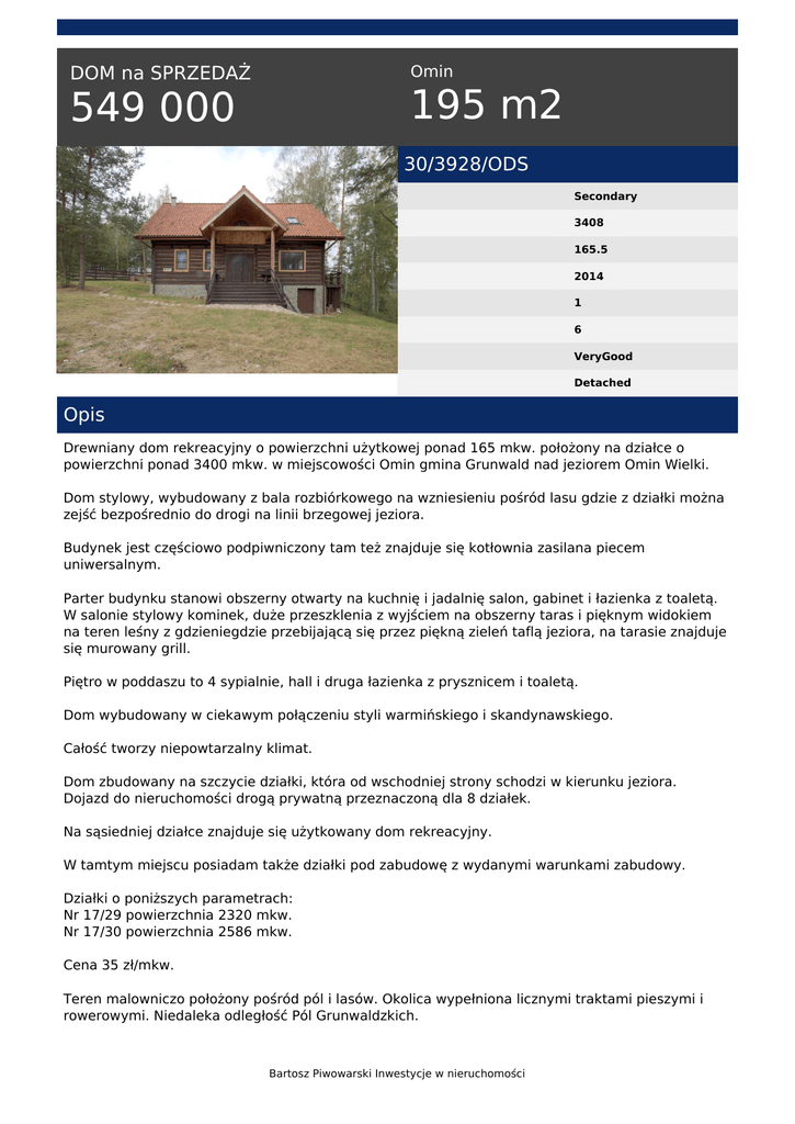 Omin DOM na SPRZEDAŻ 195 m2 549 000 30/3928/ODS Secondary 3408 165.5 2014 1 6 VeryGood Detached Opis Drewniany dom rekreacyjny o powierzchni użytkowej ponad 165 mkw. położony na działce o powierzchni ponad 3400 mkw. w miejscowości Omin gmina Grunwald nad jeziorem Omin Wielki. Dom stylowy, wybudowany z bala rozbiórkowego na wzniesieniu pośród lasu gdzie z działki można zejść bezpośrednio do drogi na linii brzegowej jeziora. Budynek jest częściowo podpiwniczony tam też znajduje się kotłownia zasilana piecem uniwersalnym. Parter budynku stanowi obszerny otwarty na kuchnię i jadalnię salon, gabinet i łazienka z toaletą. W salonie stylowy kominek, duże przeszklenia z wyjściem na obszerny taras i pięknym widokiem na teren leśny z gdzieniegdzie przebijającą się przez piękną zieleń taflą jeziora, na tarasie znajduje się murowany grill. Piętro w poddaszu to 4 sypialnie, hall i druga łazienka z prysznicem i toaletą. Dom wybudowany w ciekawym połączeniu styli warmińskiego i skandynawskiego. Całość tworzy niepowtarzalny klimat. Dom zbudowany na szczycie działki, która od wschodniej strony schodzi w kierunku jeziora. Dojazd do nieruchomości drogą prywatną przeznaczoną dla 8 działek. Na sąsiedniej działce znajduje się użytkowany dom rekreacyjny. W tamtym miejscu posiadam także działki pod zabudowę z wydanymi warunkami zabudowy. Działki o poniższych parametrach: Nr 17/29 powierzchnia 2320 mkw. Nr 17/30 powierzchnia 2586 mkw. Cena 35 zł/mkw. Teren malowniczo położony pośród pól i lasów. Okolica wypełniona licznymi traktami pieszymi i rowerowymi. Niedaleka odległość Pól Grunwaldzkich. Bartosz Piwowarski Inwestycje w nieruchomości Nieruchomości zlokalizowane 6,5 km od drogi krajowej nr 7, około 185 km od Warszawy i około 40 km od Olsztyna. Kilka okolicznych działek już zabudowane stylowymi domami. Teren uzbrojony w energię elektryczną, wodociąg gminny. Dom wyposażony w szambo. Więcej ciekawych ofert na www.bpiwn.pl Nr oferty w biurze 30/3928/ODS Polecam Bartosz Piwowarski Tel. 533 040 200. Kontakt telefoniczny od poniedziałku do piątku w godzinach od 9:00 do 17:00. Pracujemy także w innych godzinach, oraz w weekendy po uzgodnieniu, przynajmniej 3 dni wcześniej. Nie odpowiadamy na zapytania o nieruchomości bez udostępnienia nr kontaktowego. Jeżeli szukacie Państwo nieruchomości na Warmii i Mazurach prosimy o kontakt z naszym agentem. Doradcy współpracujący z naszym biurem pomogą Państwu uzyskać najlepsze warunki kredytowe. Niniejsza oferta nie stanowi oferty w rozumieniu kodeksu cywilnego. Dane w niej zawarte mają charakter informacyjny i mogą ulegać zmianie. Bartosz Piwowarski Inwestycje w nieruchomości tel. 533 040 200 email: [email protected] Bartosz Piwowarski Inwestycje w nieruchomości Powered by TCPDF (www.tcpdf.org)