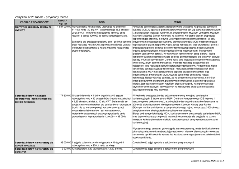 Załącznik nr 2: Tabela - przychody roczne ŹRÓDŁO PRZYCHODÓW Wpływy ze sprzedaży biletów na wystawy Sprzedaż biletów na zajęcia laboratoryjne i rzemieślnicze dla dzieci i młodzieży KWOTA OPIS NETTO 1 887 000,00 Przy założeniu kosztu biletu ulgowego na poziomie 11,10 zł netto (12 zł z VAT) i normalnego 18,5 zł netto 20 zł z VAT i frekwencji na poziomie 150 000 osób rocznie, z czego 120 000 to osoby korzystające z ulg. UWAGI Powyższe ceny biletów zostały zaproponowane wyłacznie na potrzeby symulacji budżetu MCN, w oparciu o poziom porównywalnych cen wg stanu na czerwiec 2016 r. z krakowskich instytucji kultury m.in. uwzględniono: Muzeum Lotnictwa, Muzeum Inżynierii Miejskiej, Zamek Królewski na Wawelu. Nie jest to jednak propozycja odpowiadająca średniej, a jedynie uwiarygodnioone realiami założenie. W celu Założenie dla przyjętego poziomu cen - polityka cenowa przygotowania ostatecznego wariantu planu przychodów MCN niezbędne będzie służy realizacji misji MCN i zapewnia możliwość udziału wypracowanie przez zespół MCN (ew. grupę roboczą ds. jego utworzenia) pełnej i w kulturze oraz kontaktu z nauką możliwie najszerszej drobiazgowej polityki cenowo-biletowo-frekwencyjnej spójnej z oczekiwaniami grupie odbiorców. organu założycielskiego, misją organizacji oraz możliwościami finansowymi (poziom uzyskanych dotacji). W warunkach komercyjnych cenę biletów i liczbę odbiorców działań organizacji wiąże ze sobą punkt przecięcia się krzywych popytu i podaży w funkcji ceny biletów. Centra nauki jako instytucje niekomercyjne kształtują swoje ceny, a tym samym frekwencję, w drodze realizacji swojej misji lub najczęściej jako realizacja polityki społecznej organizatorów. Reasumując, niska cena biletu oznacza wyższą frekwencję i realizację założeń dotyczących skali oddziaływania MCN na społeczeństwo poprzez bezpośredni kontakt jego przedstawicieli z wystawami MCN, wyższa cena może skutkować niższą frekwencją. Należy równiez pamitąć, że na obecnym etapie projektu, na 5-6 lat przed palnowanym otwarciem, przewidywanie frekwencji, a zatem i wpływów z biletów, jest obarczone dużym ryzykiem błędu ze względu na ogromną liczbę czynników zewnętrznych, wpływających na rzeczywistą skalę zainteresowania odwiedzeniem tego typu instytucji. 177 600,00 10 zajęć dziennie x 4 dni w tygodniu x 40 tygodni roboczych w roku x 12 uczestników średnio na zajęciach x 9,25 zł netto za bilet, tj. 10 zł z VAT. Działalność ze swojej natury ma charakter pro publico bono - powyższe środki nie są w stanie pokryć kosztów amortyzacji wyposażenia laboratoriów i sal warsztatowych, materiałów zużywalnych oraz wynagrodzenia osób prowadzących (wynagrodzenie 12 osób = 439 056). W Krakowie występują bardzo zróżnicowane ceny wynajmu powierzchni konferencyjnych. Z jednej strony MLP i Centrum Kongresowego ICE (wysoka i bardzo wysoka półka cenowa), a z drugiej bardzo wygodna sala konferencyjna na 200 osób zlokalizowana w Międzynarodowym Centrum Kultury przy Rynku Głównym na Starym Mieście, z ceną całodniowego najmu wynoszącą 3500 zł wraz z nagłośnieniem, obsługą techniczną i foyer na catering. Biorąc pod uwagę lokalizację MCN, konkurencyjne w tym zakresie sąsiedztwo MLP, oraz dopiero budujący się prestiż instytucji rekomenduje sie przyjecie na uzytek niniejszej kalkulacji możliwie nickich, konkurencyjnych ceny wynajmu powierzchni konferencyjnej. Wynajęcie całego centrum, gdy osiągnie już swoją renomę, może być kalkulowane jako usługa niszowa dla najbardziej prestiżowych klientów biznesowych - wówczas cena może być kilkukrotnie wyższa lub każdorazowa negocjowana w zależności od oczekiwań klienta. Sprzedaż biletów na warsztaty dla dzieci i młodzieży Sprzedaż biletów na warsztaty dla dorosłych 32 000,00 1 zajęcia dziennie x 4 dni w tygodniu x 40 tygodni roboczych w roku x 200 zł netto za klasę 2 928,00 12 warsztatów x 20 uczestników x 12,20 zł netto. Częstotliwość zajęć zgodnie z założeniami programowymi. Częstotliwość zajęć zgodnie z założeniami programowymi. Załącznik 2-przychody_MCN_red str. 1 Program lojalnościowy (bilet roczny, karta przyjaciela MCN dla przedstawicieli krakowskiego biznesu i osób prywatnych/instytucji) Przychody z tytułu wynajmu wystawy mobilnej Czynsze z tytułu najmu Wynajem przestrzeni (sala konferencyjna, całe centrum) na imprezy o charakterze komercyjnym Umowy ze sponsorami Patronat tytularny nad strefami tematycznymi / laboratoriami Darowizny Imprezy na zamówienie (np. urodziny) Przychody z tytułu pikniku 185 130,00 1000 biletów rocznych x 138,88 zł netto (150 zł z VAT) + Możliwe różne inne (autorskie pomysły zespołu MCN) formy mecenatu. 50 złotych kart x 925 zł netto (1000 zł z VAT). 270 000,00 50 wyjazdów do szkół x 3000 zł, 12 wyjazdów na eventy komercyjne x 10 000 zł. 156 000,00 Założenie: uzupełnienie przestrzeni o sklepik z pamiątkami - w dobrze zaplanowanym muzeum/centrum nauki odwiedzający zostawia statystycznie równowartość dodatkowego biletu. Zakładane powierzchnie do wynajęcia: restauracyjna z kuchnią (10 000 zł netto miesięcznie), sklepik (3000 zł netto miesięcznie). Osobno pełen zwrot kosztów zużywanych mediów. 1 wyjazd do szkoły = 3 dni Rozliczenie z tytułu zużywanych przez najemców mediów nie zostało ujęte ani po stronie przychodów, ani wydatków. Założone jest pełne refakturowanie i bilansowanie się kwot. 90 000,00 20 dni x 3000 zł netto (sala konferencyjna) + 2 duże eventy komercyjne rocznie (całe centrum) x 15 000 zł netto 250 000,00 80 000,00 5 000,00 50 000,00 10 000,00 Wynajęcie całego centrum, gdy osiągnie już swoją renomę, może być kalkulowane jako usługa niszowa dla najbardziej prestiżowych klientów biznesowych - wówczas cena może być kilkukrotnie wyższa lub każdorazowa negocjowana w zależności od oczekiwań kli
