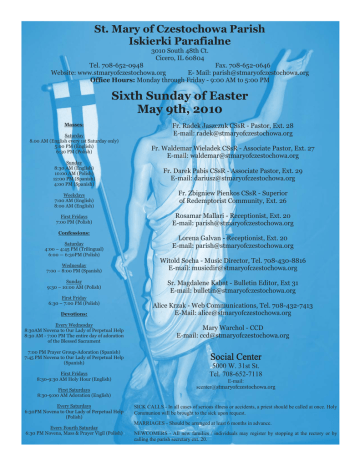 St. Mary of Czestochowa Parish Iskierki Parafialne 3010 South 48th Ct. Cicero, IL 60804 Tel. 708-652-0948 Fax. 708-652-0646 Website: www.stmaryofczestochowa.org E- Mail: [email protected] Office Hours: Monday through Friday - 9:00 AM to 5:00 PM Sixth Sunday of Easter May 9th, 2010 Masses: Saturday 8.00 AM (English every 1st Saturday only) 5:00 PM (English) 6:30 PM (Polish) Sunday 8:30 AM (English) 10:00 AM (Polish) 12:00 PM (Spanish) 4:00 PM (Spanish) Weekdays 7:00 AM (English) 8:00 AM (English) First Fridays 7:00 PM (Polish) Confessions: Saturday 4:00 – 4:45 PM (Trilingual) 6:00 — 6:30PM (Polish) Wednesday 7:00 – 8:00 PM (Spanish) Sunday 9:30 – 10:00 AM (Polish) First Friday 6:30 – 7:00 PM (Polish) Devotions: Every Wednesday 8:30AM Novena to Our Lady of Perpetual Help 8:30 AM - 7:00 PM The entire day of adoration of the Blessed Sacrament 7:00 PM Prayer Group-Adoration (Spanish) 7:45 PM Novena to Our Lady of Perpetual Help (Spanish) First Fridays 8:30-9:30 AM Holy Hour (English) First Saturdays 8:30-9:00 AM Adoration (English) Every Saturdays 6:30PM Novena to Our Lady of Perpetual Help (Polish) Every Fourth Saturday 6:30 PM Novena, Mass & Prayer Vigil (Polish) Fr. Radek Jaszczuk CSsR - Pastor, Ext. 28 E-mail: [email protected] Fr. Waldemar Wieladek CSsR - Associate Pastor, Ext. 27 E-mail: [email protected] Fr. Darek Pabis CSsR - Associate Pastor, Ext. 29 E-mail: [email protected] Fr. Zbigniew Pienkos CSsR - Superior of Redemptorist Community, Ext. 26 Rosamar Mallari - Receptionist, Ext. 20 E-mail: [email protected] Lorena Galvan - Receptionist, Ext. 20 E-mail: [email protected] Witold Socha - Music Director, Tel. 708-430-8816 E-mail: [email protected] Sr. Magdalene Kabat - Bulletin Editor, Ext 31 E-mail: [email protected] Alice Krzak - Web Communications, Tel. 708-432-7413 E-Mail: [email protected] Mary Warchol - CCD E-mail: [email protected] Social Center 5000 W. 31st St. Tel. 708-652-7118 E-mail: [email protected] SICK CALLS - In all cases of serious illness or accidents, a priest should be called at once. Holy Communion will be brought to the sick upon request. MARRIAGES - Should be arranged at least 6 months in advance. NEWCOMERS - All new families / individuals may register by stopping at the rectory or by calling the parish secretary ext. 20. Sunday May 9, Sixth Sunday of Easter 8:30 For all Mothers- living and deceased 9:30 Litania do Matki Bożej 10:00 Za wszystkie Matki żyjące i zmarłe 12:00 Por todas las Madres vivas y muertas 4:00 Por todas las Madres vivas y muertas Iskierki Parafialne †Lucille Patula (Gert Michaels) 10:00 O Boże bł. dla Ojca Zbigniewa Pieńkos z okazji urodzin †Filomena i Zygmunt Staniszewscy †Halina I Stanley Czykier (Arthur Czykier) †Edward Ptak †Maria Kisielewska †Stanley Wdowiak (wife, Helen) 12:00 †Guadalupe Suarez (Maria Castro †Maria Mendoza (Santiago Daniel) †Luis Daniel (Santiago Daniel) 4:00 Por los feligreses May 10, Monday, Blessed Damien Joseph de Veuster of Moloka’i, priest 7:00 †Darlene Burke (mother) 8:00 †Martin Krolak (family) May 11 Tuesday, Easter Weekday 7:00 †Edward & Nan Ryska 8:00 †Walter Miarecki (Miarecki family) May 12, Wednesday, Sts. Nereus, Achilleus and Pancras, martyrs 7:00 For the recovery of John Walkowiak (family) 8:00 †Richard Pusateri 8:30 Novena: Our Lady of Perpetual/Adoration 7PM El Circulo de Oración 7:45 Novena a Nuestra Señora del Perpetuo Socorro May 13, Thursday, Our Lady of Fatima 7:00 Health for Edward Knight (Sophie Walkowiak) 8:00 †Floyd Nowaczyk (5th anniversary) May 14, Friday, St. Mathias, apostle 7:00 †Parishioners 8:00 †Floyd Nowaczyk (5th anniversary) May 15, Saturday, Easter Weekday 1:00 Quinceañera: Yajaira Solis 3:00 Wedding: Lauren Bartkowski & Kristopher Sustch 5PM †Helen Natonski (son, Lawry) †Helen Skowron (Frances & Clara Zima) †Deceased members of the John Jacobs family 6:30 Za Parafian May 16, Sunday, Ascension of the Lord 8:30 †Catherine Stack (Patrick Weglarz, nephew) Lector Schedule Saturday, May 15, 5 PM Sr. Magdalene, Marie Jarding Sunday, May 16 8:30 John Kociolko 10:00 Alicja Krzak, Andrzej Szudziński 12:00 Roberto Pasillas, Linda Ramirez Miriam Campagne, Esteban Talavera 4:00 Los Niños Eucharistic Ministers Saturday, May 15 5PM Joanne Napoletano, Georgia Czarnecki Sunday, May 16 8:30 Christie Zaragoza, Ed Hennessy, Myra Rodriguez 10:00 Waldemar Lipka 12:00 Ma. Cruz Rodriguez, Juana Salas, Javie Hernandez 4PM Marisol Ortiz, Griselda Avitia WEDDING BANNS There is a promise of marriage between…………….. III. I. Lauren Bartkowski & Kristopher Sustch Marisa Castaneda & Alberto Miranda St. Mary of Czestochowa Sunday Collection May 2, 2010 During the month of May, it is customary to participate in the May Crowning of an image of the Blessed Virgin Mary. We will crown the statue of Our Lady of Fatima before the 5PM and the 8:30 AM Masses this Mothers’ Day weekend. The image of the Blessed Virgin Mary reminds us of the close ties of Mary to Christ and His Church. Today we also celebrate MOTHERS’ DAY and we honor all of our earthly Mothers in a special way. May our Blessed Mother shower upon each of our Mothers her special graces. May she always be our queen and mother and hold a special place in our hearts. Happy Mothers’ day to all Mothers! An Indoor and Outdoor Flea Market is being planned to be held on the Social Center grounds (outside) and also in the building. Please reserve these dates: Saturday, June 12 and Sunday June 13, 2010. The Flea Market will begin at 8:00 A.M. and end at 6:00 P.M. Spaces will be available at the following prices: ► One day sale: $20 ► Two day sale:$35 for the space plus $5 for each table if needed-Indoors only. ► Sellers (outside) may bring their own tables and tents. To reserve spaces & tables call the rectory at 708-652-0948 during office hours: 9AM to 5PM. Payment is due no later than Tuesday, June 1, 2010 by 5PM. All of our registered parishioners should have received in the ma