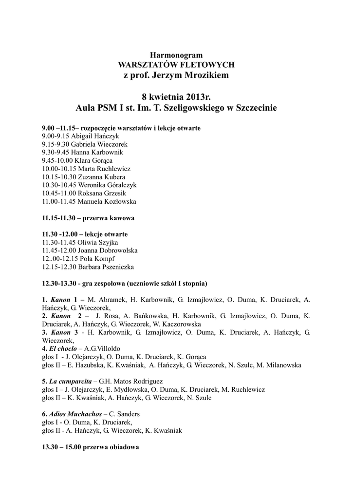 Harmonogram WARSZTATÓW FLETOWYCH z prof. Jerzym Mrozikiem 8 kwietnia 2013r. Aula PSM I st. Im. T. Szeligowskiego w Szczecinie 9.00 –11.15– rozpoczęcie warsztatów i lekcje otwarte 9.00-9.15 Abigail Hańczyk 9.15-9.30 Gabriela Wieczorek 9.30-9.45 Hanna Karbownik 9.45-10.00 Klara Gorąca 10.00-10.15 Marta Ruchlewicz 10.15-10.30 Zuzanna Kubera 10.30-10.45 Weronika Góralczyk 10.45-11.00 Roksana Grzesik 11.00-11.45 Manuela Kozłowska 11.15-11.30 – przerwa kawowa 11.30 -12.00 – lekcje otwarte 11.30-11.45 Oliwia Szyjka 11.45-12.00 Joanna Dobrowolska 12..00-12.15 Pola Kompf 12.15-12.30 Barbara Pszeniczka 12.30-13.30 - gra zespołowa (uczniowie szkół I stopnia) 1. Kanon 1 – M. Abramek, H. Karbownik, G. Izmajłowicz, O. Duma, K. Druciarek, A. Hańczyk, G. Wieczorek, 2. Kanon 2 – J. Rosa, A. Bańkowska, H. Karbownik, G. Izmajłowicz, O. Duma, K. Druciarek, A. Hańczyk, G. Wieczorek, W. Kaczorowska 3. Kanon 3 - H. Karbownik, G. Izmajłowicz, O. Duma, K. Druciarek, A. Hańczyk, G. Wieczorek, 4. El choclo – A.G.Villoldo głos I - J. Olejarczyk, O. Duma, K. Druciarek, K. Gorąca głos II – E. Hazubska, K. Kwaśniak, A. Hańczyk, G. Wieczorek, N. Szulc, M. Milanowska 5. La cumparcita – G.H. Matos Rodriguez głos I – J. Olejarczyk, E. Mydłowska, O. Duma, K. Druciarek, M. Ruchlewicz głos II – K. Kwaśniak, A. Hańczyk, G. Wieczorek, N. Szulc 6. Adios Muchachos – C. Sanders głos I - O. Duma, K. Druciarek, głos II - A. Hańczyk, G. Wieczorek, K. Kwaśniak 13.30 – 15.00 przerwa obiadowa 15.00 – 16.30– wykład dla uczniów, nauczycieli i rodziców na temat: Solidne podstawy gry na flecie – fundamentem do prawidłowego rozwoju flecisty 16.30 –17.30 – gra zespołowa (uczniowie szkół II stopnia) 1. Old hungarian dances – F. Farcas głos I - Roksana Grzesik, Oliwia Szyjka głos II – Manuela Kozłowska 2. Paraphrasen uber ein eigenes Threma – E. Kronke głos I – Weronika Góralczyk, Barbara Pszeniczka, Roksana Grzesik, Joanna Dobrowolska głos II – Aleksandra Kamieńska, Joanna Dobrowolska, Oliwia Szyjka, Weronika Gralczyk głos III – Pola Komp., Manuela Kozłowska, Ewa Bagdzińska głos IV – Adam Zamróz, Alicja Świątek 3. Lot trzmiela – N. Rimski-Korsakow głos I – Weronika Góralczyk, Roksana Grzesik, Oliwia Szyjka, Joanna Dobrowolska głos II – Joanna Dobrowolska, Weronika Gralczyk głos III – Manuela Kozłowska, Ewa Bagdzińska, Alicja Świątek 17.30 - zakończenie warsztatów