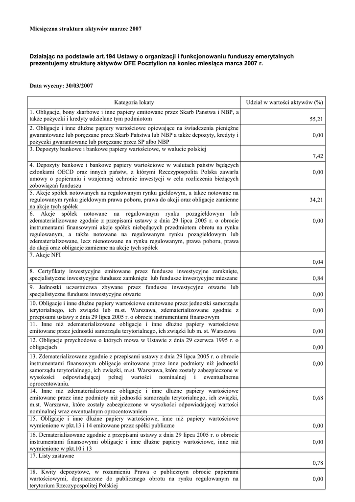 Miesięczna struktura aktywów marzec 2007 Działając na podstawie art.194 Ustawy o organizacji i funkcjonowaniu funduszy emerytalnych prezentujemy strukturę aktywów OFE Pocztylion na koniec miesiąca marca 2007 r. Data wyceny: 30/03/2007 Kategoria lokaty 1. Obligacje, bony skarbowe i inne papiery emitowane przez Skarb Państwa i NBP, a także pożyczki i kredyty udzielane tym podmiotom 2. Obligacje i inne dłużne papiery wartościowe opiewające na świadczenia pieniężne gwarantowane lub poręczane przez Skarb Państwa lub NBP a także depozyty, kredyty i pożyczki gwarantowane lub poręczane przez SP albo NBP 3. Depozyty bankowe i bankowe papiery wartościowe, w walucie polskiej Udział w wartości aktywów (%) 55,21 0,00 7,42 4. Depozyty bankowe i bankowe papiery wartościowe w walutach państw będących członkami OECD oraz innych państw, z którymi Rzeczypospolita Polska zawarła umowy o popieraniu i wzajemnej ochronie inwestycji w celu rozliczenia bieżących zobowiązań funduszu 5. Akcje spółek notowanych na regulowanym rynku giełdowym, a także notowane na regulowanym rynku giełdowym prawa poboru, prawa do akcji oraz obligacje zamienne na akcje tych spółek 6. Akcje spółek notowane na regulowanym rynku pozagiełdowym lub zdematerializowane zgodnie z przepisami ustawy z dnia 29 lipca 2005 r. o obrocie instrumentami finansowymi akcje spółek niebędących przedmiotem obrotu na rynku regulowanym, a także notowane na regulowanym rynku pozagiełdowym lub zdematerializowane, lecz nienotowane na rynku regulowanym, prawa poboru, prawa do akcji oraz obligacje zamienne na akcje tych spółek 7. Akcje NFI 0,00 34,21 0,00 0,04 8. Certyfikaty inwestycyjne emitowane przez fundusze inwestycyjne zamknięte, specjalistyczne inwestycyjne fundusze zamknięte lub fundusze inwestycyjne mieszane 0,84 9. Jednostki uczestnictwa zbywane przez fundusze inwestycyjne otwarte lub specjalistyczne fundusze inwestycyjne otwarte 0,00 10. Obligacje i inne dłużne papiery wartościowe emitowane przez jednostki samorządu terytorialnego, ich związki lub m.st. Warszawa, zdematerializowane zgodnie z przepisami ustawy z dnia 29 lipca 2005 r. o obrocie instrumentami finansowym 11. Inne niż zdematerializowane obligacje i inne dłużne papiery wartościowe emitowane przez jednostki samorządu terytorialnego, ich związki lub m. st. Warszawa 12. Obligacje przychodowe o których mowa w Ustawie z dnia 29 czerwca 1995 r. o obligacjach 13. Zdematerializowane zgodnie z przepisami ustawy z dnia 29 lipca 2005 r. o obrocie instrumentami finansowym obligacje emitowane przez inne podmioty niż jednostki samorządu terytorialnego, ich związki, m.st. Warszawa, które zostały zabezpieczone w wysokości odpowiadającej pełnej wartości nominalnej i ewentualnemu oprocentowaniu. 14. Inne niż zdematerializowane obligacje i inne dłużne papiery wartościowe emitowane przez inne podmioty niż jednostki samorządu terytorialnego, ich związki, m.st. Warszawa, które zostały zabezpieczone w wysokości odpowiadającej wartości nominalnej wraz ewentualnym oprocentowaniem 15. Obligacje i inne dłużne papiery wartościowe, inne niż papiery wartościowe wymienione w pkt.13 i 14 emitowane przez spółki publiczne 16. Dematerializowane zgodnie z przepisami ustawy z dnia 29 lipca 2005 r. o obrocie instrumentami finansowymi obligacje i inne dłużne papiery wartościowe, inne niż wymienione w pkt.10 i 13 17. Listy zastawne 0,00 0,00 0,00 0,00 0,68 0,00 0,00 0,78 18. Kwity depozytowe, w rozumieniu Prawa o publicznym obrocie papierami wartościowymi, dopuszczone do publicznego obrotu na rynku regulowanym na terytorium Rzeczypospolitej Polskiej 0,00 19. Środki pieniężne 0,74 20. Należności i inne 0,08 Monika Czapska Główny Księgowy Funduszu