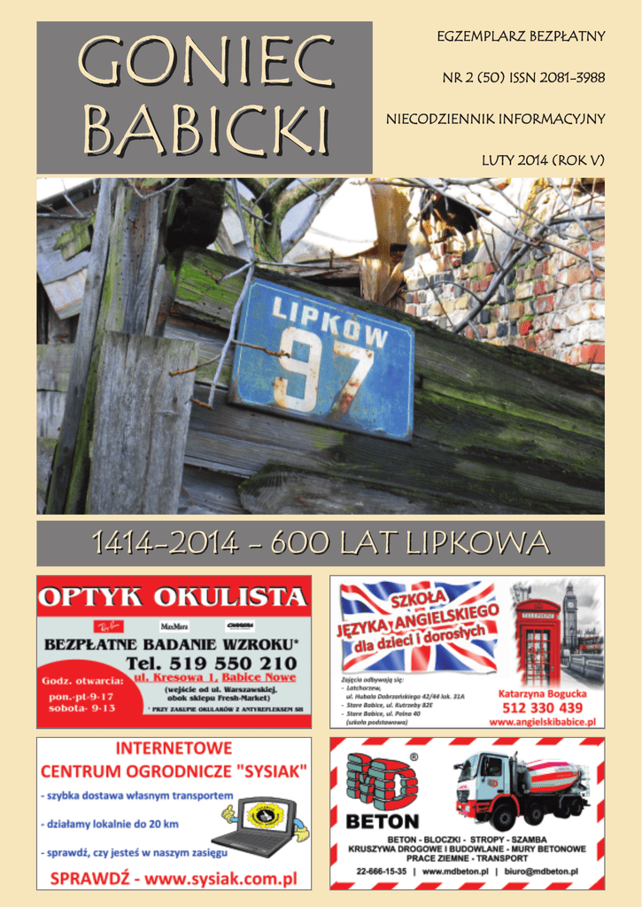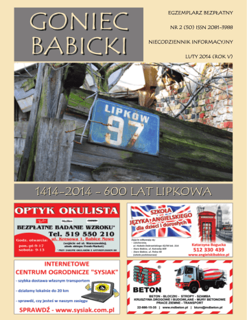 Adres wydawcy (redakcji): PUNKT REDAKCYJNY: Księgarnia "VERBUM" - Stare Babice, ul. Rynek 17 Redaguje Zespół w składzie: Michał Starnowski Dariusz Smoliński,Tomasz Szuba Piotr Dąbrowski Autor zdjęcia na okładce: fot. Michał Starnowski ZGŁOSZENIA REKLAMOWE I OGŁOSZENIOWE: tel. 796-920-796; 796-020;796 lub [email protected] lub [email protected] Skład: FIRESTARMEDIA; Konto: mbank Druk: NOWY SALON FRYZJERSKO-KOSMETYCZNY Wśród wielu zawodów świata, które nigdy nie przestaną być potrzebne wymienia się fryzjera. Zawód ten wymaga stałego samokształcenia i niebywałych kwalifikacji zawodowych, a wszystko po to, by wykonywane fryzury były zawsze modne, oryginalne i atrakcyjne dla każdej płci. W dzisiejszych czasach niezwykle ważna stała się też atrakcyjność fizyczna, Nie dziwi zatem fakt, że dbałość o zdrowie i urodę rozpoczyna się już w okresie młodości, kontynuowane jest w wieku dojrzałym i dalej - aż po wiek emerytalny. Z początkiem marca bieżącego roku, niemalże na obrzeżach Starych Babic podwoje swe otwiera nowy Salon Fryzjersko-Kosmetyczny. Pani Iwona - właścicielka Salonu, zaprasza na ul. Koczarską 55. Oprócz fryzjerstwa: damskiego, męskiego i dziecięcego w Salonie wykonywane będą również zabiegi kosmetyczne. Jedną z proponowanych metod będzie kącik zabaw Salon wyposażony będzie również w specjalistyczny, dziecięcy fotelik fryzjerski. Tzw. przecięcie wstęgi nastąpi 8 marca br., czyli w Dzień Kobiet. MARY KAY - nawet do 20%. Zapraszamy zatem do salonu, który na start z automatu otrzymał dwie piątki (Koczarska 55). Przyjedź, zadzwoń, skorzystaj z oferty, Michał Starnowski KSIĘGARNIA "VERBUM" POLECA... KSIĄŻKI DLA DOROSŁYCH I DLA DZIECI Ferie, to idealny czas, by zaproponować coś naszym milusińskim. Pozycja, którą wybraliśmy cały czas utrzymuje się na liście bestsellerów, choć od premiery w listopadzie 2013r. trochę czasu już minęło. Wraz z autorką - Agnieszką Chylińską zapraszamy czytelników do świata Zezi, Gilera i…Oczaka. Na okładce książki czytamy: "Zupełnie nowe przygody Zezi, nowi przyjaciele i nowy dom. W rodzinie Zezików duża zmiana. Pojawia się trzecie dziecko! Zezia Zezik, już trochę starsza, obserwuje swoimi dziecięcymi oczami dobrze nam znany świat i oczarowuje spostrzeżeniami. Opowieść o ciepłej i dobrej rodzinie - niby zwyczajna, a jednak niezwykle głęboka. Mądra, wzruszająca i zabawna. Dla dzieci i dorosłych." Dodatkową zachętą niech będzie krótki fragment książki: "…"Babcia Ciemnowłosa zawsze powtarzała, że co się odwlecze, to nie uciecze. Słowo "uciecze" dawało Zezi szczególnie do myślenia, szczególnie że nie rozumiała, co ono oznacza. A chodziło o to, że jeśli jakaś sprawa, na przykład klasówka z matematyki, nie odbędzie się z powodu choroby Pani Nauczycielki, to przecież wiadomo, że gdy tylko Pani Nauczycielka wyzdrowieje, od razu przypomni sobie o klasówce i na pewno w końcu do niej dojdzie. Dlatego, gdy pewnego łikendu znowu powrócił temat Pana Darka, Zezia wiedziała, że to NIE UCIECZE. Była piękna, upalna sobota. Zezia powoli przygotowywała się do końca roku szkolnego i zastanawiała się, co tym razem będzie robić w wakacje. Dzień zapowiadał się spokojnie. Tata planował siedzenie przy komputerze, ale wyjął ogrodowe krzesła i usiadł na jednym z nich przed domem. Giler kopał w ziemi, a Oczak drzemał w wózku obok Taty. Pogoda była piękna i Zezia zastanawiała się, z kim z sąsiedztwa spędzić ten dzień, gdy nagle z domu wyszła Mama w pięknej sukience i zawołała do Taty: "Darek z pracy zaprasza nas na grilla, pamiętasz? Szykuj się."…" Dorosłym zaś, w wolnych chwilach w czasie "wiosennych ferii zimowych ;-)" proponujemy sięgnąć do wydanych ostatnio notatek osobistych z lat 1962-2003 Papieża Jana Pawła II, Z okazji zbliżającego się Dnia Kobiet, wszystkim paniom przesyłamy najserdeczniejsze życzenia…a panów zapraszamy do odwiedzin księgarni i zakupu kart okolicznościowych oraz drobnych upominków dla płci pięknej. Może książki…?? Dariusz Smoliński & Tomasz Szuba NAPISALI DO NAS Do naszej redakcji, a konkretnie do mnie Redaktora Naczelnego Gońca Babickiego, napisał Pan Marcin Łada - Redaktor Naczelny Ga zety Babickiej: Wójt nie zapomniał - prośba o sprostowanie. Zwracam się do Pana, jako autora artykułu "Nowy Maszt, Fatalne Przeoczenie" z prośbą o zamieszczenie sprostowania dotyczącego tekstu, cyt. "Wójt, przygotowując uroczystość, zapomniał o najważniejszej rzeczy. Zapraszając wielu wielkich, w tym Prezydenta R.P., zapomniał zaprosić człowieka najważniejszego. Wójt Gminy Stare Babice Krzysztof Turek zapomniał wystosować zapro szenie do Pana Ireneusza Dobiecha - odkrywcy ele mentu". Chcę poinformować, że jest to nieprawda, Wójt przygotowując listę gości, w pierwszej kolejności ustalał grupę osób, które były zaangażowane w tę sprawę. Na niej widniało nazwisko Pana Ireneusza Dobiecha. Mogę to z całą odpowiedzialnością zaświadczyć, gdyż konsultowałem to z Wójtem. Także pracownicy Referatu Rozwoju i Promocji Gminy potwierdzają wysłanie zaproszenia. Wójt poprosił mnie o dodatkowe zaproszenie w jego imieniu wielu ważnych osób, w tym Pana Dobiecha, ponieważ Poczta Polska czasami zawodzi, i ja to uczyniłem. Poza tym, pisząc, cyt.: "zapomniał zaprosić człowieka najważniejszego", sugeruje Pan, że tylko p. Ireneusz Dobiech był zasłużony dla tej sprawy. Potwierdzam, że rzeczywiście od Pana Do biecha sprawa tablicy pamiątkowej się zaczęła. To on natknął się na stalowy element stopy masztu w lesie i telefonicznie poinformował o tym Wójta. W upamiętnienie Radiostacji już wcześniej zaangażowało się jednak wiele osób, wiele z nich poświęciło bardzo dużo czasu tej sprawie, jak np. Pan Dariusz Śladowski, który odkrył i udokumentował znaczną ilość innych elementów Radiostacji w Lesie Be