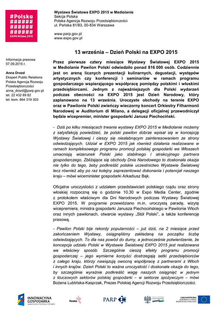 Wystawa Światowa EXPO 2015 w Mediolanie Sekcja Polska Polska Agencja Rozwoju Przedsiębiorczości ul. Pańska 81/83, 00-834 Warszawa www.parp.gov.pl www.expo.gov.pl 13 września – Dzień Polski na EXPO 2015 Informacja prasowa 07.09.2015 r. Anna Drozd Ekspert Public Relations Polska Agencja Rozwoju Przedsiębiorczości [email protected] tel. 22 432 89 82 tel. kom. 664 319 303 Przez pierwsze cztery miesiące Wystawy Światowej EXPO 2015 w Mediolanie Pawilon Polski odwiedziło ponad 816 000 osób. Codziennie jest on areną licznych prezentacji kulinarnych, degustacji, występów artystycznych czy konferencji i seminariów w ramach programu gospodarczego wspierającego współpracę pomiędzy polskimi i włoskimi przedsiębiorcami. Jednym z najważniejszych dla Polski wydarzeń podczas obecności na EXPO 2015 jest Dzień Narodowy, który zaplanowano na 13 września. Uroczyste obchody na terenie EXPO oraz w Pawilonie Polski zwieńczy wieczorny koncert Orkiestry Filharmonii Narodowej w Auditorium di Milano, a delegacji oficjalnej przewodniczył będzie wicepremier, minister gospodarki Janusz Piechociński. - Dziś po kilku miesiącach trwania wystawy EXPO 2015 w Mediolanie możemy z satysfakcją powiedzieć, że polski pawilon dobrze wpisał się w koncepcję Wystawy Światowej i cieszy się niesłabnącym zainteresowaniem ze strony odwiedzających. Udział w EXPO 2015 jak również działania realizowane w ramach kompleksowego programu promocji polskiej gospodarki we Włoszech umacniają wizerunek Polski jako stabilnego i atrakcyjnego partnera gospodarczego. Zbliżające się obchody Dnia Narodowego to doskonała okazja nie tylko do tego, żeby podkreślić polskie uczestnictwo Wystawie Światowej lecz również aby po raz kolejny zaprezentować dokonania i potencjał naszego kraju – mówi wiceminister gospodarki Arkadiusz Bąk. Oficjalne uroczystości z udziałem przedstawicieli polskiego rządu oraz strony włoskiej rozpoczną się o godzinie 10.30 w Expo Media Center, zgodnie z protokołem właściwym dla Dni Narodowych podczas Wystawy Światowej EXPO 2015. W programie przewidziano m.in. uroczystą paradę, wizytę wicepremiera, ministra gospodarki Janusza Piechocińskiego w Pawilonie Włoch oraz innych pawilonach, otwarcie wystawy „Stół Polski”, a także konferencję prasową. - Pawilon Polski bije rekordy popularności – już dziś, na 2 miesiące przed zakończeniem Wystawy, osiągnęliśmy zakładaną na początku liczbę odwiedzających. To dla nas powód do dumy, a jednocześnie potwierdzenie, że koncepcja udziału Polski w Wystawie Światowej EXPO 2015 jest realizowana we właściwy sposób. Szczególnie cieszą efekty programu promocji gospodarczej – jego wymierne korzyści dostrzegają setki przedsiębiorców z całego kraju, którzy nawiązują owocną współpracę z partnerami z Włoch i innych krajów. Dzień Polski to ważna uroczystość i doskonała okazja do tego, by szczególnie wyraźnie podkreślić wagę naszych osiągnięć w jednym z kluczowych sektorów polskiej gospodarki – w sektorze spożywczym – mówi Bożena Lublińska-Kasprzak, Prezes Polskiej Agencji Rozwoju Przedsiębiorczości. 1 Informacja prasowa 07.09.2015 r. Anna Drozd Ekspert Public Relations Polska Agencja Rozwoju Przedsiębiorczości [email protected] tel. 22 432 89 82 tel. kom. 664 319 303 Dzień Polski obfitował będzie również w atrakcje, które od rana do wieczora czekać będą na gości Pawilonu Polski. Będą wśród nich m.in. występy kuglarzy, a także animatorów zabaw dziecięcych. Wizytę w Pawilonie Polski uświetnią polscy artyści, którzy na scenie przed budynkiem przez cały dzień prezentować będą bogaty program muzyczny. Tego dnia odbędą się także prezentacje tradycyjnej polskiej kuchni w wykonaniu kucharzy Garnizonu Warszawa oraz występy artystyczne Orkiestry Reprezentacyjnej Wojska Polskiego. Z kolei wieczorem plac przed Pawilonem Polski wypełni się uczestnikami zabawy tanecznej, podczas której królować będą polskie i włoskie szlagiery z lat 60. i 70., znane z festiwali w San Remo i w Opolu. Zwieńczeniem oficjalnych obchodów Dnia Polski będzie koncert galowy Orkiestry Warszawskiej Filharmonii Narodowej pod dyrekcją Jacka Kaspszyka i pianisty Andrzeja Wiercińskiego na jednej z najsłynniejszych mediolańskich scen muzycznych – Auditorium di Milano. W programie przewidziano koncert fortepianowy e-moll op. 11 Fryderyka Chopina, a także Symfonię „Tansman Epizody” op. 85 na orkiestrę i fortepian i organy obbligato. Będzie to premiera wykonania tego utworu we Włoszech. Wrzesień na EXPO 2015 Tydzień Województwa Świętokrzyskiego Od 7 września Pawilon Polski stanie się areną prezentacji Województwa Świętokrzyskiego, które obecne będzie na EXPO przez cały tydzień. Poza wystawą regionalnych produktów, takich jak krzemień pasiasty, szkło Wrześniaka czy doceniana na całym świecie porcelana z Ćmielowa, zaprezentowane zostaną możliwości biznesowe w oparciu o dwa kluczowe sektory regionu: nowoczesne rolnictwo i przetwórstwo spożywcze a także turystykę zdrowotną i prozdrowotną. 8 września w godzinach 11:00-13:00 odbędzie się konferencja pn. „Sektor spożywczy filarem gospodarki Regionu Świętokrzyskiego”, podczas której zaprezentowane zostaną możliwość produkcyjne i eksportowe świętokrzyskich producentów owoców, warzyw, wyrobów wędliniarskich i nabiału oraz produktów liofilizowanych, ziół i herbat. Natomiast 10 września o godz. 12:30 odbędzie się spotkanie matchmakingowe w formie lunchu, podczas którego zaprezentowane zostaną walory świętokrzyskich obiektów SPA&Wellness. Podczas trwania tygodnia regionalnego będzie można spróbować doskonałych świętokrzyskich jabłek, sera i wyrobów wędliniarskich, oraz przygotowywanych na oczach zwiedzających koktajli z owoców liofilizowanych oraz herbatek z dodatkiem regionalnych ziół i owoców. Do odwiedzenia polskiego pawilonu b