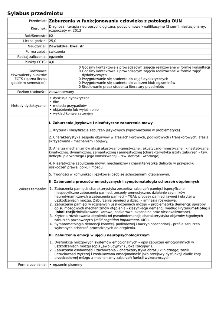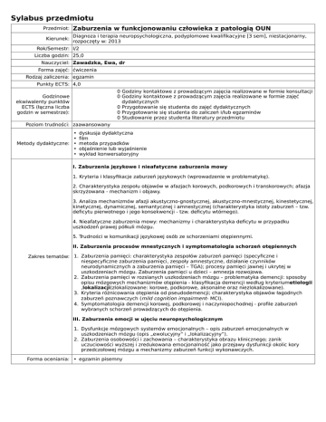 Sylabus przedmiotu Przedmiot: Zaburzenia w funkcjonowaniu człowieka z patologią OUN Diagnoza i terapia neuropsychologiczna, podyplomowe kwalifikacyjne [3 sem], niestacjonarny, Kierunek: rozpoczęty w: 2013 Rok/Semestr: I/2 Liczba godzin: 25,0 Nauczyciel: Zawadzka, Ewa, dr Forma zajęć: ćwiczenia Rodzaj zaliczenia: egzamin Punkty ECTS: 4,0 0 Godziny kontaktowe z prowadzącym zajęcia realizowane w formie konsultacji 0 Godziny kontaktowe z prowadzącym zajęcia realizowane w formie zajęć dydaktycznych 0 Przygotowanie się studenta do zajęć dydaktycznych 0 Przygotowanie się studenta do zaliczeń i/lub egzaminów 0 Studiowanie przez studenta literatury przedmiotu Godzinowe ekwiwalenty punktów ECTS (łączna liczba godzin w semestrze): Poziom trudności: zaawansowany • • Metody dydaktyczne: • • • dyskusja dydaktyczna film metoda przypadków objaśnienie lub wyjaśnienie wykład konwersatoryjny I. Zaburzenia językowe i nieafatyczne zaburzenia mowy 1. Kryteria i klasyfikacje zaburzeń językowych (wprowadzenie w problematykę). 2. Charakterystyka zespołu objawów w afazjach korowych, podkorowych i transkorowych; afazja skrzyżowana - mechanizm i objawy. 3. Analiza mechanizmów afazji akustyczno-gnostycznej, akustyczno-mnestycznej, kinestetycznej, kinetycznej, dynamicznej, semantycznej i amnestycznej (charakterystyka istoty zaburzeń – tzw. deficytu pierwotnego i jego konsekwencji - tzw. deficytu wtórnego). 4. Nieafatyczne zaburzenia mowy: mechanizmy i charakterystyka deficytu w przypadku uszkodzeń prawej półkuli mózgu. 5. Trudności w komunikacji językowej osób ze schorzeniami otępiennymi. II. Zaburzenia procesów mnestycznych i symptomatologia schorzeń otępiennych Zakres tematów: 1. Zaburzenia pamięci: charakterystyka zespołów zaburzeń pamięci (specyficzne i niespecyficzne zaburzenia pamięci, zespoły amnestyczne, działanie czynników neurodynamicznych a zaburzenia pamięci – TGA); procesy pamięci jawnej i ukrytej w uszkodzeniach mózgu. Zaburzenia pamięci u dzieci – amnezja rozwojowa. 2. Zaburzenia pamięci w rozsianych uszkodzeniach mózgu – problematyka demencji: sposoby opisu mózgowych mechanizmów otępienia - klasyfikacja demencji według kryteriumetiologii ,lokalizacji(zlokalizowane: korowe, podkorowe, aksonalne oraz niezlokalizowane). 3. Kryteria różnicowania otępienia od pseudodemencji; charakterystyka objawów łagodnych zaburzeń poznawczych (mild cognition impairment- MCI). 4. Symptomatologia demencji korowej, podkorowej i naczyniopochodnej - profile zaburzeń wybranych schorzeń prowadzących do otępienia. III. Zaburzenia emocji w ujęciu neuropsychologicznym 1. Dysfunkcje mózgowych systemów emocjonalnych – opis zaburzeń emocjonalnych w uszkodzeniach mózgu (opis „ewolucyjny” i „lokalizacyjny”). 2. Zaburzenia osobowości i zachowania – charakterystyka obrazu klinicznego; zanik uczuciowości wyższej i zredukowana emocjonalność jako przejawy dysfunkcji okolic kory przedczołowej mózgu a mechanizmy zaburzeń funkcji wykonawczych. Forma oceniania: • egzamin pisemny Cummings J.L., Mega M.S. (2005). Neuropsychiatria. Wyd. UrbanPartner, Wrocław, 143-161. Daniluk B., Szepietowska E.M. (2005). Ograniczenia i możliwości komunikacji językowej w demencji. Neurologopedia, Wyd. Fundacji Orator, 61-79 Domagała A. (2003). Mowa we wczesnej fazie demencji typu Alzheimera, Logopedia, t.32, 105-126. Domagała A., Długosz E., Gustaw K. (2003). Zaburzenia mowy w badaniu klinicznym i ocenie własnej pacjenta we wczesnej fazie demencji typu Alzheimera, Logopedia, t. 32, 245-259. Domańska Ł., A.R. Borkowska (red.). (2008). Podstawy neuropsychologii klinicznej. Wyd. UMCS, Lublin. Herzyk A. (2000). Taksonomia afazji. Kryteria klasyfikacji i rodzaje zespołów zaburzeń. Logopedia, t. 28, 85 – 104. Herzyk A., Borkowska A.R. (red.). Neuropsychologia emocji. Poglądy, badania, klinika. Wyd. UMCS, Lublin. Herzyk A. (2000). Mózg, emocje, uczucia – analiza neuropsychologiczna. Wyd. UMCS, Lublin. Herzyk A. (2005). Wprowadzenie do neuropsychologii klinicznej. Wyd. Naukowe SCHOLAR, Warszawa, (r. 6.3, 7a, 7.1, 7.2, 7.3, 8, 9 Herzyk A.,Kądzielawa D. (red.). (1996). Zaburzenia w funkcjonowaniu człowieka z perspektywy neuropsychologii klinicznej, Wyd. UMCS, Lublin. Herzyk A., Szepietowska E.M., Daniluk B., Zawadzka E. (2004). Pamięć jawna i ukryta a dysfunkcje mózgu – między świadomym a nieświadomym. Wyd. UMCS, Lublin. Jodzio K. (2008). Neuropsychologia intencjonalnego działania. Wyd. Naukowe SCHOLAR, Warszawa, r.5 Literatura: Kaczmarek BJL .(1999) Mózg, język, zachowanie. Wykłady otwarte UMCS, Lublin Kądzielawa D. (red.) (1985). Wybrane zagadnienia neuropsychologii klinicznej, Wyd. UW, Warszawa Leszek J. (red.). (1998). Choroba Alzheimera. Wyd. Volumed, Wrocław. Leszek J. (red.). (2003). Choroby otępienie. Teoria i praktyka. Wyd. „ Continuo”, Wrocław. Marczewska H. Osiejuk E. (1994). Nie tylko afazja....Energeia, Warszawa Maruszewski M. (1970). Mowa a mózg, PWN Mroziak J. (1997). Zaburzenia pamięci w następstwie uszkodzeń mózgu. W: A. Herzyk, D. Kądzielawa (red.). Związek mózg-zachowanie w ujęciu neuropsychologii klinicznej. Wyd. UMCS, Lublin. Pąchalska M. (1999). Afazjologia. Wyd. Naukowe PWN. Prigatano G. (2009). Rehabilitacja neuropsychologiczna. Podstawowe zasady i kierunki oddziaływań terapeutycznych. Wyd. Naukowe PWN, Warszawa, r. 12. Springer S., Deutsch G. (2004). Lewy mózg, prawy mózg. Prószyński i ska. Warszawa. Szepietowska E.M. , Misztal H.(2000). Neuropsychologiczna diagnoza afazji. W: A. Borkowska, E.M. Szepietowska (red.). Diagnoza neuropsychologiczna. Metodologia i metodyka, Wyd. UMCS, Lublin. Szepietowska E.M., Daniluk B. (2000). Zaburzenia językowe w demencji w ujęciu neuropsychologii klinicznej, Audiofonologia, t. XVI, 117-135. Walsh K. (1998). Neuropsychologia kliniczna, PWN Walsh K. (2001). Jak rozumieć uszkodzenia mózgu? Podstawy diagnozy neuropsychologicznej. IPiN, Wa