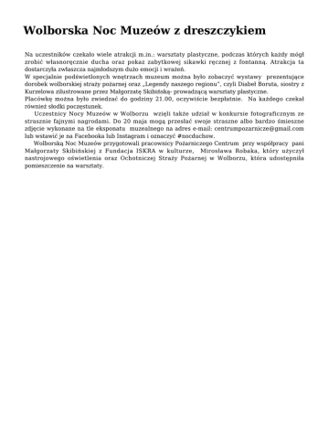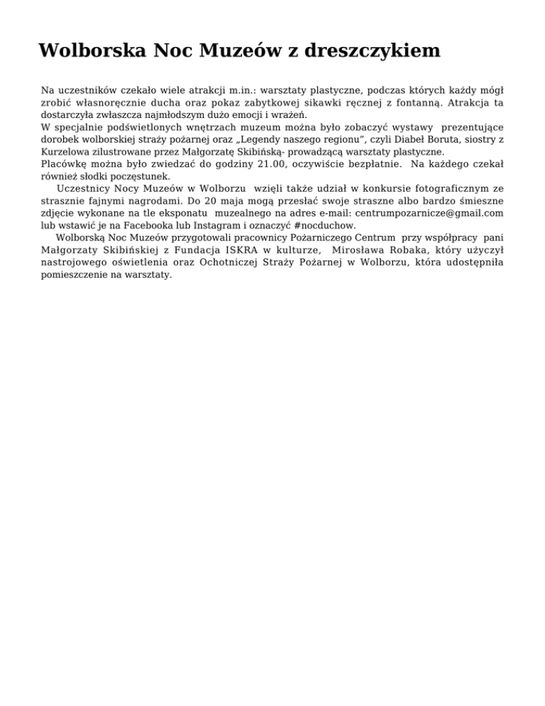Wolborska Noc Muzeów z dreszczykiem Na uczestników czekało wiele atrakcji m.in.: warsztaty plastyczne, podczas których każdy mógł zrobić własnoręcznie ducha oraz pokaz zabytkowej sikawki ręcznej z fontanną. Atrakcja ta dostarczyła zwłaszcza najmłodszym dużo emocji i wrażeń. W specjalnie podświetlonych wnętrzach muzeum można było zobaczyć wystawy prezentujące dorobek wolborskiej straży pożarnej oraz „Legendy naszego regionu”, czyli Diabeł Boruta, siostry z Kurzelowa zilustrowane przez Małgorzatę Skibińską- prowadzącą warsztaty plastyczne. Placówkę można było zwiedzać do godziny 21.00, oczywiście bezpłatnie. Na każdego czekał również słodki poczęstunek. Uczestnicy Nocy Muzeów w Wolborzu wzięli także udział w konkursie fotograficznym ze strasznie fajnymi nagrodami. Do 20 maja mogą przesłać swoje straszne albo bardzo śmieszne zdjęcie wykonane na tle eksponatu muzealnego na adres e-mail: [email protected] lub wstawić je na Facebooka lub Instagram i oznaczyć #nocduchow. Wolborską Noc Muzeów przygotowali pracownicy Pożarniczego Centrum przy współpracy pani Małgorzaty Skibińskiej z Fundacja ISKRA w kulturze, Mirosława Robaka, który użyczył nastrojowego oświetlenia oraz Ochotniczej Straży Pożarnej w Wolborzu, która udostępniła pomieszczenie na warsztaty.