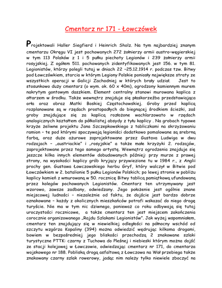 Cmentarz nr 171 - Łowczówek Projektowali Haller Siegfierd i Heinrich Sholz. Na tym najbardziej znanym cmentarzu Okręgu VI jest pochowanych 272 żołnierzy armii austro–węgierskiej w tym 113 Polaków z 1 i 5 pułku piechoty Legionów i 239 żołnierzy armii rosyjskiej. Z ogółem 511. pochowanych zidentyfikowanych jest 156. w tym 81. Legionistów, którzy polegli tutaj w dniach 22 –25.12.1914 r. podczas tzw. Bitwy pod Łowczówkiem, starcia w którym Legiony Polskie poniosły największe straty ze wszystkich operacji w Galicji Zachodniej w których brały udział. Jest to stosunkowo duży cmentarz (o wym. ok. 60 x 40m), ogrodzony kamiennym murem nakrytym gontowym daszkiem. Element centralny stanowi murowana kaplica z ołtarzem w środku. Także wewnątrz znajduje się płaskorzeźba przedstawiająca orła oraz obraz Matki Boskiej Częstochowskiej. Groby przed kaplicą rozplanowane są w rzędach prostopadłych do biegnącej środkiem ścieżki, zaś groby znajdujące się za kaplicą rozłożone wachlarzowato w rzędach analogicznych kształtem do półkolistej absydy z tyłu kaplicy . Na grobach typowe krzyże żeliwne projektu Jana Szczepkowskiego z tabliczkami na skrzyżowaniu ramion – te pod którymi spoczywają legioniści dodatkowo pomalowane są srebrną farbą, oraz duże ażurowe zaprojektowane przez Gustava Ludwiga w dwu rodzajach – „austriackie” i „rosyjskie” a także małe krzyżyki 2. rodzajów, zaprojektowane przez tego samego artystę. Wewnątrz ogrodzenia znajduje się jeszcze kilka innych elementów dobudowanych później: przy murze z prawej strony, na wysokości kaplicy grób kryjący przywiezione tu w 1984 r., z Anglii prochy gen. Gustawa Łowczowskiego herbu Gryf, który walczył w Bitwie pod Łowczówkiem w 2. batalionie 5 pułku Legionów Polskich; po lewej stronie w pobliżu kaplicy kamień z wmurowaną w 50. rocznicę Bitwy tablicą pamiątkową ufundowaną przez kolegów pochowanych Legionistów. Cmentarz ten utrzymywany jest wzorowo, zawsze zadbany, odwiedzany. Jego położenie jest ogólnie znane miejscowej ludności – niezależnie od faktu, że dojście jest bardzo dobrze oznakowane – każdy z okolicznych mieszkańców potrafi wskazać do niego drogę turyście. Nie ma w tym nic dziwnego, ponieważ co roku odbywają się tutaj uroczystości rocznicowe, a także cmentarz ten jest miejscem zakończenia corocznie organizowanego „Rajdu Szlakami Legionistów”. Jak wyżej wspomniałem, cmentarz ten znajdujący się w niewielkiej odległości na północny wschód od szczytu wzgórza Kopaliny (394) można odwiedzić wędrując kilkoma drogami, bowiem w bezpośredniej jego bliskości przechodzą 2 znakowane szlaki turystyczne PTTK: czarny z Tuchowa do Pleśnej i niebieski którym można dojść ze stacji kolejowej w Łowczowie, odwiedzając cmentarz nr 171, do cmentarza wojskowego nr 188. Pobliską drogą asfaltową z Łowczowa na Wał przebiega także znakowany czarny szlak rowerowy, jadąc nim należy tylko niewiele zboczyć na zachód, dobrą gruntową drogą by dotrzeć do Cmentarza Legionów. W bezpośrednie pobliże cmentarza da się podjechać samochodem , który można zostawić na dużej łące powyżej. Nieopodal ogrodzenia znajdują się stoliki i ławy dla odpoczywających turystów, miejsce na ognisko a także tablica informacyjna Starostwa Tarnowskiego z mapą Bitwy pod Łowczówkiem oraz informacją o jej przebiegu, następującej treści: „Od 20 grudnia 1914 r. front pomiędzy wojskami austro-węgierskimi a rosyjskimi ustabilizował się na Dunajcu, od jego ujścia do Wisły po Zgłobice. Dalej linia frontu biegła przez Pogórze, od Rzuchowej przez Pleśną, Łowczówek, Łowczów, Tuchów, Gromnik, Rzepiennik aż do Gorlic. Dnia 21 grudnia wojska rosyjskie próbowały przejść do natarcia. Wchodzący w skład 3 Armii XXI Korpus rosyjski, atakując od strony Tarnowa, uderzył w styk 3 i 4 Armii austro - węgierskiej pomiędzy Pleśną a Łowczówkiem. Czterokilometrowego odcinka frontu, wyznaczonego przez kolano rzeki Biała, broniły pułki 43 Dywizji Obrony Krajowej, dowodzonej przez gen. Schmitta. Kluczową pozycją na tym odcinku było wzgórze 360, bronione przez węgierską brygadę pułkownika Pattay'a. Lukę we froncie i zamieszanie w obronie wzgórza spowodowało opuszczenie linii frontu przez oddziały czeskie. Stacjonująca wówczas w Nowym Sączu l Brygada Legionów Polskich, otrzymała rozkaz wymarszu w rejon Łowczówka. Dowodził nią szef sztabu ppłk Kazimierz Sosnkowski. Brygada po przybyciu na miejsce miała zaatakować wojska rosyjskie i zająć pozycje opuszczone przez Czechów, czyli dwa wzgórza oznaczone na mapie 360 i 342. Liczebność l Brygady nie przekraczała wówczas 2 tyś. żołnierzy. W dniu 22 grudnia o godzinie 18- tej. w trzy godziny od rozpoczęcia akcji, legioniści zdobyli wzgórze 360 (Łowczówek). Rankiem 23 grudnia zaczęli atak na wzgórze 342 (Łowczów). Przed południem tego dnia wzgórze to zostało zdobyte przez Brygadę. Ale zaczęły się silne kontrataki rosyjskie na świeżo utracone pozycje. W Wigilię i Boże Narodzenie. Rosjanie po silnym przygotowaniu artyleryjskim, przypuszczali atak za atakiem na zajęte przez legionistów okopy. W dniu 25 grudnia l Brygada Legionów Polskich, nie mogąc doczekać się obiecanych przez dowództwo austro - węgierskie posiłków i zluzowania, wycofała się w kierunku na Wróblowice i Zakliczyn. Pod Łowczówkiem poległo 128 legionistów. 342 zostało rannych, kilkunastu dostało się do rosyjskiej niewoli. Była to jedna z większych bitew stoczonych przez l Brygadę Legionów Polskich.” Odwiedzając ten cmentarz warto zastanowić się jakie było podejście zaborcy do Polaków. Z treści tablicy bowiem nie wynika, że 25. grudnia 1 Brygada Legionów poniosła tutaj straty głównie dlatego, że dowództwo austro – węgierskie nie zawiadomiło ppłk Sosnkowskiego o rozkazie wycofania się wydanym sąsiednim jednostkom. Znami