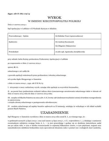 Sygn. akt II AKa 119/14 WYROK W IMIENIU RZECZYPOSPOLITEJ POLSKIEJ Dnia 17 czerwca 2014 r. Sąd Apelacyjny w Lublinie w II Wydziale Karnym w składzie: Przewodniczący - Sędzia SA Bohdan Tracz (sprawozdawca) Sędziowie: SA Andrzej Kaczmarek SA Zbigniew Makarewicz Protokolant st.sekr.sąd. Agnieszka Jarzębkowska przy udziale Jacka Kuźmy prokuratora Prokuratury Apelacyjnej w Lublinie po rozpoznaniu w dniu 17 czerwca 2014 r. sprawy K. L. oskarżonego z art.148§1 kk z powodu apelacji wniesionych przez prokuratora i obrońcę oskarżonego od wyroku Sądu Okręgowego w Zamościu z dnia 10 marca 2014 r., sygn. akt II K 81/13 I. utrzymuje w mocy zaskarżony wyrok, uznając obie apelacje za oczywiście bezzasadne; II. na poczet kary pozbawienia wolności zalicza okres tymczasowego aresztowania oskarżonego także w okresie od dnia 10 marca 2014 roku do dnia 17 czerwca 2014 roku; III. zasądza od Skarbu Państwa na rzecz adw. S. K. kwotę 738 (siedemset trzydzieści osiem) zł tytułem wynagrodzenia za sprawowaną z urzędu obronę oskarżonego w postępowaniu odwoławczym; IV. zwalnia oskarżonego od zapłaty kosztów sądowych za II instancję, ustalając że wchodzące w ich skład wydatki ponosi Skarb Państwa. UZASADNIENIE Sąd Okręgowy w Zamościu wyrokiem z dnia 10 marca 2014 roku uznał K. L. za winnego tego, że: w godzinach nocnych 13 lipca 2013 r. oraz nad ranem 14 lipca 2013 r., w Z., województwa (...), działając z zamiarem ewentualnym zabójstwa swojego brata A. L. – to jest przewidując i godząc się ze skutkiem śmiertelnym zadał mu po całym ciele, w tym w okolice twarzoczaszki co najmniej kilkanaście ciosów, w tym pięściami, nogami oraz samodziałowym młotkiem brukarskim czym spowodował obrażenia ciała w postaci ran i rozległych otarć naskórka, podbiegnięć krwawych głowy, tułowia i kończyn, krwiaka podtwardówkowego, wylewów krwawych pod oponą pajęczą do komór mózgowych, złamania żeber po stronie prawej od II do III w linii pachowej, dwumiejscowego złamania żebra X w linii łopatkowej i pachowej, złamania XI żebra, w linii pachowej przedniej oraz dwumiejscowego złamania żebra IX i X po stronie lewej, w wyniku czego na skutek obrażeń śródczaszkowych doszło do śmierci pokrzywdzonego na miejscu zdarzenia – to jest czynu wyczerpującego dyspozycję art. 148 § 1 k.k. i za to na podstawie art. 148 § 1 k.k. wymierzył mu karę 12 (dwunastu) lat pozbawienia wolności; na mocy art. 63 § 1 k.k. na poczet kary pozbawienia wolności zaliczył oskarżonemu czas zatrzymania i tymczasowego aresztowania w sprawie od 14 lipca 2013 r. do 10 marca 2014 r.; na zasadzie art. 44 § 2 k.k. orzekł przepadek przedmiotu w postaci samodziałowo wykonanego młotka brukarskiego – bliżej opisanego w wykazie dowodów rzeczowych nr I-285/13 pod pozycją nr 15 na karcie 106 akt sprawy; zasądził od Skarbu Państwa na rzecz adw. S. K. 1549,80 zł (jeden tysiąc pięćset czterdzieści dziewięć złotych osiemdziesiąt groszy), w tym 289,80 zł (dwieście osiemdziesiąt dziewięć złotych osiemdziesiąt groszy) podatku VAT, tytułem wynagrodzenia za nieopłaconą obronę sprawowaną z urzędu; zwolnił oskarżonego K. L. w całości od kosztów sądowych, a poniesionymi w jego sprawie wydatkami obciążył Skarb Państwa Apelacje od tego wyroku wnieśli obrońca oskarżonego i prokurator. Obrońca oskarżonego zaskarżył wyrok w całości, zarzucił mu: 1. naruszenie – wynikającego z Konstytucji RP oraz Europejskiej Konwencji Praw Człowieka oraz z art. 170 § 1 pkt 1 k.p.k. w zw. z art. 16 § 1 i 2 k.p.k. w zw. z art. 71 § 1 i 3 k.p.k. w zw. z art. 143 § 1 pkt 2 k.p.k. w zw. z art. 174 k.p.k. w zw. z art. 300 k.p.k. w zw. z art. 308 § 2 k.p.k. – prawa do sprawiedliwego i rzetelnego procesu poprzez dopuszczenie dowodu z zeznań funkcjonariusza Policji A. C. (1) i oparcie na nich rozstrzygnięcia w sytuacji, gdy uzyskane przez niego w trakcie wykonywania czynności służbowych informacje zostały zdobyte z naruszeniem wyżej wymienionych gwarancji procesowych podejrzanego i wywołały dla niego ujemne skutki; 2. obrazę prawa procesowego tj. art. 7 k.p.k. w zw. z art. 410 k.p.k. w zw. z art. 424 § 1 pkt 1 k.p.k. poprzez dowolne przyjęcie, iż K. L. oraz M. L. prowadzili odrębne gospodarstwa domowe i nie pozostawali we wspólnym pożyciu w sytuacji, gdy z okoliczności sprawy oraz zeznań M. L. złożonych na rozprawie w dniu 24 lutego 2014 r. wynika wniosek przeciwny (K. L. i M. L. żyli jak rodzina zamieszkiwali w jednym domu, wspólnie ponosili opłaty, wspólnie gotowali, łączyła ich silna więź emocjonalna, od czasu choroby brata M. L. opiekował się K. L. i pomagał mu finansowo), co doprowadziło do niezasadnego pozbawienia M. L. prawa do odmowy składania zeznań i w efekcie mogło mieć decydujący wpływ na treść orzeczenia; 3. obrazę prawa procesowego, tj. art. 7 k.p.k. w zw. z art. 410 k.p.k. poprzez dowolne przyjęcie, iż pomiędzy M. L. a K. L. brak jest silnej więzi emocjonalnej w znaczeniu szczególnie bliskiego stosunku osobistego w rozumieniu przepisu art. 185 k.p.k. w sytuacji, gdy z okoliczności sprawy oraz zeznań M. L. złożonych na rozprawie w dniu 24 lutego 2014 r. wynika wniosek przeciwny, co doprowadziło do niezasadnego pozbawienia M. L. prawa do odmowy składania zeznań przeciwko bratankowi i w efekcie mogło mieć wpływ na treść orzeczenia; 4. obrazę prawa procesowego, tj. art. 366 § 1 k.p.k. w zw. z art. 193 § 1 k.p.k. poprzez zaniechanie zasięgnięcia opinii biegłego psychologa na temat więzi emocjonalnej i charakteru stosunku osobistego łączącego M. L. i K. L. w sytuacji, gdy ocena tej więzi i stosunków wymagała wiedzy specjalistycznej, co doprowadziło do dowolnego uznania przez Sąd, iż nie zachodzą przesłanki z art. 185 k.p.k. oraz do niezasadnego pozbawienia M. L. prawa do odmowy składania zeznań a w efekcie mogło mieć wpływ na treść orzeczenia; 5. obrazę prawa procesowego