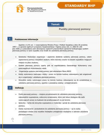 STANDARDY BHP Temat: Punkty pierwszej pomocy 1 Podstawowe informacje Zgodnie z § 44 ust. 1 rozporządzenia Ministra Pracy i Polityki Socjalnej z dnia 26 września 1997 r. w sprawie ogólnych przepisów bezpieczeństwa i higieny pracy (Dz. U. 2003 Nr 169 poz.1650 j.t.) pracodawca jest obowiązany zapewnić pracownikom sprawnie funkcjonujący system pierwszej pomocy w razie wypadku oraz środki do udzielania pierwszej pomocy. Generalny Wykonawc organizuje i zapewnia działanie systemu pierwszej pomocy, celem zapewnienia pomocy wszystkim osobom, które doznały urazów na skutek wypadków mających miejsce na placu budowy. System pierwszej pomocy oparty jest na współdziałaniu Generalnego Wykonawcy oraz poszczególnych Wykonawców robót. Organizacja systemu pierwszej pomocy jest elementem Planu BIOZ. Każdy wykonawca realizujący roboty i prace na terenie budowy zobowiązany jest angażować się w organizację i udzielanie pierwszej pomocy. Wszystkie osoby wykonujące pracę na terenie budowy zobowiązane są do uczestnictwa w udzielaniu pierwszej pomocy, zgodnie z posiadaną wiedzą i umiejętnościami. 2 Definicje Punkt pierwszej pomocy – miejsce przystosowane do udzielania pierwszej pomocy, odpowiednio wyposażone, widocznie oznakowane, które jest łatwo dostępne dla osób wykonujących pracę na budowie lub przebywających na jej terenie. Apteczka – torba lub skrzynka wyposażona w materiały i sprzęt do udzielania pierwszej pomocy. Osoby wyznaczone i przeszkolone do udzielania pierwszej pomocy – są to osoby posiadające wiedzę oraz wszelkie niezbędne umiejętności niezbędne w zakresie udzielania pierwszej pomocy. 1|Strona ` 3 Elementy systemu pierwszej pomocy Instrukcja postępowania w sytuacji zaistnienia wypadku lub zagrożenia dla zdrowia i życia. Osoby wyznaczone oraz przeszkolone w zakresie udzielania pierwszej pomocy. Określenie na planie zagospodarowania terenu budowy miejsca usytuowania punktów pierwszej pomocy i miejsc przechowywania apteczek medycznych. Materiały medyczne i wszelkie inne środki medyczne niezbędne do udzielania pierwszej pomocy Szkolenia w zakresie postępowania w razie wypadku lub zagrożenia dla zdrowia (Instrukcja postępowania w sytuacji zaistnienia wypadku lub zagrożenia dla zdrowia i życia) Ćwiczenia w zakresie organizowania i udzielania pierwszej pomocy. 3.1. Środki techniczne i materiały apteczka medyczna medyczna deska transportowa (jeśli przewidziano to w wyposażeniu) lista osób upoważnionych do udzielania pierwszej pomocy instrukcja udzielania pierwszej pomocy AED (dobra praktyka) wykaz środków i materiałów do udzielania pierwszej pomocy (ustalony w porozumieniu z lekarzem sprawującym opiekę profilaktyczną nad pracownikami) wszelkie inne środki wynikające ze specyfiki prowadzonych prac 3.2. Informowanie o obowiązkach w zakresie zapewnienia pierwszej pomocy Szkolenia informacyjne – przekazanie informacji wszystkim osobom wykonującym pracę na terenie budowy bez względu na podstawę zatrudnienia czy pełniona rolę lub funkcję. Udział w szkoleniu powinno być jednym z warunków uzyskania prawa wejścia na teren budowy. Spotkania koordynacyjne – cykliczne spotkania Generalnego Wykonawcy z przedstawicielami Podwykonawców. Tablica BHP. Ulotki informacyjne (dobra praktyka). Znaki informujące, ostrzegające, nakazujące. Codzienne informowanie o obowiązkach podczas realizacji rutynowych działań związanych z prowadzeniem procesu budowlanego. 2|Strona ` 5 Organizacja punktu pierwszej pomocy Punkty pierwszej pomocy oraz miejsca przechowywania apteczek medycznych powinny być odpowiednio oznakowane, zgodnie z Polską Normą, oraz ogólnodostępne. Wszystkie te miejsca powinny zaplanowanej o zaznaczone na planie zagospodarowania placu budowy. Punkty pierwszej pomocy powinny być organizowane w miejscach łatwo dostępnych, wyposażonych w ujęcie ciepłej i zimnej wody, niezbędny sprzęt potrzebny do udzielania pierwszej pomocy, instrukcję udzielania pierwszej pomocy oraz wykaz osób upoważnionych do udzielania pierwszej pomocy. 3|Strona