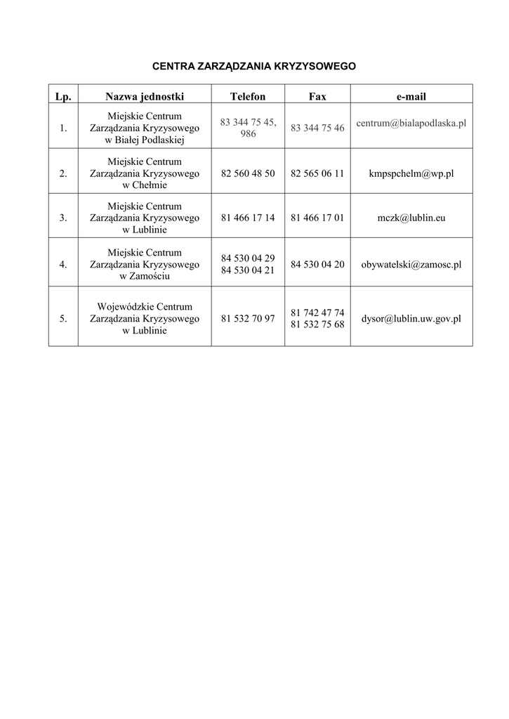 CENTRA ZARZĄDZANIA KRYZYSOWEGO Lp. Nazwa jednostki Telefon Fax e-mail 1. Miejskie Centrum Zarządzania Kryzysowego w Białej Podlaskiej 83 344 75 45, 986 83 344 75 46 [email protected] 2. Miejskie Centrum Zarządzania Kryzysowego w Chełmie 82 560 48 50 82 565 06 11 [email protected] 3. Miejskie Centrum Zarządzania Kryzysowego w Lublinie 81 466 17 14 81 466 17 01 [email protected] 4. Miejskie Centrum Zarządzania Kryzysowego w Zamościu 84 530 04 29 84 530 04 21 84 530 04 20 [email protected] 5. Wojewódzkie Centrum Zarządzania Kryzysowego w Lublinie 81 532 70 97 81 742 47 74 81 532 75 68 [email protected]