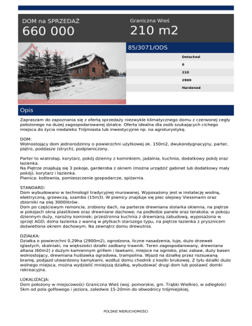 DOM na SPRZEDAŻ 660 000 Graniczna Wieś 210 m2 85/3071/ODS Detached 6 210 2900 Hardened Opis Zapraszam do zapoznania się z ofertą sprzedaży niezwykle klimatycznego domu z czerwonej cegły położonego na dużej zagospodarowanej działce. Oferta idealna dla osób szukających cichego miejsca do życia niedaleko Trójmiasta lub inwestycyjnie np. na agroturystykę. DOM: Wolnostojący dom jednorodzinny o powierzchni użytkowej ok. 150m2, dwukondygnacyjny, parter, piętro, poddasze (strych), podpiwniczony. Parter to wiatrołap, korytarz, pokój dzienny z kominkiem, jadalnia, kuchnia, dodatkowy pokój oraz łazienka. Na Piętrze znajdują się 3 pokoje, garderoba z oknem (można urządzić gabinet lub dodatkowy mały pokój), korytarz i łazienka. Piwnica: kotłownia, pomieszczenie gospodarcze, spiżarnia. STANDARD: Dom wybudowano w technologii tradycyjnej murowanej. Wyposażony jest w instalację wodną, elektryczną, grzewczą, szambo (15m3). W piwnicy znajduje się piec olejowy Viessmann oraz zbiorniki na olej 3000litrów. Dom po częściowym remoncie, zrobiony dach, na parterze drewniana stolarka okienna, na piętrze w pokojach okna plastikowe oraz drewniane dachowe; na podłodze panele oraz terakota; w pokoju dziennym duży, narożny kominek; przestronna kuchnia z drewnianą zabudową, wyposażona w sprzęt AGD; dolna łazienka z wanną w płytkach starszego typu, na piętrze łazienka z prysznicem doświetlona oknem dachowym. Na zewnątrz domu drewutnia. DZIAŁKA: Działka o powierzchni 0,29ha (2900m2), ogrodzona, liczne nasadzenia, tuje, dużo drzewek iglastych, skalniaki, na większości działki zadbany trawnik. Teren zagospodarowany, drewniana altana (60m2) z dużym kamiennym grillem i ławkami, miejsce na ognisko, plac zabaw, duży basen wolnostojący, drewniana huśtawka ogrodowa, trampolina. Wjazd na działkę przez rozsuwaną bramę, podjazd utwardzony kamykami, wzdłuż domu chodnik z kostki brukowej. Z tyłu działki dużo wolnego miejsca, można wydzielić mniejszą działkę, wybudować drugi dom lub postawić domki rekreacyjne. LOKALIZACJA: Dom położony w miejscowości Graniczna Wieś (woj. pomorskie, gm. Trąbki Wielkie), w odległości 5km od pola golfowego i jeziora, zaledwie 15-20min do obwodnicy trójmiejskiej. POLSKIE NIERUCHOMOŚCI INFORMACJE DODATKOWE: Wydanie od zaraz. Możliwość wynajmu domu za cenę 4.000zł plus opłaty wg zużycia. Zapraszam na prezentację. * Przedstawione informacje zostały opracowane na podstawie danych uzyskanych od Zamawiającego, mają jedynie charakter informacyjny i mogą ulec zmianie. * Niniejsza oferta nie stanowi oferty w rozumieniu Kodeksu Cywilnego. * Pozostałe oferty dostępne na stronie internetowej www.polskienieruchomosci.eu i www.polnie.pl * Wszystkie transakcje przeprowadzane przy udziale naszego biura nadzorowane są przez licencjonowanego pośrednika. Zamieszczone zdjęcia są Naszą własnością. Publikowanie, kopiowanie, przetwarzanie oraz wykorzystanie niniejszych zdjęć bez wiedzy i zgody autora jest zabronione. Marta Wierucka tel. 530 064 100 email: [email protected] POLSKIE NIERUCHOMOŚCI Powered by TCPDF (www.tcpdf.org)