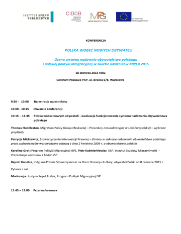KONFERENCJA POLSKA WOBEC NOWYCH OBYWATELI Ocena systemu nadawnia obywatelstwa polskiego i polskiej polityki integracyjnej w świetle wkaźników MIPEX 2015 18 czerwca 2015 roku Centrum Prasowe PAP, ul. Bracka 6/8, Warszawa 9:30 - 10:00 Rejestracja uczestników 10:00 - 10:15 Otwarcie konferencji 10:15 - 11:45 Polska wobec nowych obywateli - ewaluacja funkcjonowania systemu nadawania obywatelstwa polskiego Thomas Huddleston, Migration Policy Group (Bruksela) – Procedury naturalizacyjne w Unii Europejskiej – wybrane przykłady Patrycja Mickiewicz, Stowarzyszenie Interwencji Prawnej – Zmiany w zakresie nabywania obywatelstwa polskiego przez cudzoziemców wprowadzone ustawą z dnia 2 kwietnia 2009 r. o obywatelstwie polskim Karolina Grot (Program Polityki Migracyjnej ISP), Piotr Kaźmierkiewicz (ISP, Instytut Studiów Migracyjnych) – Prezentacja wniosków z badań ISP Rajesh Ganatra, Indyjsko-Polskie Stowarzyszenie na Rzecz Rozwoju Kultury, obywatel Polski od 8 czerwca 2015 r. Pytania z sali. Moderacja: Justyna Segeš Frelak, Program Polityki Migracyjnej ISP 11:45 – 12:00 Przerwa kawowa 12:00 – 13:30 Ocena polskiej polityki integracyjnej według najnowszych wskaźników MIPEX Thomas Huddleston, Migration Policy Group (Bruksela) – prezentacja wniosków z ewaluacji MIPEX 2015 Komentarz: - Paulina Babis, Departament Pomocy i Integracji Społecznej, Ministerstwo Pracy i Polityki Społecznej - Agnieszka Skiba, Departament Polityki Migracyjnej, Ministerstwo Spraw Wewnętrznych - Ksenia Naranovich, Fundacja Rozwoju Oprócz Granic - dr Tomasz Sieniow, Instytut na rzecz Państwa Prawa, Katolicki Uniwersytet Lubelski Jana Pawła II Pytania z sali. Moderacja: dr Witold Klaus, Stowarzyszenie Interwencji Prawnej 13:30 – 14:00 Lunch Prosimy o zgłaszanie chęci uczestnictwa w konferencji do dn. 16 czerwca br. drogą mailową na adres: [email protected]. Organizatorzy zapewniają tłumaczenie symultaniczne. Wszelkich informacji na temat konferencji udziela Karolina Grot (tel. 22 556 42 78), email: [email protected] MIPEX 2015: http://mipex.eu/ Facebook: Migrant Integration Policy Index Twitter: @_MIPEX #MIPEX2015 Konferencja organizowana jest w ramach projektu “Integration policies: Who benefits? The development and use of indicators in integration debates (MIPEX 2015)” współfinansowanego z środków Europejskiego Funduszu na rzecz Integracji Obywateli Państw Trzecich oraz projektu „Polska wobec nowych obywateli - ewaluacja funkcjonowania systemu nadawania obywatelstwa polskiego” współfinansowanego ze środków Europejskiego Funduszu na rzecz Integracji Obywateli Państw Trzecich oraz budżetu państwa.