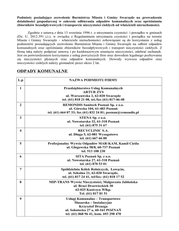 Podmioty posiadające zezwolenie Burmistrza Miasta i Gminy Swarzędz na prowadzenie działalności gospodarczej w zakresie odbierania odpadów komunalnych oraz opróżnianiu zbiorników bezodpływowych i transporcie nieczystości ciekłych od właścicieli nieruchomości. Zgodnie z ustawą z dnia 13 września 1996 r. o utrzymaniu czystości i porządku w gminach (Dz. U. 2012.391 j.t.), w związku z Regulaminem utrzymania czystości i porządku na terenie Miasta i Gminy Swarzędz - właściciele nieruchomości zobowiązani są do korzystania z usług podmiotów posiadających zezwolenie Burmistrza Miasta i Gminy Swarzędz na odbiór odpadów komunalnych oraz opróżnianie zbiorników bezodpływowych i transport nieczystości ciekłych. Z firmą taką należy podpisać umowę i po każdorazowym usunięciu nieczystości, odebrać rachunek. Jest on potwierdzeniem korzystania z usług powyższych firm oraz dowodem legalnego pozbywania się nieczystości płynnych oraz odpadów komunalnych. Dowody wywozu odpadów oraz nieczystości ciekłych należy gromadzić przez okres 2 lat. ODPADY KOMUNALNE L.p NAZWA PODMIOTU/FIRMY 1 Przedsiębiorstwo Usług Komunalnych ARTUR ZYS ul. Warszawska 2, 62-020 Swarzędz tel. (61) 818 21 08, tel./fax (61) 817-46-48 2 REMONDIS Sanitech Poznań Sp. z o.o. ul. Górecka 104, 61-483 Poznań tel. (61) 664 07 33; fax (61) 832 24 81; [email protected] 3 STENA Sp. z o.o. ul. Nowotarska 32, 61-318 Poznań tel. (61) 875 31 67 4 RECYCLINIC S.A. ul. Długa 5, 62-081 Wysogotowo tel. (61) 667 66 00 5 Profesjonalny Wywóz Odpadów MAR-KAM, Kamil Cieśla ul. Głogowska 58/8, 60-737 Poznań tel. 513 108 230 6 SITA Poznań Sp. z o.o. ul. Nowotarska 27, 61-318 Poznań tel. (61) 870 53 01 7 Spółdzielnia Kółek Rolniczych, Łowęcin, ul. Szkolna 21, 62-020 Swarzędz, tel. (61) 817 24 41, tel/fax: (61) 818 17 52 8 MIP-TRANS Wywóz Nieczystości, Małgorzata Jabłońska ul. Braci Drzewieckich 30 62-025 Kostrzyn Wlkp. Tel. (61) 817 81 51 9 Usługi Komunalno – Transportowe Ślusarsko – Instalacyjne Krzysztof Drzazga ul. Sobotecka 27 a, 60-161 POZNAŃ tel. (61) 868 96 41, kom. 693 298 470 10 Przedsiębiorstwo Usług Komunalno – Transportowych „NITOM”, Danuta Nowacka ul. Kosińskiego 25/7, 61-521 Poznań tel. (61) 832 36 64 11 „ASTRA” Usługi Wielobranżowe, Handel, Aldona Wesołowska ul. Mścibora 88, 61-062 Poznań tel./fax (61) 852 76 61; tel. (61) 851 03 58; (61) 653 29 94; 12 Przedsiębiorstwo Usług Komunalnych „Eko-Rondo” s.c. Halina i Zenon Guźniczak ul. Nadwarciańska 11, 62-041 Puszczykowo tel/fax (61) 813 30 15 13 Usługi Transportowe, Wywóz Nieczystości Płynnych, Jarosław Ziółkowski ul. Żwirki i Wigury 25, 62-020 Swarzędz tel. 606 288 722 14 Usługi Transportowe Tomasz Helak os. Czwartaków 14/6, 62-020 Swarzędz tel. (61) 818 37 60 15 „SKIP” Alicja Żwawiak ul. Syrenia 7, 61-017 Poznań tel. 698 606 446 16 Przedsiębiorstwo Usług KomunalnychTrans-Kom ul. Dojazd 30, 60-631 Poznań tel./fax (61) 662 40 72; kom. 601 162 416; [email protected] 17 Zakład Sprzątania Placów i Ulic Mielczarek, Sobański Spółka Jawna ul. Jasielska 7b, 60-476 Poznań tel. (61) 840 00 72; [email protected] 18 „Aquanet”S.A. (Dział Serwisu Sieci Kanalizacyjnej) ul. Dolna Wilda 126, 61-492 Poznań tel. (61) 835 99 11; fax (61) 835 99 12 19 EKO-TOM Turgała S.J. ul. Rumiankowa 11, 61-680 Poznań tel./fax (61) 823 28 32; kom. 601 776 693 20 TRANSMOS Monika Szatybełko os. Wł. Jagiełły 12K/136, 60-694 Poznań tel. 669 444 787 21 Wywóz Nieczystości Stałych EKO-ZEN Rafał Strugalski, os. Stare Żegrze 44/4, 61-249 Poznań tel . 6(1) 871 58 89, kom. 602 217 549 22 Wrocławskie Przedsiębiorstwo Oczyszczania ALBA S.A., ul. A. Ostrowskiego 7, 53-238 Wrocław tel. (71) 337 51 00 23 Przedsiębiorstwo Komunalno - Transportowe ORDO Marek Friebe ul. Gdyńska 131, 62-004 Czerwonak tel. (61) 825 75 79 24 Technika Sanitarna Sp z o.o. ul. Jasielska 7B, 60-476 Poznań tel. (61) 840 00 72 25 „Veolia” Usługi dla Środowiska Recykling Sp. z o.o. ul. Szobiszowicka 1, 44-100 Gliwice tel. (32) 338 23 30, fax: (032) 338 23 24 26 Przedsiębiorstwo Wielobranżowe „LS-PLUS” Sp. z o.o. ul. Szałwiowa 34A/2, 62-064 Plewiska tel./fax (61) 447 51 71 27 PRZEDSIĘBIORSTWO USŁUGOWE „ECOR” Paweł Friebe ul. Gdyńska 131, 62-004 Czerwonak kom. 502 258 550 28 First Recycling Poznań Sp. z o.o. ul. Gdyńska 131, 62-004 Czerwonak tel. (61) 652 70 60; fax (61) 652 70 61 29 SAN-EKO ZAKŁAD USŁUG KOMUNALNYCH Krzysztof Skoczylas ul. Łukaszewicza 37A/1, 60-729 Poznań tel./fax (61) 667 53 71; kom. 601 754 876 30 SZART SZYMON RĄPEL ul. Pionierów 55, 62-510 Konin fax (63) 249 18 41; kom. 535 979 278; 506 155 636 NIECZYSTOŚCI CIEKŁE NAZWA PODMIOTU/FIRMY 1 Przedsiębiorstwo U. P. H. KRIS-POL Export–Import Krzysztof Kiersztan ul. Dopiewska 49, 62-071 Konarzewo tel. (061) 814-81-17, 0 602-735-770 2 Spółdzielnia Kółek Rolniczych, Łowęcin, ul. Szkolna 21, 62-020 Swarzędz, tel. 061 81 72 441, tel./fax: 61 818 17 52 3 TOM-TRANS, Tomasz Ziółkowski ul. Łabiszyńska 1, 61-038 POZNAŃ tel. (061)8877310, kom. 697 307 902 4 Przedsiębiorstwo Usług Komunalnych „Eko-Rondo” s.c. Halina i Zenon Guźniczak ul. Nadwarciańska 11, 62-041 Puszczykowo tel/fax. (061) 8133-015 5 Wywóz Nieczystości Płynnych Janusz Kotecki ul. Krasickiego 12, 62-020 Swarzędz tel. (061) 8 173 465 6 Usługi Transportowe, Wywóz Nieczystości Płynnych, Jarosław Ziółkowski ul. Żwirki i Wigury 25, 62-020 Swarzędz tel. 606-288-722 7 RONITEX P.T.H. Ewa Sommerfeld, ul. Rubinowa 3, 61-680 Poznań tel. (061) 8 257 186, kom. 603 78 23 51 8 Wywóz Odpadów Płynnych, Andrzej Antysiak, ul. Szkolna 22, 62-020 Łowęcin tel. (061) 8 181 993, kom. 604 869 795 9 CLIPPER Sp z o.o. ul. Muszkieterów 31, 02-273 Warszawa Przedstawicielstwo Poznań 62-001 Chludowo, ul. Nad Torem 23 tel. 061 811 65 39 10 Wywóz Odpadów Płynnych Ireneusz Marczak ul. Kórnicka 129A 62-020 Swarzędz (061)651-59-25 11 Firma Handlowo-Usługow