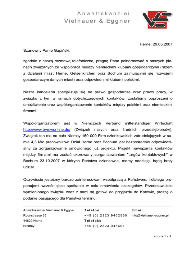 A n w a l t s k a n z l e i V i e l h a u e r & E g g n e r Herne, 29.05.2007 Szanowny Panie Gapiński, zgodnie z naszą rozmową telefoniczną, pragnę Pana poinormować o naszych pla nach związanych ze współpracą między niemieckimi klubami gospodarczymi (razem z działami miast Herne, Gelsenkirchen oraz Bochum zajmującymi się rozwojem gospodarczym danych miast) oraz odpowiednimi klubami polskimi. Nasza kancelaria specjalizuje się na prawo gospodarcze oraz prawo pracy, w związku z tym w ramach dotychczasowych kontaktów, zostaliśmy poproszeni o umożliwienie oraz współorganizowanie kontaktów między polskimi oraz niemieckimi firmami. Współorganizatorem jest w Niemczech Verband mittelständiger Wirtschaft http://www.bvmwonline.de/ (Związek małych oraz średnich przedsiębiorców). Związek ten ma na całe Niemcy 150 000 Firm członkowskich zatrudniających w su mie 4,3 Mio pracowników. Dział Herne oraz Bochum jest bezpośrednio odpowiedzi alny za zorganizowanie omówionego już projektu. Projekt nawiązania kontaktów między firmami ma zostać ukorowany zorganizowaniem "targów kontaktowych" w Bochum 23.10.2007 w których Państwa członkowie, mamy nadzieję, będą brały udział. Oczywiście jesteśmy bardzo zainteresowani współpracą z Państwem, i dlatego pro ponujemi wcześniejsze spotkanie w celu omówienia szczegółów. Przedstawiciele wymienionego związku wraz z nami są gotowi do przyjazdu do Katowic, proszę o podanie pasującego dla Państwa terminu. Anwaltskanzlei Vielhauer & Eggner T e l e f o n E m a i l Roonstrasse 35 + 4 9 ( 0 ) 2 3 2 3 9 4 6 2 5 6 0 info@vielhauereggner.pl 44629 Herne T e l e f a k s Niemcy + 4 9 ( 0 ) 2 3 2 3 9 4 6 6 0 1 strona 1 z 2 A n w a l t s k a n z l e i V i e l h a u e r & E g g n e r Już teraz zostało nam zasygnalizowane, że są na terenie Zagłębia Rury firmy zainte resowane przyjazdem do Polski w celu zwiedzenia firm polskim z którymi możliwa by była współpraca lub też inwestycja. Proszę o przemyślenie propozycji. W oczekiwaniu na odpowiedź przesyłamy wyrazy szacunku Aldona Vielhauer (Adwokat) Anwaltskanzlei Vielhauer & Eggner T e l e f o n E m a i l Roonstrasse 35 + 4 9 ( 0 ) 2 3 2 3 9 4 6 2 5 6 0 info@vielhauereggner.pl 44629 Herne T e l e f a k s Niemcy + 4 9 ( 0 ) 2 3 2 3 9 4 6 6 0 1 strona 2 z 2
