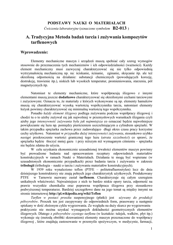 PODSTAWY NAUKI O MATERIAŁACH Ćwiczenia laboratoryjne (oznaczone symbolem B2-013 ) A. Tradycyjna Metoda badań tarcia i zużywania kompozytów tarflenowych Wprowadzenie: Elementy mechaniczne maszyn i urządzeń muszą spełniać cały szereg wymogów stosownie do przeznaczenia tych mechanizmów i ich odpowiedzialności (ważności). Każdy element mechaniczny musi zazwyczaj charakteryzować się nie tylko odpowiednią wytrzymałością mechaniczną np. na: ściskanie, ścinanie, zginanie, skręcanie itp. ale też określoną odpornością na działanie: substancji chemicznych (powodujących korozję, destrukcję, trawienie itp.), niskich lub wysokich temperatur, promieniowania, starzenia, pól magnetycznych itp. Natomiast te elementy mechaniczne, które współpracują ślizgowo z innymi elementami muszą jeszcze dodatkowo charakteryzować się określonymi cechami tarciowymi i zużyciowymi. Oznacza to, że materiały z których wykonywane są np. elementy hamulców muszą się charakteryzować wysoką wartością współczynnika tarcia, natomiast elementy łożysk powinny charakteryzować się minimalną wartością tego współczynnika. Ponadto każdy element ślizgowy podlega zużywaniu podczas współpracy ślizgowej i chodzi tu o to ażeby zużywał się jak najwolniej w przemysłowych warunkach ślizgania czyli ażeby jego intensywność zużywania była jak najmniejsza co oznaczać będzie najwolniejsze powiększanie się luzu np. pomiędzy pierścieniem uszczelniającym a cylindrem sprężarki. W takim przypadku sprężarka zachowa przez zadawalająco długi okres czasu pracy korzystne cechy użytkowe. Natomiast w przypadku dużej intensywności zużywania, stosunkowo szybko nastąpi przekroczenie wartości granicznej tego luzu (utrata szczelności) co sprawi, że sprężarka będzie tłoczyć mniej gazu i przy niższym niż wymaganym ciśnieniu – sprężarka nie będzie zdatna do użycia. W celu uzyskania ekonomicznie uzasadnionej trwałości elementów maszyn powinny być prowadzone badania nad opracowaniem receptury odpowiednich materiałów konstrukcyjnych w ramach Nauki o Materiałach. Działania te mogą być wspierane (w uzasadnionych ekonomicznie przypadkach) przez badania tarcia i zużywania w zakresie tribologii (tribologia – nauki o tarciu i zużywaniu materiałów konstrukcyjnych). W 1939 roku wynaleziono teflon (PTFE – politetrafluoroetylen) lecz do dnia dzisiejszego konstruktorzy nie znają pełnych jego charakterystyk użytkowych. Produkowany PTFE w Tarnowie nazwany zastał tarflenem. Charakteryzuje się całym szeregiem unikalnych właściwości. Najważniejsze z nich to bardzo niskie opory tarcia, odporność na prawie wszystkie chemikalia oraz poprawna współpraca ślizgowa przy stosunkowo podwyższonej temperaturze. Bardziej szczegółowe dane na jego temat są między innymi na stronie internetowej http://pl.wikipedia.org/wiki/Teflon Tarflen w postaci proszku suspensyjnego (płatki) jest używany do produkcji półwyrobów. Proszek ten jest zasypywany do odpowiednich form, prasowany a następnie spiekany w dość złożonym cyklu wygrzewania. Ze względu na duży skurcz po wygrzewaniu praktycznie nie można uzyskać wymaganych dokładności geometrycznych elementów ślizgowych. Dlatego z półwyrobów czystego tarflenu (w kształcie: tulejek, wałków, płyt itp.) wykonuje się (metodą obróbki skrawaniem) elementy maszyn przeznaczone do współpracy ślizgowej , które znajdują zastosowanie w przemyśle spożywczym, w medycynie, farmacji, 1 technice kosmicznej, próżniowej itp. Są one stosunkowo mało odporne na zużywanie w cięższych warunkach pracy. Bardziej odporne na zużywanie są kompozyty na osnowie tarflenu bo tworzą na stalowym elemencie (z którym ślizgowo współpracują) warstewkę samosmarną – film transferowy. Otrzymuje się je przez zmieszanie proszku suspensyjnego tarflenu z wybranymi napełniaczami, którymi mogą być: np. koks, grafit, proszki brązu, włókna szklane lub węglowe Napełniacze o określonej granulacji, właściwościach powierzchniowych i w określonej proporcji są wprowadzane do mieszanki. Po starannym zmieszaniu składników są formowane, prasowane i spiekane. Następnie (z półwyrobów) metodą obróbki skrawaniem otrzymujemy elementy ślizgowe „na gotowo” Zazwyczaj nie są jednak znane właściwości tarciowe i zużyciowe nowych gatunków kompozytów. Dlatego przedmiotem badań w Katedrze Konstrukcji i Eksploatacji Maszyn były między innymi półfabrykaty kompozytów tarflenowych wyprodukowane w Zakładach Azotowych w Tarnowie. Charakteryzują się one głównie tym, że wykonane z nich elementy mechaniczne podczas poprawnej współpracy ślizgowej nie wymagają smarowania. Znajdują one zastosowanie między innymi jako pierścienie ślizgowe lub uszczelniające np. w urządzeniach do sprężania tlenu i wszędzie tam gdzie nie dopuszcza się obecności smarów. Badania charakterystyk tarciowych i odporności na zużywanie i materiałów konstrukcyjnych są najbardziej pracochłonnymi i czasochłonnymi a tym samym kosztownymi badaniami spośród badań własności tych materiałów. Jednak dla poszerzenia wiedzy konstruktorów i użytkowników węzłów ślizgowych podejmuje się badania z pomocą urządzeń potocznie nazywanych stanowiskami badawczymi lub tribotesterami (rys. 2, fot.3, fot 4). Przedmiotem badań są próbki kompozytów, które są zamontowane na tych urządzeniach współpracują ślizgowo z wybranymi gatunkami materiałów konstrukcyjnych (zazwyczaj ze stalą nierdzewną). W celu znacznego skrócenia czasu badań zużyciowych prowadzone są liczne prace w wielu ośrodkach badawczych. Z tego samego powodu w naszej Katedrze zbudowano stanowisko badawcze i opracowano podstawy do opracowania szybkiej metody oceny odporności na zużywanie kompozytów tarflenowych. Opracowywana metoda jest bardziej szczegółowo opisana w II części objaśnień do ćwiczenia B2-013. Ponadto op