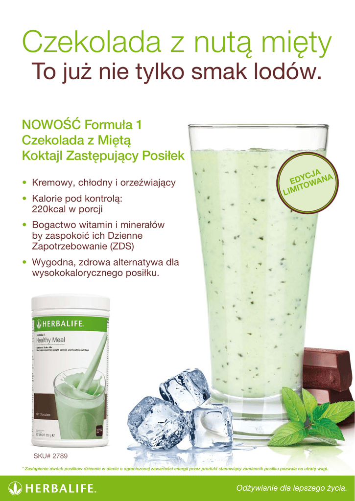Czekolada z nutą mięty To już nie tylko smak lodów. NOWOŚĆ Formuła 1 Czekolada z Miętą Koktajl Zastępujący Posiłek • Kremowy, chłodny i orzeźwiający • Kalorie pod kontrolą: 220kcal w porcji CJA NA Y D A E OW T I LIM • Bogactwo witamin i minerałów by zaspokoić ich Dzienne Zapotrzebowanie (ZDS) • Wygodna, zdrowa alternatywa dla wysokokalorycznego posiłku. SKU# 2789 * Zastąpienie dwóch posiłków dziennie w diecie o ograniczonej zawartości energii przez produkt stanowiący zamiennik posiłku pozwala na utratę wagi.