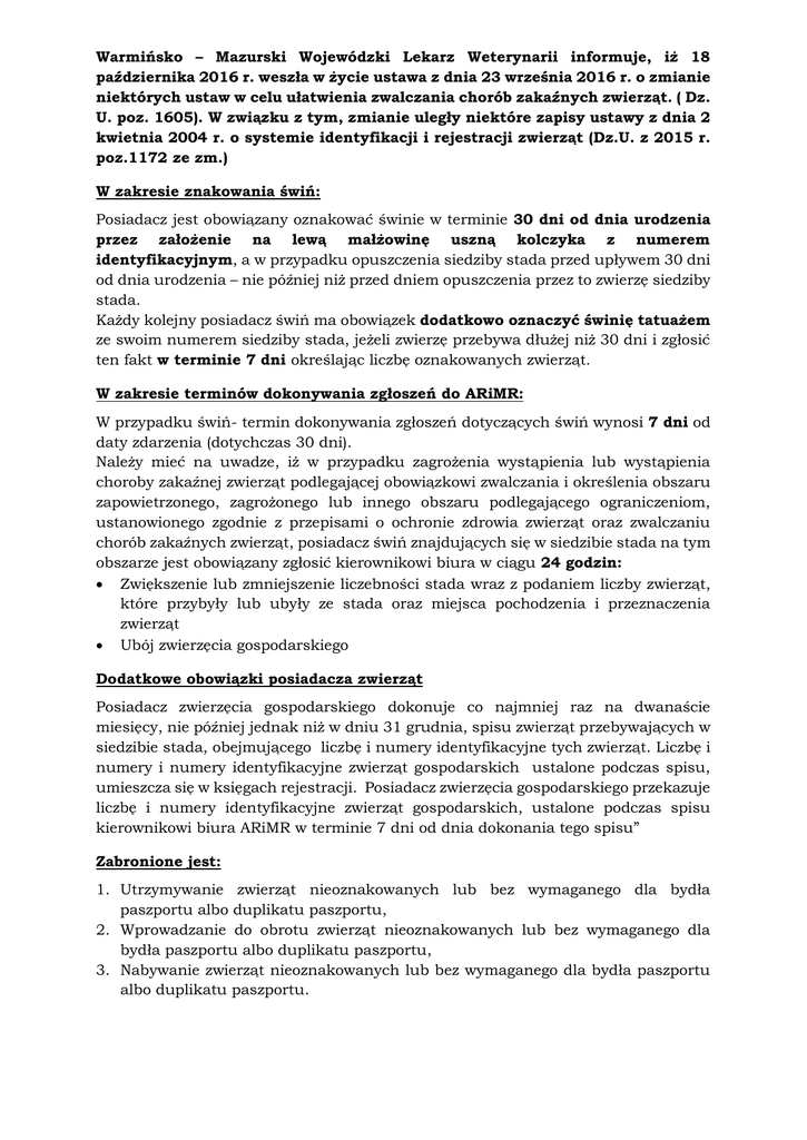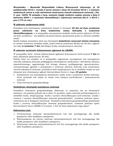 Warmińsko – Mazurski Wojewódzki Lekarz Weterynarii informuje, iż 18 października 2016 r. weszła w życie ustawa z dnia 23 września 2016 r. o zmianie niektórych ustaw w celu ułatwienia zwalczania chorób zakaźnych zwierząt. ( Dz. U. poz. 1605). W związku z tym, zmianie uległy niektóre zapisy ustawy z dnia 2 kwietnia 2004 r. o systemie identyfikacji i rejestracji zwierząt (Dz.U. z 2015 r. poz.1172 ze zm.) W zakresie znakowania świń: Posiadacz jest obowiązany oznakować świnie w terminie 30 dni od dnia urodzenia przez założenie na lewą małżowinę uszną kolczyka z numerem identyfikacyjnym, a w przypadku opuszczenia siedziby stada przed upływem 30 dni od dnia urodzenia – nie później niż przed dniem opuszczenia przez to zwierzę siedziby stada. Każdy kolejny posiadacz świń ma obowiązek dodatkowo oznaczyć świnię tatuażem ze swoim numerem siedziby stada, jeżeli zwierzę przebywa dłużej niż 30 dni i zgłosić ten fakt w terminie 7 dni określając liczbę oznakowanych zwierząt. W zakresie terminów dokonywania zgłoszeń do ARiMR: W przypadku świń- termin dokonywania zgłoszeń dotyczących świń wynosi 7 dni od daty zdarzenia (dotychczas 30 dni). Należy mieć na uwadze, iż w przypadku zagrożenia wystąpienia lub wystąpienia choroby zakaźnej zwierząt podlegającej obowiązkowi zwalczania i określenia obszaru zapowietrzonego, zagrożonego lub innego obszaru podlegającego ograniczeniom, ustanowionego zgodnie z przepisami o ochronie zdrowia zwierząt oraz zwalczaniu chorób zakaźnych zwierząt, posiadacz świń znajdujących się w siedzibie stada na tym obszarze jest obowiązany zgłosić kierownikowi biura w ciągu 24 godzin: Zwiększenie lub zmniejszenie liczebności stada wraz z podaniem liczby zwierząt, które przybyły lub ubyły ze stada oraz miejsca pochodzenia i przeznaczenia zwierząt Ubój zwierzęcia gospodarskiego Dodatkowe obowiązki posiadacza zwierząt Posiadacz zwierzęcia gospodarskiego dokonuje co najmniej raz na dwanaście miesięcy, nie później jednak niż w dniu 31 grudnia, spisu zwierząt przebywających w siedzibie stada, obejmującego liczbę i numery identyfikacyjne tych zwierząt. Liczbę i numery i numery identyfikacyjne zwierząt gospodarskich ustalone podczas spisu, umieszcza się w księgach rejestracji. Posiadacz zwierzęcia gospodarskiego przekazuje liczbę i numery identyfikacyjne zwierząt gospodarskich, ustalone podczas spisu kierownikowi biura ARiMR w terminie 7 dni od dnia dokonania tego spisu” Zabronione jest: 1. Utrzymywanie zwierząt nieoznakowanych lub bez wymaganego dla bydła paszportu albo duplikatu paszportu, 2. Wprowadzanie do obrotu zwierząt nieoznakowanych lub bez wymaganego dla bydła paszportu albo duplikatu paszportu, 3. Nabywanie zwierząt nieoznakowanych lub bez wymaganego dla bydła paszportu albo duplikatu paszportu.