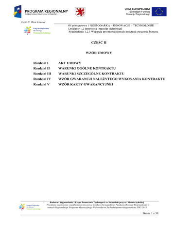 UNIA EUROPEJSKA Europejski Fundusz Rozwoju Regionalnego Część II- Wzór Umowy Oś priorytetowa 1 GOSPODARKA – INNOWACJE – TECHNOLOGIE Działanie 1.2 Innowacje i transfer technologii Poddziałanie 1.2.1 Wsparcie proinnowacyjnych instytucji otoczenia biznesu CZĘŚĆ II WZÓR UMOWY Rozdział I AKT UMOWY Rozdział II WARUNKI OGÓLNE KONTRAKTU Rozdział III WARUNKI SZCZEGÓLNE KONTRAKTU Rozdział IV WZÓR GWARANCJI NALEŻYTEGO WYKONANIA KONTRAKTU Rozdział V WZÓR KARTY GWARANCYJNEJ Strona | 1 Budowa i Wyposażenie I Etapu Pomerania Technopark w Szczecinie przy ul. Niemierzyńskiej Przedmiot zamówienia współfinansowany jest ze środków Europejskiego Funduszu Rozwoju Regionalnego w ramach Regionalnego Programu Operacyjnego Województwa Zachodniopomorskiego na lata 2007-2013 Strona 1 z 50 Strona 1 z 50 UNIA EUROPEJSKA Europejski Fundusz Rozwoju Regionalnego SIWZ Cześć II - Formularz Aktu Umowy CZĘŚĆ II Rozdział I FORMULARZ AKTU UMOWY1 ZAMÓWIENIE FINANSOWANE ZE ŚRODKÓW PUBLICZNYCH, W TYM ZE ŚRODKÓW REGIONALNEGO PROGRAMU OPERACYJNEGO WOJEWÓDZTWA ZACHODNIOPOMORSKIEGO NA LATA 2007 - 2013 Nazwa zamówienia: „Budowa i Wyposażenie I etapu Pomerania Technopark w Szczecinie przy ul. Niemierzyńskiej” KONTRAKT NR: .......................... [wstawić numer Kontraktu]2 Niniejszy Kontrakt zawarty został pomiędzy: Szczeciński Park Naukowo-Technologiczny sp. z o.o. Adres: ul. Niemierzyńska 17a; 71-441 Szczecin (zwanym dalej „Zamawiającym‖) z jednej strony, reprezentowanym przez: ............................................................................................................................... ............................................................................................................................... a ........................................................................................................................................................... ........................................................................................................................................................... adres: ........................................................................................................................................................... (zwanym dalej „Wykonawcą‖) z drugiej strony, reprezentowanym przez: ............................................................................................................................... ............................................................................................................................... Zważywszy, że Zamawiający życzy sobie, aby Roboty określone, jako: „Budowa i Wyposażenie I etapu Pomerania Technopark Parku w Szczecinie przy ul. Niemierzyńskiej” zostały wykonane przez Wykonawcę, oraz że przyjął Ofertę Wykonawcy na wykonanie i wykończenie tych Robót oraz usunięcie w nich wszelkich wad, złożoną w ramach postępowania o udzielenie zamówienia przeprowadzonego zgodnie z ustawą Prawo zamówień publicznych w trybie przetargu nieograniczonego; Niniejszym ustala się, co następuje: 1 Podczas przygotowywania Kontraktu do podpisania przez Zamawiającego i Wykonawcę, którego oferta została wybrana, z dokumentu zatytułowanego „FORMULARZ AKTU UMOWY‖ należy usunąć słowo ‗FORMULARZ‘ i pozostawić AKT UMOWY. 2 Na ogół numer Kontraktu jest tożsamy z numerem zamówienia, należy wstawić go przygotowując Kontrakt do podpisania. Strona | 2 Budowa i Wyposażenie I Etapu Pomerania Technopark w Szczecinie przy ul. Niemierzyńskiej Przedmiot zamówienia współfinansowany jest ze środków Europejskiego Funduszu Rozwoju Regionalnego w ramach Regionalnego Programu Operacyjnego Województwa Zachodniopomorskiego na lata 2007-2013 Strona 2 z 50 Strona 2 z 50 UNIA EUROPEJSKA Europejski Fundusz Rozwoju Regionalnego SIWZ Cześć II - Formularz Aktu Umowy §1 1. Zamawiający zleca, a Wykonawca przyjmuje do wykonania Roboty polegające na realizacji zadania inwestycyjnego pn.: „Budowa i Wyposażenie I etapu Pomerania Technopark w Szczecinie przy ul. Niemierzyńskiej”. 2. Roboty będą realizowane według Warunków kontraktowych FIDIC na budowę dla robót budowlanych i inżynieryjnych projektowanych przez Zamawiającego. §2 1. Słowa i wyrażenia użyte w tej Umowie mają takie samo znaczenie, jakie przypisano im w Warunkach Ogólnych - trzecie wydanie angielsko-polskie niezmienione 2005 (tłumaczenie 1 wydania 1999), wydane przez Fédération Internationale des Ingénieurs-Conseils - FIDIC, Geneva Airport, PO Box 311, CH-1215 Geneva 15, 29 Rue de Pre-Bois, Cointrin, i w Warunkach Szczególnych Kontraktu opracowanych przez Zamawiającego (SIWZ Część II Rozdział III). 2. Szczegółowy zakres robót przedstawiają następujące dokumenty, które będą uważane oraz odczytywane i interpretowane jako część niniejszej Umowy, w następującej kolejności: 1) Niniejszy Akt Umowy, 2) Warunki Szczególne Kontraktu, 3) Warunki Ogólne Kontraktu, 4) Dokumentacja Projektowa (Specyfikacje techniczne wykonania i odbioru robót budowlanych, projekt budowlany, projekt wykonawczy, przedmiar robót), 5) Oferta Wykonawcy. 3. Wszelkie uzupełnienia winny być odczytywane w takiej samej kolejności jak dokumenty, które modyfikują. §3 1. Przedstawicielem Wykonawcy przy realizacji Robót jest ……………………………… tel.: ……. 2. Przedstawicielem Zamawiającego przy realizacji Robót jest inż. Lech Bartnik, tel. 604 28 00 25. 3. Inżynierem Kontraktu przy realizacji Robót jest Przedsiębiorstwo Obsługi Inwestycji Sp. z o.o., z siedzibą w Stargardzie Szczecińskim (73-110), ul. Wojska Polskiego 119 - który będzie pełnić funkcję Inspektora Nadzoru inwestorskiego, zgodnie z przepisami Prawa Budowlanego oraz inne funkcje i czynności wynikające z Warunków Szczególnych i Ogólnych Kontraktu. Przedstawicielem Inżyniera Kontraktu przy realizacji Robot jest Kierownik Zespołu: …………………………