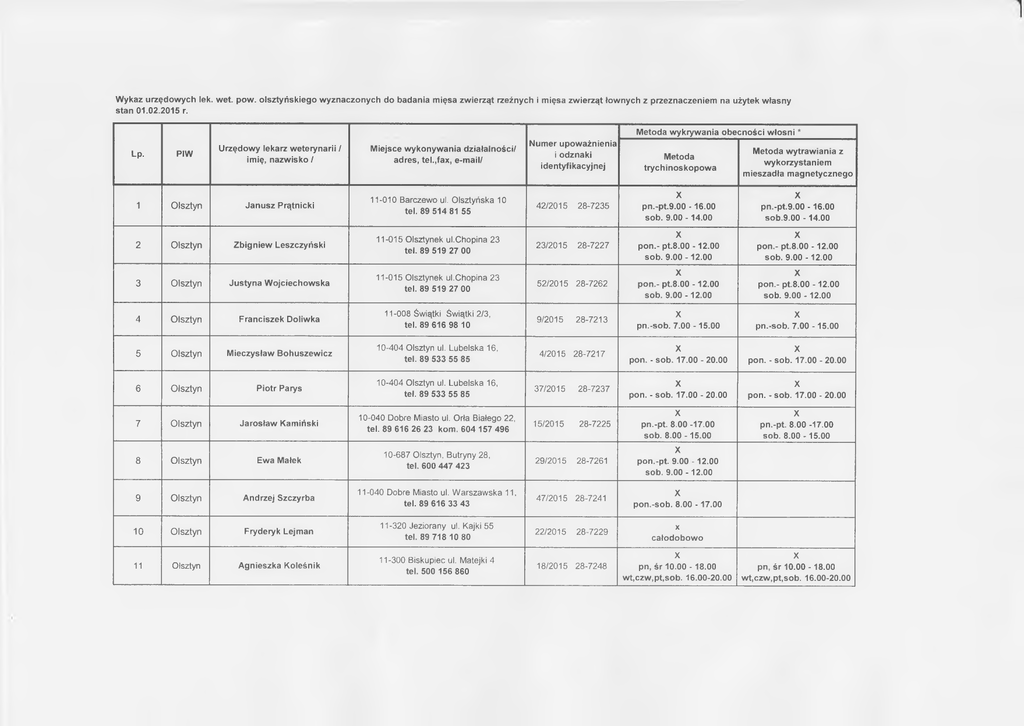 Wykaz urzędowych lek. wet. pow. olsztyńskiego wyznaczonych do badania mięsa zwierząt rzeźnych i mięsa zwierząt łownych z przeznaczeniem na użytek własny stan 01.02.2015 r. Metoda wykrywania obecności włośni * Numer upoważnienia i odznaki identyfikacyjnej Lp. PIW Urzędowy lekarz weterynarii / imię, nazwisko / 1 O lsztyn Janusz Prątnicki 11-010 Barczewo ul. Olsztyńska 10 tel. 89 514 81 55 42/2015 2 O lsztyn Zbigniew Leszczyński 11-015 Olsztynek ul.Chopina 23 tel. 89 519 27 00 3 O lsztyn Justyna W ojciechowska 11-015 Olsztynek ul.Chopina 23 tel. 89 519 27 00 4 O lsztyn Franciszek Doliwka 11-008 Świątki Świątki 2/3, tel. 89 616 98 10 5 O lsztyn Mieczysław Bohuszewicz 10-404 Olsztyn ul. Lubelska 16, tel. 89 533 55 85 4/2015 6 O lsztyn Piotr Parys 10-404 Olsztyn ul. Lubelska 16, tel. 89 533 55 85 37/2015 7 O lsztyn Jarosław Kamiński 10-040 Dobre Miasto ul. Orła Białego 22, tel. 89 616 26 23 kom. 604 157 496 15/2015 8 O lsztyn Ewa Małek 10-687 Olsztyn, Butryny 28, tel. 600 447 423 29/2015 28-7261 X pon.-pt. 9.00 -1 2.00 sob. 9 .0 0 -1 2 .0 0 9 O lsztyn Andrzej Szczyrba 11-040 Dobre Miasto ul. Warszawska 11, tel. 89 616 33 43 47/2015 28-7241 X pon.-sob. 8.00 -1 7.00 10 O lsztyn Fryderyk Lejman 11-320 Jeziorany ul. Kajki 55 tel. 89 718 10 80 22/2015 28-7229 11 Olsztyn Agnieszka Koleśnik 11-300 Biskupiec ul. Matejki 4 tel. 500 156 860 18/2015 28-7248 Miejsce wykonywania działalności/ adres, telefax, e-mail/ Metoda trychinoskopowa Metoda wytrawiania z wykorzystaniem mieszadła magnetycznego 28-7235 X pn.-pt.9.00 -1 6.00 sob. 9.00 -1 4.00 X pn.-pt.9.00 -1 6 .0 0 sob.9.00 -1 4.00 23/2015 28-7227 X pon.- pt.8.00 -1 2.00 sob. 9.00 -1 2 .0 0 X pon.- pt.8.00 -1 2.00 sob. 9 .0 0 -1 2 .0 0 52/2015 28-7262 X pon.- pt.8.00 -1 2.00 sob. 9 .0 0 -1 2 .0 0 X pon.- pt.8.00 -1 2.00 sob. 9.00 -1 2.00 9/2015 28-7213 X pn.-sob. 7.00 -1 5.00 X pn.-sob. 7.00 -1 5.00 X pon. - sob. 17.00 - 20.00 X pon. - sob. 17.00 - 20.00 28-7237 X pon. - sob. 17.00 - 20.00 X pon. - sob. 17.00 - 20.00 28-7225 X pn.-pt. 8.00 -17.00 sob. 8 .0 0 -1 5 .0 0 X pn.-pt. 8.00 -17.00 sob. 8 .0 0 -1 5 .0 0 28-7217 X całodobowo X pn, śr 10.00 - 18.00 wt,czw,pt,sob. 16.00-20.00 X pn, śr 10.00 -1 8.00 wt,czw,pt,sob. 16.00-20.00