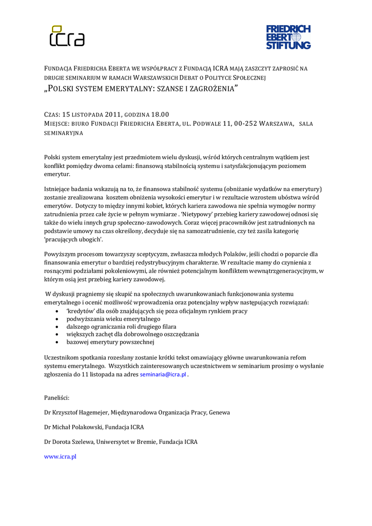 FUNDACJA FRIEDRICHA EBERTA WE WSPÓ PRACY Z FUNDACJ ICRA MAJ ZASZCZYT ZAPROSI NA DRUGIE SEMINARIUM W RAMACH WARSZAWSKICH DEBAT O POLITYCE SPO ECZNEJ „POLSKI SYSTEM EMERYTALNY: SZANSE I ZAGRO ENIA” C ZAS : 15 LISTOPADA 2011, GODZINA 18.00 M IEJSCE : BIURO FUNDACJI FRIEDRICHA E BERTA , UL . P ODWALE 11, 00-252 W ARSZAWA , SALA SEMINARYJNA Polski system emerytalny jest przedmiotem wielu dyskusji, w ród których centralnym w tkiem jest konflikt pomi dzy dwoma celami: finansow stabilno ci systemu i satysfakcjonuj cym poziomem emerytur. Istniej ce badania wskazuj na to, e finansowa stabilno systemu (obni anie wydatków na emerytury) zostanie zrealizowana kosztem obni enia wysoko ci emerytur i w rezultacie wzrostem ubóstwa w ród emerytów. Dotyczy to mi dzy innymi kobiet, których kariera zawodowa nie spe nia wymogów normy zatrudnienia przez ca e ycie w pe nym wymiarze . ‘Nietypowy’ przebieg kariery zawodowej odnosi si tak e do wielu innych grup spo eczno-zawodowych. Coraz wi cej pracowników jest zatrudnionych na podstawie umowy na czas okre lony, decyduje si na samozatrudnienie, czy te zasila kategori ‘pracuj cych ubogich’. Powy szym procesom towarzyszy sceptycyzm, zw aszcza m odych Polaków, je li chodzi o poparcie dla finansowania emerytur o bardziej redystrybucyjnym charakterze. W rezultacie mamy do czynienia z rosn cymi podzia ami pokoleniowymi, ale równie potencjalnym konfliktem wewn trzgeneracycjnym, w którym osi jest przebieg kariery zawodowej. W dyskusji pragniemy si skupi na spo ecznych uwarunkowaniach funkcjonowania systemu emerytalnego i oceni mo liwo wprowadzenia oraz potencjalny wp yw nast puj cych rozwi za : ‘kredytów’ dla osób znajduj cych si poza oficjalnym rynkiem pracy podwy szania wieku emerytalnego dalszego ograniczania roli drugiego filara wi kszych zach t dla dobrowolnego oszcz dzania bazowej emerytury powszechnej Uczestnikom spotkania rozes any zostanie krótki tekst omawiaj cy g ówne uwarunkowania refom systemu emerytalnego. Wszystkich zainteresowanych uczestnictwem w seminarium prosimy o wys anie zg oszenia do 11 listopada na adres [email protected] . Paneli ci: Dr Krzysztof Hagemejer, Mi dzynarodowa Organizacja Pracy, Genewa Dr Micha Polakowski, Fundacja ICRA Dr Dorota Szelewa, Uniwersytet w Bremie, Fundacja ICRA www.icra.pl