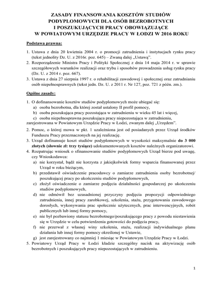 ZASADY FINANSOWANIA KOSZTÓW STUDIÓW PODYPLOMOWYCH DLA OSÓB BEZROBOTNYCH I POSZUKUJĄCYCH PRACY OBOWIĄZUJĄCE W POWIATOWYM URZĘDZIE PRACY W ŁODZI W 2016 ROKU Podstawa prawna: 1. Ustawa z dnia 20 kwietnia 2004 r. o promocji zatrudnienia i instytucjach rynku pracy (tekst jednolity Dz. U. z 2016r. poz. 645) – Zwaną dalej „Ustawą”. 2. Rozporządzenie Ministra Pracy i Polityki Społecznej z dnia 14 maja 2014 r. w sprawie szczegółowych warunków realizacji oraz trybu i sposobów prowadzenia usług rynku pracy (Dz. U. z 2014 r. poz. 667). 3. Ustawa z dnia 27 sierpnia 1997 r. o rehabilitacji zawodowej i społecznej oraz zatrudnianiu osób niepełnosprawnych (tekst jedn. Dz. U. z 2011 r. Nr 127, poz. 721 z późn. zm.). Ogólne zasady: 1. O dofinansowanie kosztów studiów podyplomowych może ubiegać się: a) osoba bezrobotna, dla której został ustalony II profil pomocy, b) osoba poszukująca pracy pozostająca w zatrudnieniu w wieku 45 lat i więcej, c) osoba niepełnosprawna poszukująca pracy niepozostająca w zatrudnieniu, zarejestrowana w Powiatowym Urzędzie Pracy w Łodzi, zwanym dalej „Urzędem”. 2. Pomoc, o której mowa w pkt. 1 uzależniona jest od posiadanych przez Urząd środków Funduszu Pracy przeznaczonych na jej realizację. 3. Urząd dofinansuje koszt studiów podyplomowych w wysokości maksymalnie do 3 000 złotych (słownie zł: trzy tysiące) udokumentowanych kosztów należnych organizatorowi. 4. Rozpatrując wniosek o sfinansowanie studiów podyplomowych Urząd bierze pod uwagę, czy Wnioskodawca: a) nie korzystał, bądź nie korzysta z jakiejkolwiek formy wsparcia finansowanej przez Urząd w roku bieżącym, b) przedstawił oświadczenie pracodawcy o zamiarze zatrudnienia osoby bezrobotnej/ poszukującej pracy po ukończeniu studiów podyplomowych, c) złożył oświadczenie o zamiarze podjęcia działalności gospodarczej po ukończeniu studiów podyplomowych, d) nie odmówił bez uzasadnionej przyczyny podjęcia propozycji odpowiedniego zatrudnienia, innej pracy zarobkowej, szkolenia, stażu, przygotowania zawodowego dorosłych, wykonywania prac społecznie użytecznych, prac interwencyjnych, robót publicznych lub innej formy pomocy, e) nie był pozbawiony statusu bezrobotnego/poszukującego pracy z powodu niestawienia się w Urzędzie w celu potwierdzenia gotowości do podjęcia pracy, f) nie przerwał z własnej winy szkolenia, stażu, realizacji indywidualnego planu działania lub innej formy pomocy określonej w Ustawie, g) jest zarejestrowany co najmniej 1 miesiąc w Powiatowym Urzędzie Pracy w Łodzi. 5. Powiatowy Urząd Pracy w Łodzi kładzie szczególny nacisk na aktywizację osób bezrobotnych i poszukujących pracy niepozostających w zatrudnieniu. 1 6. Bezrobotnemu oraz osobie niepełnosprawnej poszukującej pracy niepozostającej w zatrudnieniu, której starosta przyznał dofinansowanie, a która w trakcie ich odbywania podjęła zatrudnienie, inną pracę zarobkową lub działalność gospodarczą, przysługuje odszkodowanie z tytułu ubezpieczenia od następstw nieszczęśliwych wypadków powstałych w związku ze studiami podyplomowymi oraz w drodze do miejsca studiów i z powrotem, wypłacane przez instytucję ubezpieczeniową, w której osoby te zostały ubezpieczone. 7. W przypadku osób poszukujących pracy wymagane jest dołączenie do wniosku dokumentu (np. w formie zaświadczenia) potwierdzającego wskazane poniżej okoliczności: a) znajdowanie się w okresie wypowiedzenia stosunku pracy lub stosunku służbowego z przyczyn dotyczących zakładu pracy, b) zatrudnienie u pracodawcy, wobec którego ogłoszono upadłość lub który jest w stanie likwidacji, z wyłączeniem likwidacji w celu prywatyzacji, c) otrzymywanie świadczenie socjalne przysługujące na urlopie górniczym lub górniczy zasiłek socjalny, określone w odrębnych przepisach, d) uczestniczenie w zajęciach w centrum integracji społecznej lub indywidualnym programie integracji, o którym mowa w przepisach o pomocy społecznej, e) posiadanie statusu żołnierzem rezerwy, f) pobieranie renty szkoleniowej, g) pobieranie świadczenia szkoleniowego, o którym mowa w art. 70 ust. 6, h) podleganie ubezpieczeniu społecznemu rolników w pełnym zakresie na podstawie przepisów o ubezpieczeniu społecznym rolników jako domownik lub małżonek rolnika, jeżeli zamierza podjąć zatrudnienie, inną pracę zarobkową lub działalność gospodarczą poza rolnictwem i) zatrudnienie lub wykonywanie innej pracy zarobkowej lub prowadzenie działalności gospodarczej w przypadku osób w wieku 45 lat i więcej, zainteresowanych pomocą w rozwoju zawodowym. Procedura przyznawania finansowania kosztów studiów podyplomowych: 1. Złożenie kompletnego Wniosku o dofinansowanie kosztów studiów podyplomowych wraz z załącznikami. O sposobie rozpatrzenia wniosku Powiatowy Urząd Pracy w Łodzi informuje w terminie 30 dni od dnia złożenia Wniosku. 2. Wniosek opiniowany jest pod względem formalnym i merytorycznym przez Doradcę Klienta. 3. Wniosek opiniowany jest przez Komisję ds. rozpatrywania wniosków o skierowanie na szkolenie wskazane przez bezrobotnego/poszukującego pracy, oraz wniosków osób bezrobotnych/ poszukujących pracy o dofinansowanie kosztów studiów podyplomowych, 4. Decyzja Dyrektora Powiatowego Urzędu Pracy w Łodzi. 5. W przypadku pozytywnego rozpatrzenia Wniosku zawierana jest umowa o dofinansowanie kosztu studiów podyplomowych. Podpisanie umowy poprzedzone jest złożeniem przez osobę bezrobotną/poszukująca pracy: a) zaświadczenia z uczelni potwierdzającego zakwalifikowanie na wybrany kierunek studiów podyplomowych wraz z wyraźnie określoną datą rozpoczęcia i zakończenia nauki (dzień, miesiąc, rok), b) informacji o wysokości opłat oraz systemie płatności (jednorazowo, ratalnie), c) harmonogramu zajęć, 2 d) przedstawienia płatności pozostałej kwoty stanowiącej różnicę pomiędzy pełnym kosztem studiów podyplomowych a pr