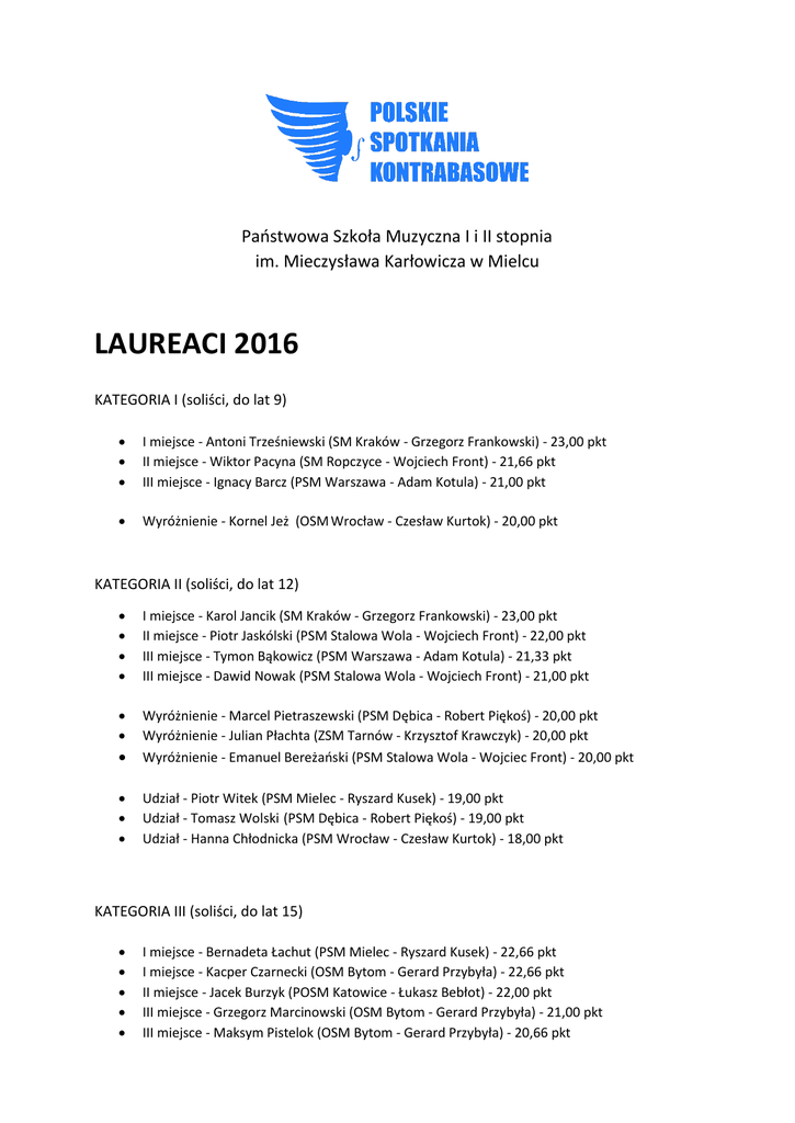 Państwowa Szkoła Muzyczna I i II stopnia im. Mieczysława Karłowicza w Mielcu LAUREACI 2016 KATEGORIA I (soliści, do lat 9) I miejsce - Antoni Trześniewski (SM Kraków - Grzegorz Frankowski) - 23,00 pkt II miejsce - Wiktor Pacyna (SM Ropczyce - Wojciech Front) - 21,66 pkt III miejsce - Ignacy Barcz (PSM Warszawa - Adam Kotula) - 21,00 pkt Wyróżnienie - Kornel Jeż (OSM Wrocław - Czesław Kurtok) - 20,00 pkt KATEGORIA II (soliści, do lat 12) I miejsce - Karol Jancik (SM Kraków - Grzegorz Frankowski) - 23,00 pkt II miejsce - Piotr Jaskólski (PSM Stalowa Wola - Wojciech Front) - 22,00 pkt III miejsce - Tymon Bąkowicz (PSM Warszawa - Adam Kotula) - 21,33 pkt III miejsce - Dawid Nowak (PSM Stalowa Wola - Wojciech Front) - 21,00 pkt Wyróżnienie - Marcel Pietraszewski (PSM Dębica - Robert Piękoś) - 20,00 pkt Wyróżnienie - Julian Płachta (ZSM Tarnów - Krzysztof Krawczyk) - 20,00 pkt Wyróżnienie - Emanuel Bereżański (PSM Stalowa Wola - Wojciec Front) - 20,00 pkt Udział - Piotr Witek (PSM Mielec - Ryszard Kusek) - 19,00 pkt Udział - Tomasz Wolski (PSM Dębica - Robert Piękoś) - 19,00 pkt Udział - Hanna Chłodnicka (PSM Wrocław - Czesław Kurtok) - 18,00 pkt KATEGORIA III (soliści, do lat 15) I miejsce - Bernadeta Łachut (PSM Mielec - Ryszard Kusek) - 22,66 pkt I miejsce - Kacper Czarnecki (OSM Bytom - Gerard Przybyła) - 22,66 pkt II miejsce - Jacek Burzyk (POSM Katowice - Łukasz Bebłot) - 22,00 pkt III miejsce - Grzegorz Marcinowski (OSM Bytom - Gerard Przybyła) - 21,00 pkt III miejsce - Maksym Pistelok (OSM Bytom - Gerard Przybyła) - 20,66 pkt Wyróżnienie I stopnia - Weronika Adamska (PSM Mielec - Ryszard Kusek) - 20,33 pkt Wyróżnienie I stopnia - Michał Wermiński (PSM Sanok - Wojciech Gąbka) - 20,33 pkt Wyróżnienie I stopnia - Adam Kadłubiec (OSM Bytom - Gerard Przybyła) - 20,33 pkt Wyróżnienie II stopnia - Mateusz Wyszyński (POSM Katowice - Łukasz Bebłot) - 19,66 pkt Udział - Ignacy Tryboń (SM Kraków - Grzegorz Frankowski) - 19,00 pkt Udział - Julia Walecka (PSM Mielec - Ryszard Kusek) - 18,66 pkt Udział - Jakub Smoleń (SM Mikluszowice - Mateusz Grzybek) - 18,00 pkt KATEGORIA IV (soliści, do lat 18) I miejsce z wyr. - Artur Łukasik (ZSM Tarnów - Krzysztof Krawczyk) - 24,00 pkt I miejsce - Krzysztof Kostrzewski (POSM Katowice - Łukasz Bebłot) - 22,66 pkt II miejsce - Zuzanna Garbacz (OSM Łódź - Grzegorz Wieczorek - 22,00 pkt II miejsce - Karol Lecybil (OSM Bytom - Krzysztof Korzeń - 22,00 pkt III miejsce - Konrad Sosiński (PSM Mielec - Ryszard Kusek) - 21,00 pkt III miejsce - Wiktoria Janik (POSM Katowice - Łukasz Bebłot - 21,00 pkt Wyróżnienie I stopnia - Wiktor Pacan (OSM Bytom - Gerard Przybyła) - 20,33 pkt Wyróżnienie I stopnia - Szymon Pokrzycki (PSM Poznań - Joanna Markiewicz) - 20,00 pkt Wyróżnienie II stopnia - Konrad Rybak (PSM Warszawa - Adam Kotula) - 19,66 pkt Wyróżnienie II stopnia - Paweł Eszyk (POSM Katowice - Łukasz Bebłot) - 19,66 pkt Udział - Mikołaj Sikora (ZSM Tarnów - Krzysztof Krawczyk) - 19,00 pkt Udział - Aleksandra Łobodzińska (ZSM Rzeszów - Paweł Drzał) - 18,00 pkt Udział - Dominik Naziębło (OSM Bytom - Krzysztof Korzeń) - 17,33 pkt KATEGORIA V (soliści do 21 lat) I miejsce - Magdalena Maziarz (AM Katowice - Jan Kotula) - 23,00 pkt II miejsce - Maciej Dobrzański (UMFC Warszawa - Adam Bogacki) - 22,00 pkt II miejsce - Mateusz Szewczyk (AM Katowice - Waldemar Tamowski) - 22,00 pkt III miejsce - Agata Zielińska (AM Gdańsk - Leszek Sokołowski) - 21,00 pkt III miejsce - Karolina Cedro (AM Katowice - Jan Kotula) - 21,00 pkt III miejsce - Artur Kubik (POSM Katowice - Łukasz Bebłot) - 21,00 pkt III miejsce - Oskar Krawiecki (POSM Poznań - Joanna Markiewicz) - 21,00 pkt III miejsce - Kamil Biadała (AM Łódź - Grzegorz Wieczorek) - 21,00 pkt Wyróżnienie I stopnia - Natalia Midek (OSM Wrocław - Czesław Kurtok) - 20,66 pkt Wyróżnienie II stopnia - Agnieszka Detko (PSM Warszawa - Adam Kotula) - 20,00 pkt Wyróżnienie II stopnia - Krzysztof Kuk (UMFC Warszawa - Leszek Sokołowski) - 20,00 pkt Wyróżnienie II stopnia - Piotr Dutkiewicz (PSM Warszawa - Adam Kotula) - 19,66 pkt