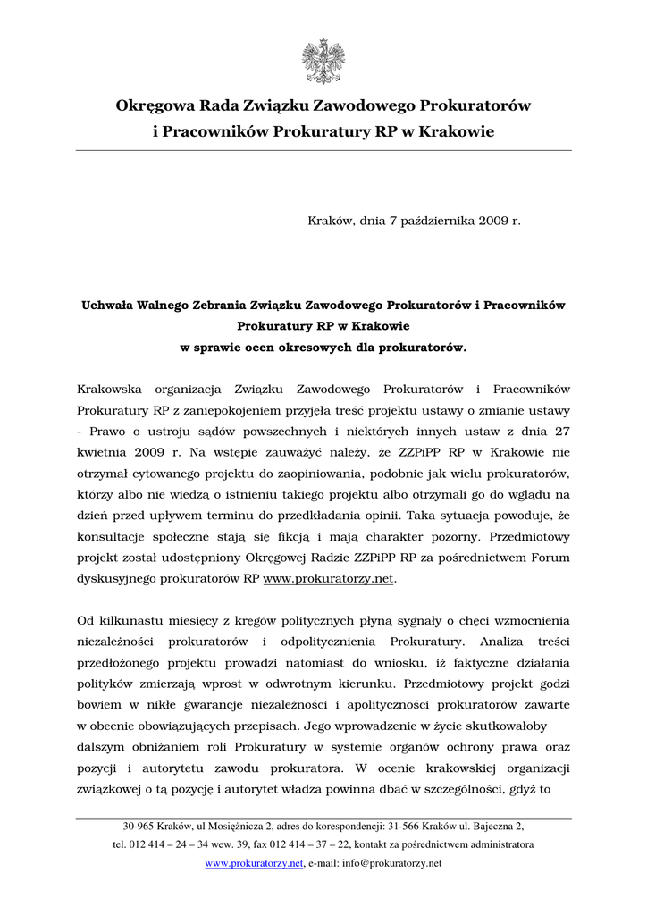 Okręgowa Rada Związku Zawodowego Prokuratorów i Pracowników Prokuratury RP w Krakowie Kraków, dnia 7 października 2009 r. Uchwała Walnego Zebrania Związku Zawodowego Prokuratorów i Pracowników Prokuratury RP w Krakowie w sprawie ocen okresowych dla prokuratorów. Krakowska organizacja Związku Zawodowego Prokuratorów i Pracowników Prokuratury RP z zaniepokojeniem przyjęła treść projektu ustawy o zmianie ustawy - Prawo o ustroju sądów powszechnych i niektórych innych ustaw z dnia 27 kwietnia 2009 r. Na wstępie zauwaŜyć naleŜy, Ŝe ZZPiPP RP w Krakowie nie otrzymał cytowanego projektu do zaopiniowania, podobnie jak wielu prokuratorów, którzy albo nie wiedzą o istnieniu takiego projektu albo otrzymali go do wglądu na dzień przed upływem terminu do przedkładania opinii. Taka sytuacja powoduje, Ŝe konsultacje społeczne stają się fikcją i mają charakter pozorny. Przedmiotowy projekt został udostępniony Okręgowej Radzie ZZPiPP RP za pośrednictwem Forum dyskusyjnego prokuratorów RP www.prokuratorzy.net. Od kilkunastu miesięcy z kręgów politycznych płyną sygnały o chęci wzmocnienia niezaleŜności prokuratorów i odpolitycznienia Prokuratury. Analiza treści przedłoŜonego projektu prowadzi natomiast do wniosku, iŜ faktyczne działania polityków zmierzają wprost w odwrotnym kierunku. Przedmiotowy projekt godzi bowiem w nikłe gwarancje niezaleŜności i apolityczności prokuratorów zawarte w obecnie obowiązujących przepisach. Jego wprowadzenie w Ŝycie skutkowałoby dalszym obniŜaniem roli Prokuratury w systemie organów ochrony prawa oraz pozycji i autorytetu zawodu prokuratora. W ocenie krakowskiej organizacji związkowej o tą pozycję i autorytet władza powinna dbać w szczególności, gdyŜ to 30-965 Kraków, ul MosięŜnicza 2, adres do korespondencji: 31-566 Kraków ul. Bajeczna 2, tel. 012 414 – 24 – 34 wew. 39, fax 012 414 – 37 – 22, kontakt za pośrednictwem administratora www.prokuratorzy.net, e-mail: [email protected] Okręgowa Rada Związku Zawodowego Prokuratorów i Pracowników Prokuratury RP w Krakowie Prokuratura i prokuratorzy maja stać na straŜy praworządności, realizując zadania w zakresie zwalczania przestępczości kryminalnej i gospodarczej. Jedynym zobiektywizowanym kryterium oceny pracy prokuratora jest kontrola przeprowadzana przez niezawisłe sądy. To w postępowaniu sądowym w obu instancjach, niezawisły sąd moŜe ocenić wynik pracy niezaleŜnego prokuratora. Ocena ta nie jest obarczona względami pozamerytorycznymi, które mogą mieć wpływ na ocenę wydawaną przez podmioty umiejscowione w strukturze Prokuratury. Takimi podmiotami są bez wątpienia prokuratorzy bezpośrednio przełoŜeni oraz wizytatorzy. JeŜeli chodzi o pierwszą kategorię, w praktyce funkcjonowania Prokuratury, nie są odosobnionymi przypadki róŜnicy zdań pomiędzy prokuratorem prowadzącym postępowanie i jego przełoŜonym. Ustawa o prokuraturze zawiera mechanizmy eliminowania tych róŜnic ale z zachowaniem zasady niezaleŜności w toku postępowania przygotowawczego. Zasada ta stanowi fundament funkcjonowania Prokuratury. Tymczasem proponowane przez projekt mechanizmy weryfikacji prowadzić mogą w określonych przypadkach do złamania ustawowych gwarancji dysponował, niejako niezaleŜności. dodatkowym Prokurator elementem przełoŜony będzie dyscyplinującym bowiem niezaleŜnego i samodzielnego prokuratora w postaci moŜliwości wydawania oceny, która w konsekwencji moŜe mieć decydujące znaczenie dla pozycji opiniowanego, a zwłaszcza moŜliwości jego awansu w strukturze organizacyjnej prokuratury, jak równieŜ awansu finansowego polegającego na nabywaniu kolejnych stawek awansowych w ustawowych terminach. W praktyce funkcjonowania Prokuratury częstymi są przypadki, w których niezaleŜni, dysponujący duŜą swobodą decyzyjną prokuratorzy, którzy potrafią w sposób zdecydowany i dynamiczny prowadzić postępowania przygotowawcze, nie naleŜą do „ulubieńców” prokuratorów przełoŜonych. Taka sytuacja moŜe mieć istotny wpływ na rodzaj wydawanej przez prokuratorów bezpośrednio przełoŜonych oceny. 30-965 Kraków, ul MosięŜnicza 2, adres do korespondencji: 31-566 Kraków ul. Bajeczna 2, tel. 012 414 – 24 – 34 wew. 39, fax 012 414 – 37 – 22, kontakt za pośrednictwem administratora www.prokuratorzy.net, e-mail: [email protected] Okręgowa Rada Związku Zawodowego Prokuratorów i Pracowników Prokuratury RP w Krakowie Drugą kategoria wskazywanych przez projekt podmiotów – wizytatorzy, to najczęściej prokuratorzy oderwani od wielu lat od prokuratorskiej praktyki i nie znający aktualnej specyfiki prowadzenia postępowań przygotowawczych. Stąd teŜ system oceny prokuratorów naleŜy ograniczyć do oceny dokonywanej przez sąd połączonej z juŜ dziś funkcjonującymi mechanizmami lustracji, wizytacji, nadzoru słuŜbowego jak i opiniowania prokuratorów przez ciała kolegialne. Realizacja załoŜeń opiniowanego projektu doprowadziłaby do powstania zupełnie zbytecznej, swoistej „armii” prokuratorów kontrolerów, którzy zamiast realizować zadania w zakresie zwalczania przestępczości prowadziliby działalność o charakterze audytorskim. Przy funkcjonującej kontroli niezawisłych sądów, tworzenie takiego systemu byłoby sprzeczne z dobrze pojmowaną ekonomiką funkcjonowania szeroko rozumianego wymiaru sprawiedliwości. Proponowany system kontroli jest ekonomicznie (w wymiarze procesowym i finansowym) nieuzasadniony. Licznych prokuratorów kontrolujących i wizytujących, którzy zapewne rozmnoŜyliby się po jego wprowadzeniu, naleŜy bowiem skierować do pracy liniowej, a wiec tej, w której realizuje się zadania Prokuratury, a ocenę tej pracy pozostawić sądownictwu. Wprowadzenie takiego systemu bez wątpienia dezorganizowałoby pracę prokuratorów i spowalniało prowadzone postępowania. Niezwykle istotnym aspektem dyskwalifikującym projekt jest niemo