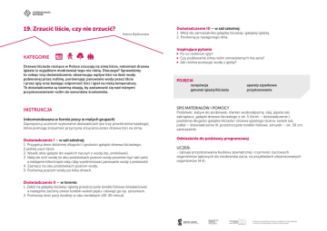 19. Zrzucić liście, czy nie zrzucić? Doświadczenie III – w sali szkolnej: Hanna Będkowska 1. Włóż do zamrażalnika gałązkę liściastą i gałązkę iglastą. 2. Porównaj je następnego dnia. Inspirujące pytania KATEGORIE Drzewa liściaste rosnące w Polsce zrzucają na zimę liście, natomiast drzewa iglaste (z wyjątkiem modrzewia) tego nie robią. Dlaczego? Sprawdzimy to robiąc trzy doświadczenia: obserwując wpływ liści na ilość wody pobieranej przez roślinę, porównując parowanie wody przez liście i przez igły oraz badając odporność liści i igieł na niską temperaturę. Te doświadczenia są świetną okazją, by zastanowić się nad różnymi przystosowaniami roślin do warunków środowiska. INSTRUKCJA (rekomendowana w formie pracy w małych grupach) Zaproponuj uczniom wykonanie doświadczeń (po trzy powtórzenia każdego), które pomogą zrozumieć przyczynę zrzucania przez drzewa liści na zimę. Doświadczenie I – w sali szkolnej: 1. Przygotuj dwie zbliżonej długości i grubości gałązki drzewa liściastego. Z jednej usuń liście. 2. Wsadź obie gałązki do wąskich naczyń z wodą (np. probówek). 3. Nalej do nich wodę (w obu probówkach poziom wody powinien być taki sam), a następnie kilka kropel oleju (aby wyeliminować parowanie wody z probówki). 4. Zaznacz na obu probówkach poziom wody. 5. Porównaj poziom wody po kilku dniach. Po co roślinom igły? Czy podlewanie zimą roślin zimozielonych ma sens? Jak roślina pompuje wodę z gleby? POJĘCIA ranspiracjaaparaty szparkowe gatunek iglasty/liściastyprzystosowanie SPIS MATERIAŁÓW I POMOCY Probówki, statyw do probówek, marker wodoodporny, olej, pipeta lub zakraplacz, gałązki drzewa liściastego z ok. 5 liśćmi – doświadczenie I, podobnej długości gałązka liściasta i drzewa iglastego (sosna, świerk lub jodła) – doświadczenie III, przeźroczyste torebki foliowe, sznurek – ok. 30 cm, zamrażalnik. Odniesienie do podstawy programowej UCZEŃ: - opisuje przystosowania budowy zewnętrznej i czynności życiowych organizmów lądowych do środowiska życia, na przykładach obserwowanych organizmów (4.4). Doświadczenie II – w terenie: 1. Załóż na gałązkę liściastą i iglastą przeźroczyste torebki foliowe (śniadaniowe), a następnie zaciśnij otwór torebki wokół pędu i obwiąż go np. sznurkiem. 2. Porównaj ilość pary wodnej w obu torebkach (20-30 minut). Projekt jest współfinansowany ze środków Unii Europejskiej w ramach Europejskiego Funduszu Społecznego.