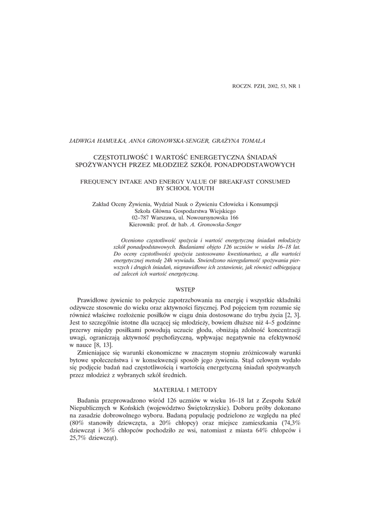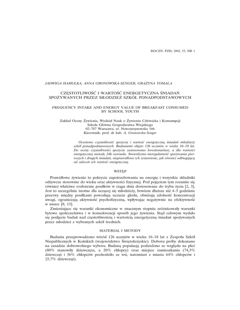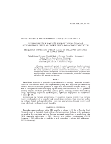 ROCZN. PZH, 2002, 53, NR 1 JADWIGA HAMUŁKA, ANNA GRONOWSKA-SENGER, GRAŻYNA TOMALA CZĘSTOTLIWOŚĆ I WARTOŚĆ ENERGETYCZNA ŚNIADAŃ SPOŻYWANYCH PRZEZ MŁODZIEŻ SZKÓŁ PONADPODSTAWOWYCH FREQUENCY INTAKE AND ENERGY VALUE OF BREAKFAST CONSUMED BY SCHOOL YOUTH Zakład Oceny Żywienia, Wydział Nauk o Żywieniu Człowieka i Konsumpcji Szkoła Główna Gospodarstwa Wiejskiego 02–787 Warszawa, ul. Nowoursynowska 166 Kierownik: prof. dr hab. A. Gronowska-Senger Oceniono częstotliwość spożycia i wartość energetyczną śniadań młodzieży szkół ponadpodstawowych. Badaniami objęto 126 uczniów w wieku 16–18 lat. Do oceny częstotliwości spożycia zastosowano kwestionariusz, a dla wartości energetycznej metodę 24h wywiadu. Stwierdzono nieregularność spożywania pierwszych i drugich śniadań, nieprawidłowe ich zestawienie, jak również odbiegającą od zaleceń ich wartość energetyczną. WSTĘP Prawidłowe żywienie to pokrycie zapotrzebowania na energię i wszystkie składniki odżywcze stosownie do wieku oraz aktywności fizycznej. Pod pojęciem tym rozumie się również właściwe rozłożenie posiłków w ciągu dnia dostosowane do trybu życia [2, 3]. Jest to szczególnie istotne dla uczącej się młodzieży, bowiem dłuższe niż 4–5 godzinne przerwy między posiłkami powodują uczucie głodu, obniżają zdolność koncentracji uwagi, ograniczają aktywność psychofizyczną, wpływając negatywnie na efektywność w nauce [8, 13]. Zmieniające się warunki ekonomiczne w znacznym stopniu zróżnicowały warunki bytowe społeczeństwa i w konsekwencji sposób jego żywienia. Stąd celowym wydało się podjęcie badań nad częstotliwością i wartością energetyczną śniadań spożywanych przez młodzież z wybranych szkół średnich. MATERIAŁ I METODY Badania przeprowadzono wśród 126 uczniów w wieku 16–18 lat z Zespołu Szkół Niepublicznych w Końskich (województwo Świętokrzyskie). Doboru próby dokonano na zasadzie dobrowolnego wyboru. Badaną populację podzielono ze względu na płeć (80% stanowiły dziewczęta, a 20% chłopcy) oraz miejsce zamieszkania (74,3% dziewcząt i 36% chłopców pochodziło ze wsi, natomiast z miasta 64% chłopców i 25,7% dziewcząt). Nr 1 Spożywanie śniadań przez młodzież szkół ponadpodstawowych 65 Ocenę częstotliwości spożycia pierwszych i drugich śniadań przeprowadzono wykorzystując kwestionariusz zawierający pytania odnośnie spożywania śniadań, rodzaju konsumowanych produktów, przyczyn niejedzenia śniadań itp. Do oceny wartości energetycznej śniadań zastosowano metodę 24 h wywiadu dotyczącego spożycia w ciągu trzech ostatnich dni poprzedzających badanie oraz tabele składu i wartości odżywczej produktów spożywczych [10]. Racjonalność śniadań oceniono zmodyfikowanym testem Bielińskiej [9]. WYNIKI I ICH OMÓWIENIE Wśród badanej populacji najliczniejszą grupę stanowiła młodzież mieszkająca w domu rodzinnym (99%), przy czym 64% chłopców mieszkało w mieście, a ponad 74% dziewcząt na wsi. Największy procent obojga rodziców w obu badanych grupach legitymował się wykształceniem zawodowym, bo ponad połowa ojców (60% i 46,5%) oraz połowa matek (52% i 52,5%). Średnio około 37,6% matek oraz 88% ojców pracowało zawodowo i było to ich główne źródło utrzymania. Dla 8% dziewcząt źródłem tym był zasiłek dla bezrobotnych, a dla 17% dziewcząt praca dorywcza rodziców, emerytura lub renta dziadków. Badania wykazały (Tabela I), że dziewczęta częściej niż chłopcy spożywały pierwsze i drugie śniadanie, aczkolwiek nieregularnie. Ponad 14% dziewcząt i 8% chłopców nie spożywało nigdy pierwszego śniadania. Jeszcze gorzej przedstawia się sytuacja w zakresie spożywania drugich śniadań. Nigdy nie spożywało tego posiłku około 17% ogółu badanych. Najczęstszą przyczyną był poranny pośpiech oraz brak pieniędzy na kupienie śniadania w sklepie. Ogólnie 30% uczniów w dniu badania nie spożyło pierwszego śniadania, jak również drugiego śniadania, tj. około 76% chłopców i 56% dziewcząt (Tabela II). Brak spożywania pierwszych lub drugich śniadań obserwowali również inni autorzy [4, 6, 11] badając sposób żywienia młodzieży powyżej 15 lat. Odsetek nie spożywających drugiego śniadania wahał się w granicach od 32 do 88%. Asortyment produktów spożywanych na pierwsze śniadanie był nieprawidłowy (Rycina 1). Najczęściej była to kanapka z wędliną, serem lub dżemem bez dodatku owoców i z nielicznym udziałem warzyw. Niepokojący był fakt bardzo niskiego spożycia mleka i jego przetworów, a podstawowym napojem badanych była herbata. Na drugie śniadanie (Rycina 2) młodzież najczęściej spożywała bułkę, kanapkę z wędliną lub drożdżówkę zakupioną w pobliskim sklepie, popijając napojami gazowanymi typu oranżada, fanta itp. Wyniki te są zgodne z danymi Ilowa i wsp. [4, 6] oraz Stopnickiej i wsp. [11], którzy oceniali sposób żywienia i zwyczaje żywieniowe młodzieży szkół średnich. Brak urozmaicenia asortymentowego znalazł odzwierciedlenie w niezadowalającym w stosunku do zaleceń spożyciu energii (Tabela III). Ogólnie pierwsze śniadania niezależnie od płci i miejsca zamieszkania dostarczały za mało energii, natomiast drugie śniadania były zbyt obfitym jej źródłem, zwłaszcza dla dziewcząt z obu środowisk oraz dla chłopców ze wsi. Podobne obserwacje uzyskała Duda i wsp. [1] oraz Ilow i wsp. [5, 7] badając wartość odżywczą całodziennych racji pokarmowych młodzieży szkół średnich. 66 J. Hamułka, A. Gronowska-Senger, G. Tomala Nr 1 Badania racjonalności zestawienia śniadań wykazały (Tabela IV), że większość z nich była nieprawidłowa. W pierwszych śniadaniach najczęściej brakowało mleka i jego przetworów, ciemnego pieczywa oraz owoców i warzyw. Największy odsetek prawidłowo zestawionych śniadań stwierdzono w grupie dziewcząt z miasta (45%), a 