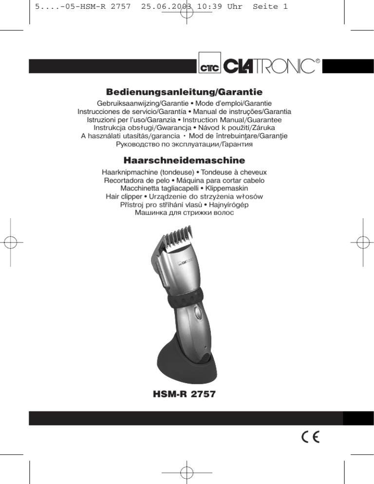 5....-05-HSM-R 2757 25.06.2003 10:39 Uhr Seite 1 R Bedienungsanleitung/Garantie Gebruiksaanwijzing/Garantie • Mode d’emploi/Garantie Instrucciones de servicio/Garantía • Manual de instruções/Garantia Istruzioni per l’uso/Garanzia • Instruction Manual/Guarantee Instrukcja obsługi/Gwarancja • Návod k použití/Záruka A használati utasítás/garancia • Mod de întrebuinflare/Garanflie Руководство по эксплуатации/Гарантия Haarschneidemaschine Haarknipmachine (tondeuse) • Tondeuse à cheveux Recortadora de pelo • Máquina para cortar cabelo Macchinetta tagliacapelli • Klippemaskin Hair clipper • Urządzenie do strzyżenia włosów Přístroj pro stříhání vlasů • Hajnyírógép Машинка для стрижки волос HSM-R 2757 5....-05-HSM-R 2757 25.06.2003 10:39 Uhr Seite 2 Inhalt D NL F E P I N GB PL CZ H RUS Inhoud • Sommaire • Indice • Índice • Indice Contents • Spis treści • Obsah • Tartalom • Conflinut • Содержание Übersicht Bedienelemente . . . . . . . . . . . . . . . . . . . . . . . . . .Seite Bedienungsanleitung . . . . . . . . . . . . . . . . . . . . . . . . . . . . . . .Seite Garantie . . . . . . . . . . . . . . . . . . . . . . . . . . . . . . . . . . . . . . . .Seite Overzicht bedieningselementen . . . . . . . . . . . . . . . . . . . . . .Pagina Gebruiksaanwijzing . . . . . . . . . . . . . . . . . . . . . . . . . . . . . . . .Pagina Garantie . . . . . . . . . . . . . . . . . . . . . . . . . . . . . . . . . . . . . . . .Pagina Aperçu des éléments de commande . . . . . . . . . . . . . . . . . . .Page Mode d’emploi . . . . . . . . . . . . . . . . . . . . . . . . . . . . . . . . . . .Page Garantie . . . . . . . . . . . . . . . . . . . . . . . . . . . . . . . . . . . . . . . .Page Vista de conjunto Elementos de mando . . . . . . . . . . . . . . . .Página Instrucciones de servicio . . . . . . . . . . . . . . . . . . . . . . . . . . . .Página Garantia . . . . . . . . . . . . . . . . . . . . . . . . . . . . . . . . . . . . . . . .Página Vista geral dos elemntos de comando . . . . . . . . . . . . . . . . .Página Manual de instruções . . . . . . . . . . . . . . . . . . . . . . . . . . . . . .Página Garantía . . . . . . . . . . . . . . . . . . . . . . . . . . . . . . . . . . . . . . . .Página Descrizione dei singoli pezzi . . . . . . . . . . . . . . . . . . . . . . . .Pagina Istruzioni per l’uso . . . . . . . . . . . . . . . . . . . . . . . . . . . . . . . . .Pagina Garanzia . . . . . . . . . . . . . . . . . . . . . . . . . . . . . . . . . . . .Pagina Oversikt over betjeningselementer . . . . . . . . . . . . . . . . . . . .Side Bruksanvisning . . . . . . . . . . . . . . . . . . . . . . . . . . . . . . . . . . .Side Garanti . . . . . . . . . . . . . . . . . . . . . . . . . . . . . . . . . . . . . . . . .Side Control element overview . . . . . . . . . . . . . . . . . . . . . . . . . . .Page Instruction Manual . . . . . . . . . . . . . . . . . . . . . . . . . . . . . . . . .Page Guarantee . . . . . . . . . . . . . . . . . . . . . . . . . . . . . . . . . . . . . .Page Przegląd elemetów obsługi . . . . . . . . . . . . . . . . . . . . . . . . .Strona Instrukcja obsługi . . . . . . . . . . . . . . . . . . . . . . . . . . . . . . . .Strona Gwarancja . . . . . . . . . . . . . . . . . . . . . . . . . . . . . . . . . . .Strona Přehled obsluhovací prvky . . . . . . . . . . . . . . . . . . . . . . . . . .Strana Návod k použití . . . . . . . . . . . . . . . . . . . . . . . . . . . . . . . . . .Strana Záruka . . . . . . . . . . . . . . . . . . . . . . . . . . . . . . . . . . . . .Strana A hasznalt elemek megtekintése . . . . . . . . . . . . . . . . . . . . .Oldal A hasznalati utasítás . . . . . . . . . . . . . . . . . . . . . . . . . . . . . .Oldal Garancia . . . . . . . . . . . . . . . . . . . . . . . . . . . . . . . . . . . . . . . .Oldal Обзор управляющих элементов . . . . . . . . . . . . . . . . . . . .стр. Руководство по эксплуатации . . . . . . . . . . . . . . . . . . . . . .стр. Гарантия . . . . . . . . . . . . . . . . . . . . . . . . . . . . . . . . . . . . . . . . .стр. 3 4 6 3 8 10 3 12 14 3 16 18 3 20 22 3 24 26 3 28 30 3 32 34 3 36 39 3 41 43 3 45 47 3 49 52 5....-05-HSM-R 2757 25.06.2003 10:39 Uhr Bedienelemente Zubehör 1. 2. 3. 4. 5. 6. 7. 1. 2. 3. 4. Klingenkopf Schiebeschalter O/I Schnittlängenkamm Lade-Kontrollleuchte Anschlussbuchse Ladestation/Aufsteller Funktionsring Seite 3 Kamm Reinigungsbürste Spezial-Öl Schere 3 5....-05-HSM-R 2757 25.06.2003 10:39 Uhr Seite 4 Allgemeine Sicherheitshinweise D • • • • • • • • • Lesen Sie vor Inbetriebnahme dieses Gerätes die Bedienungsanleitung sehr sorgfältig durch und bewahren Sie diese inkl. Garantieschein, Kassenbon und nach Möglichkeit den Karton mit Innenverpackung gut auf. Benutzen Sie das Gerät ausschließlich für den privaten und den dafür vorgesehenen Zweck. Dieses Gerät ist nicht für den gewerblichen Gebrauch bestimmt. Benutzen Sie es nicht im Freien (außer es ist für den bedingten Einsatz im Freien vorgesehen). Halten Sie es vor Hitze, direkter Sonneneinstrahlung, Feuchtigkeit (auf keinen Fall in Flüssigkeiten tauchen) und scharfen Kanten fern. Benutzen Sie das Gerät nicht mit feuchten Händen. Bei feucht oder nass gewordenem Gerät sofort den Netzstecker ziehen. Nicht ins Wasser greifen. Schalten Sie das Gerät aus und ziehen Sie immer den Stecker aus der Steckdose (ziehen Sie am Stecker, nicht am Kabel) wenn Sie das Gerät nicht benutzen, Zubehörteile anbringen, zur Reinigung oder bei Störung. Betreiben Sie das Gerät nicht unbeaufsichtigt. Sollten Sie den Arbeitsplatz verlassen, schalten Sie das Gerät bitte immer aus, bzw. ziehen Sie den Stecker aus der Steckdose (ziehen Sie am Stecker, nicht am Kabel). Um Kinder vor Gefahren elektrischer Geräte zu schützen, sorgen Sie bitte dafür, dass das Kabel
