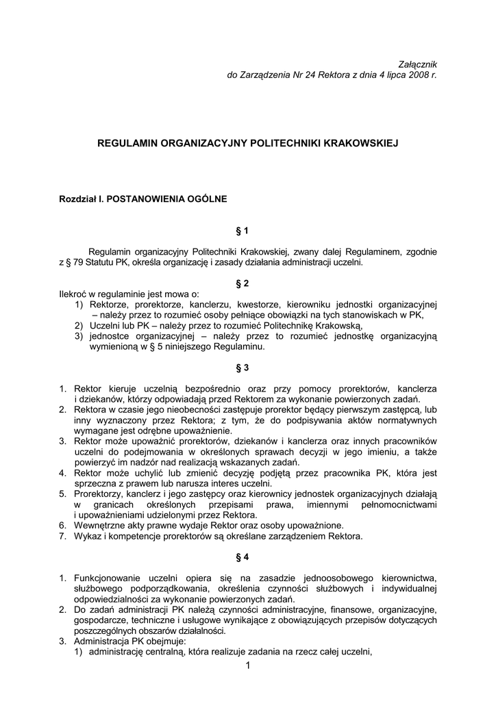 Załącznik do Zarządzenia Nr 24 Rektora z dnia 4 lipca 2008 r. REGULAMIN ORGANIZACYJNY POLITECHNIKI KRAKOWSKIEJ Rozdział I. POSTANOWIENIA OGÓLNE §1 Regulamin organizacyjny Politechniki Krakowskiej, zwany dalej Regulaminem, zgodnie z § 79 Statutu PK, określa organizację i zasady działania administracji uczelni. §2 Ilekroć w regulaminie jest mowa o: 1) Rektorze, prorektorze, kanclerzu, kwestorze, kierowniku jednostki organizacyjnej – naleŜy przez to rozumieć osoby pełniące obowiązki na tych stanowiskach w PK, 2) Uczelni lub PK – naleŜy przez to rozumieć Politechnikę Krakowską, 3) jednostce organizacyjnej – naleŜy przez to rozumieć jednostkę organizacyjną wymienioną w § 5 niniejszego Regulaminu. §3 1. Rektor kieruje uczelnią bezpośrednio oraz przy pomocy prorektorów, kanclerza i dziekanów, którzy odpowiadają przed Rektorem za wykonanie powierzonych zadań. 2. Rektora w czasie jego nieobecności zastępuje prorektor będący pierwszym zastępcą, lub inny wyznaczony przez Rektora; z tym, Ŝe do podpisywania aktów normatywnych wymagane jest odrębne upowaŜnienie. 3. Rektor moŜe upowaŜnić prorektorów, dziekanów i kanclerza oraz innych pracowników uczelni do podejmowania w określonych sprawach decyzji w jego imieniu, a takŜe powierzyć im nadzór nad realizacją wskazanych zadań. 4. Rektor moŜe uchylić lub zmienić decyzję podjętą przez pracownika PK, która jest sprzeczna z prawem lub narusza interes uczelni. 5. Prorektorzy, kanclerz i jego zastępcy oraz kierownicy jednostek organizacyjnych działają w granicach określonych przepisami prawa, imiennymi pełnomocnictwami i upowaŜnieniami udzielonymi przez Rektora. 6. Wewnętrzne akty prawne wydaje Rektor oraz osoby upowaŜnione. 7. Wykaz i kompetencje prorektorów są określane zarządzeniem Rektora. §4 1. Funkcjonowanie uczelni opiera się na zasadzie jednoosobowego kierownictwa, słuŜbowego podporządkowania, określenia czynności słuŜbowych i indywidualnej odpowiedzialności za wykonanie powierzonych zadań. 2. Do zadań administracji PK naleŜą czynności administracyjne, finansowe, organizacyjne, gospodarcze, techniczne i usługowe wynikające z obowiązujących przepisów dotyczących poszczególnych obszarów działalności. 3. Administracja PK obejmuje: 1) administrację centralną, która realizuje zadania na rzecz całej uczelni, 1 2) administrację wydziałową i innych jednostek organizacyjnych realizującą zadania, o których mowa w ust. 2., związane bezpośrednio z działalnością tych jednostek. 4. Pracą administracji centralnej kieruje kanclerz, z wyłączeniem jednostek organizacyjnych podporządkowanych bezpośrednio Rektorowi i prorektorom. 5. Pracą administracji wydziałowej i innych jednostek organizacyjnych kierują kierownicy tych jednostek. 6. Do realizacji określonych zadań kierujący pracą administracji, w zakresie powierzonych im spraw, mogą wyznaczać koordynatorów oraz stałe lub zadaniowe zespoły. 7. Jednostkami organizacyjnymi w administracji centralnej są biura, działy i zespoły oraz stanowiska jednoosobowe. 8. W skład jednostki organizacyjnej mogą wchodzić sekcje. 9. Na wniosek kierownika jednostki organizacyjnej jej strukturę ustala przełoŜony wnioskodawcy, po uzyskaniu formalnej opinii kierownika działu organizacyjnego. 10. Zadania oraz organizację wewnętrzną wydziałów i pozawydziałowych jednostek określają ich regulaminy organizacyjne uchwalone w trybie określonym w Statucie, z uwzględnieniem postanowień Regulaminu. 11. Regulaminy organizacyjne Domu Asystenta i Osiedla Studenckiego zatwierdza Rektor. 12. W sprawach nieuregulowanych regulaminem danej jednostki stosuje się postanowienia niniejszego Regulaminu oraz Statutu uczelni. 13. Strukturę organizacyjną i podległość jednostek organizacyjnych uczelni przedstawia załącznik do Regulaminu. §5 W skład uczelni wchodzą następujące jednostki organizacyjne: 1. Wydziały wymienione w załączniku nr 3 do Statutu PK. 2. Pozawydziałowe jednostki organizacyjne: 1) Biblioteka Politechniki Krakowskiej (B), 2) Centrum Pedagogiki i Psychologii (O5), 3) Centrum Sportu i Rekreacji (O4), 4) Centrum Szkolenia i Organizacji Systemów Jakości (CJ), 5) Centrum Transferu Technologii CTT (PN4), 6) Międzynarodowe Centrum Kształcenia (O2), 7) Międzyuczelniane Centrum Nowych Technologii Medycznych (PN2), 8) Studium Praktycznej Nauki Języków Obcych (O3). 3. Jednostki organizacyjne administracji centralnej: 1) Administrator Bezpieczeństwa Informacji (R2), 2) Archiwum PK (KA3), 3) Audytor Wewnętrzny (R4), 4) Biuro ds. studentów niepełnosprawnych (PD2), 5) Biuro Planowania (K3), 6) Biuro Karier (DA4), 7) Biuro Rektora (R1), 8) Biuro Współpracy Międzynarodowej (PW1), 9) Dom Asystenta (DA7), 10) Dział Badań Naukowych (PN1), 11) Dział BHP (R7), 12) Dział Eksploatacji (DT1), 13) Dział Finansowy (ZK2), 14) Dział Gospodarczy (DT4), 15) Dział Informatyzacji (DA1), 16) Dział Inwentaryzacji i Gospodarki Majątkowej (K2), 17) Dział Inwestycji i Remontów (DT2), 18) Dział Księgowości (ZK1), 19) Dział Nauczania (PD1), 20) Dział Organizacyjny (DA3), 21) Dział Płac (K1), 2 22) Dział Poligrafii (DA5), 23) Dział Promocji (DA2), 24) Dział Spraw Osobowych (KA1), 25) Dział Zamówień Publicznych (KA2), 26) Dział Zaopatrzenia (DT3), 27) Osiedle Studenckie (DA6), 28) Pełnomocnik Rektora ds. Ochrony Informacji Niejawnych i Kancelaria Tajna (R5), 29) Stanowisko ds. Kształcenia Podyplomowego (PW2), 30) Stanowisko ds. Ochrony PpoŜ. i Spraw Obronnych (DT6), 31) Stanowisko ds. Rozwoju Kadr (PN5), 32) Wydawnictwo Politechniki Krakowskiej (PN3), 33) Zespół Radców Prawnych (R3). §6 Zasady podpisywania dokumentów 1. Rektor podpisuje w szczególności: 1) korespondencję kierowaną do Prezydenta RP, Premiera, ministrów, kierowników centralnych i terenowych jednostek administracji publicznej, rektorów innych uczelni oraz dotyczącą ochrony informacji niejawnych, lust