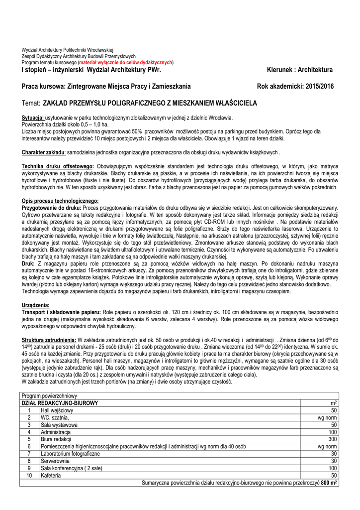 Wydział Architektury Politechniki Wrocławskiej Zespół Dydaktyczny Architektury Budowli Przemysłowych Program tematu kursowego (materiał wyłącznie do celów dydaktycznych) I stopień – inżynierski Wydział Architektury PWr. Praca kursowa: Zintegrowane Miejsca Pracy i Zamieszkania Kierunek : Architektura Rok akademicki: 2015/2016 Temat: ZAKŁAD PRZEMYSŁU POLIGRAFICZNEGO Z MIESZKANIEM WŁAŚCICIELA Sytuacja: usytuowanie w parku technologicznym zlokalizowanym w jednej z dzielnic Wrocławia. Powierzchnia działki około 0,5 – 1,0 ha. Liczba miejsc postojowych powinna gwarantować 50% pracowników możliwość postoju na parkingu przed budynkiem. Oprócz tego dla interesantów należy przewidzieć 10 miejsc postojowych i 2 miejsca dla właściciela. Obowiązuje 1 wjazd na teren działki. Charakter zakładu: samodzielna jednostka organizacyjna przeznaczona dla obsługi druku wydawnictw książkowych . Technika druku offsetowego: Obowiązującym współcześnie standardem jest technologia druku offsetowego, w którym, jako matryce wykorzystywane są blachy drukarskie. Blachy drukarskie są płaskie, a w procesie ich naświetlania, na ich powierzchni tworzą się miejsca hydrofilowe i hydrofobowe (tłuste i nie tłuste). Do obszarów hydrofilowych (przyciągających wodę) przylega farba drukarska, do obszarów hydrofobowych nie. W ten sposób uzyskiwany jest obraz. Farba z blachy przenoszona jest na papier za pomocą gumowych wałków pośrednich. Opis procesu technologicznego: Przygotowanie do druku: Proces przygotowania materiałów do druku odbywa się w siedzibie redakcji. Jest on całkowicie skomputeryzowany. Cyfrowo przetwarzane są teksty redakcyjne i fotografie. W ten sposób dokonywany jest także skład. Informacje pomiędzy siedzibą redakcji a drukarnią przesyłane są za pomocą łączy informatycznych, za pomocą płyt CD-ROM lub innych nośników . Na podstawie materiałów nadesłanych drogą elektroniczną w drukarni przygotowywane są folie poligraficzne. Służy do tego naświetlarka laserowa. Urządzenie to automatycznie naświetla, wywołuje i tnie w formaty folię światłoczułą. Następnie, na arkuszach astralonu (przezroczystej, sztywnej folii) ręcznie dokonywany jest montaż. Wykorzystuje się do tego stół prześwietleniowy. Zmontowane arkusze stanowią podstawę do wykonania blach drukarskich. Blachy naświetlane są światłem ultrafioletowym i utrwalane termicznie. Czynności te wykonywane są automatycznie. Po utrwaleniu blachy trafiają na halę maszyn i tam zakładane są na odpowiednie wałki maszyny drukarskiej. Druk: Z magazynu papieru role przenoszone są za pomocą wózków widłowych na halę maszyn. Po dokonaniu nadruku maszyna automatycznie tnie w postaci 16-stronnicowych arkuszy. Za pomocą przenośników chwytakowych trafiają one do introligatorni, gdzie zbierane są kolejno w całe egzemplarze książek. Potokowe linie introligatorskie automatycznie wykonują oprawę, szytą lub klejoną. Wykonanie oprawy twardej (płótno lub oklejany karton) wymaga większego udziału pracy ręcznej. Należy do tego celu przewidzieć jedno stanowisko dodatkowo. Technologia wymaga zapewnienia dojazdu do magazynów papieru i farb drukarskich, introligatorni i magazynu czasopism. Urządzenia: Transport i składowanie papieru: Role papieru o szerokości ok. 120 cm i średnicy ok. 100 cm składowane są w magazynie, bezpośrednio jedna na drugiej (maksymalna wysokość składowania 6 warstw, zalecana 4 warstwy). Role przenoszone są za pomocą wózka widłowego wyposażonego w odpowiedni chwytak hydrauliczny. Struktura zatrudnienia: W zakładzie zatrudnionych jest ok. 50 osób w produkcji i ok.40 w redakcji i administracji . Zmiana dzienna (od 600 do 1400) zatrudnia personel drukarni - 25 osób (druk) i 20 osób przygotowanie druku . Zmiana wieczorna (od 1400 do 2200) identyczna. W sumie ok. 45 osób na każdej zmianie. Przy przygotowaniu do druku pracują głównie kobiety i praca ta ma charakter biurowy (okrycia przechowywane są w pokojach, na wieszakach). Personel hali maszyn, magazynów i introligatorni to głównie mężczyźni, wymagane są szatnie ogólne dla 30 osób (występuje jedynie zabrudzenie rąk). Dla osób nadzorujących pracę maszyny, mechaników i pracowników magazynów farb przeznaczone są szatnie brudna i czysta (dla 20 os.) z zespołem umywalni i natrysków (występuje zabrudzenie całego ciała). W zakładzie zatrudnionych jest trzech portierów (na zmiany) i dwie osoby utrzymujące czystość. Program powierzchniowy DZIAŁ REDAKCYJNO-BIUROWY m2 1 Hall wejściowy 50 2 WC, szatnia, wg norm 3 Sala wystawowa 50 4 Administracja 100 5 Biura redakcji 300 6 Pomieszczenia higienicznosocjalne pracowników redakcji i administracji wg norm dla 40 osób wg norm 7 Laboratorium fotograficzne 30 8 Serwerownia 30 9 Sala konferencyjna ( 2 sale) 100 10 Kafeteria 50 Sumaryczna powierzchnia działu redakcyjno-biurowego nie powinna przekroczyć 800 m2 DZIAŁ PRODUKCYJNY - DRUKARNIA 1 Hala działu offsetów (wysokość hali w świetle konstrukcji = 6-9,0 m.) 2 Studio fotograficzne (naświetlanie) 3 Studio komputerowe 4 Introligatornia 5 Ekspedycja 6 Magazyny Ogółem powierzchnia działu produkcyjnego 400 200 200 100 150 350 1500 Ogółem powierzchnia mieszkania 30 100 min.20 120 MIESZKANIE WŁAŚCICIELA 1 Komunikacja pionowa [w przypadku spiętrzenia] 2 Mieszkanie 3 Taras rekreacyjny DZIAŁ POMIESZCZEŃ HIGIENICZNOSOCJALNYCH 1 Pomieszczenia higienicznosocjalne dla 50 pracowników (w tym 40 % kobiet) – 2 zmiany POMIESZCZENIA POMOCNICZE I TECHNICZNE 1 Warsztaty i magazyny gospodarcze 2 Wymiennikownia ciepła 3 Rozdzielnia elektryczna 4 Wentylatornia 5 Przyłącza Ogółem powierzchnia działu pomocniczo-technicznego wg norm 100 30 20 30 10 190 Dopuszcza się wprowadzenie kondygnacji podziemnej z przeznaczeniem na magazyny, garaże i pomieszczenia techniczne. Należy zapewnić maksymalnie elastyczne rozwiązanie rzutu kondygnacji produkcyjnej przez
