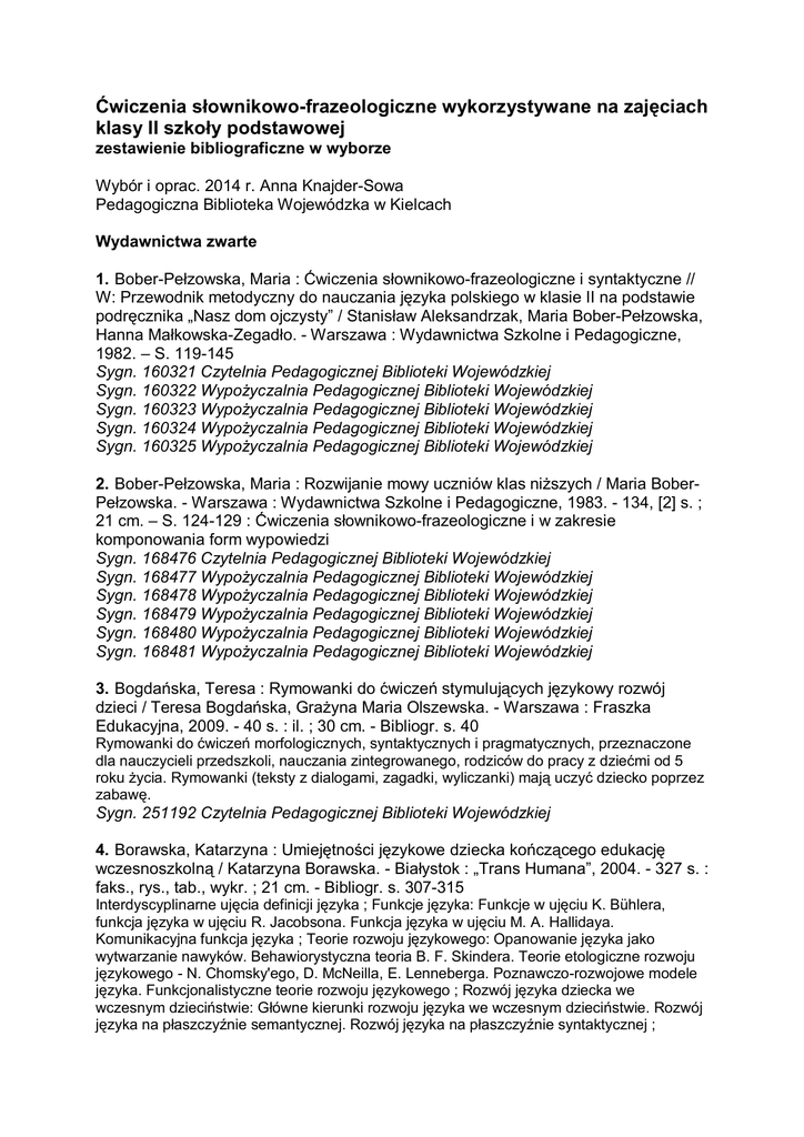 Ćwiczenia słownikowo-frazeologiczne wykorzystywane na zajęciach klasy II szkoły podstawowej zestawienie bibliograficzne w wyborze Wybór i oprac. 2014 r. Anna Knajder-Sowa Pedagogiczna Biblioteka Wojewódzka w Kielcach Wydawnictwa zwarte 1. Bober-Pełzowska, Maria : Ćwiczenia słownikowo-frazeologiczne i syntaktyczne // W: Przewodnik metodyczny do nauczania języka polskiego w klasie II na podstawie podręcznika „Nasz dom ojczysty” / Stanisław Aleksandrzak, Maria Bober-Pełzowska, Hanna Małkowska-Zegadło. - Warszawa : Wydawnictwa Szkolne i Pedagogiczne, 1982. – S. 119-145 Sygn. 160321 Czytelnia Pedagogicznej Biblioteki Wojewódzkiej Sygn. 160322 Wypożyczalnia Pedagogicznej Biblioteki Wojewódzkiej Sygn. 160323 Wypożyczalnia Pedagogicznej Biblioteki Wojewódzkiej Sygn. 160324 Wypożyczalnia Pedagogicznej Biblioteki Wojewódzkiej Sygn. 160325 Wypożyczalnia Pedagogicznej Biblioteki Wojewódzkiej 2. Bober-Pełzowska, Maria : Rozwijanie mowy uczniów klas niższych / Maria BoberPełzowska. - Warszawa : Wydawnictwa Szkolne i Pedagogiczne, 1983. - 134, [2] s. ; 21 cm. – S. 124-129 : Ćwiczenia słownikowo-frazeologiczne i w zakresie komponowania form wypowiedzi Sygn. 168476 Czytelnia Pedagogicznej Biblioteki Wojewódzkiej Sygn. 168477 Wypożyczalnia Pedagogicznej Biblioteki Wojewódzkiej Sygn. 168478 Wypożyczalnia Pedagogicznej Biblioteki Wojewódzkiej Sygn. 168479 Wypożyczalnia Pedagogicznej Biblioteki Wojewódzkiej Sygn. 168480 Wypożyczalnia Pedagogicznej Biblioteki Wojewódzkiej Sygn. 168481 Wypożyczalnia Pedagogicznej Biblioteki Wojewódzkiej 3. Bogdańska, Teresa : Rymowanki do ćwiczeń stymulujących językowy rozwój dzieci / Teresa Bogdańska, Grażyna Maria Olszewska. - Warszawa : Fraszka Edukacyjna, 2009. - 40 s. : il. ; 30 cm. - Bibliogr. s. 40 Rymowanki do ćwiczeń morfologicznych, syntaktycznych i pragmatycznych, przeznaczone dla nauczycieli przedszkoli, nauczania zintegrowanego, rodziców do pracy z dziećmi od 5 roku życia. Rymowanki (teksty z dialogami, zagadki, wyliczanki) mają uczyć dziecko poprzez zabawę. Sygn. 251192 Czytelnia Pedagogicznej Biblioteki Wojewódzkiej 4. Borawska, Katarzyna : Umiejętności językowe dziecka kończącego edukację wczesnoszkolną / Katarzyna Borawska. - Białystok : „Trans Humana”, 2004. - 327 s. : faks., rys., tab., wykr. ; 21 cm. - Bibliogr. s. 307-315 Interdyscyplinarne ujęcia definicji języka ; Funkcje języka: Funkcje w ujęciu K. Bühlera, funkcja języka w ujęciu R. Jacobsona. Funkcja języka w ujęciu M. A. Hallidaya. Komunikacyjna funkcja języka ; Teorie rozwoju językowego: Opanowanie języka jako wytwarzanie nawyków. Behawiorystyczna teoria B. F. Skindera. Teorie etologiczne rozwoju językowego - N. Chomsky'ego, D. McNeilla, E. Lenneberga. Poznawczo-rozwojowe modele języka. Funkcjonalistyczne teorie rozwoju językowego ; Rozwój języka dziecka we wczesnym dzieciństwie: Główne kierunki rozwoju języka we wczesnym dzieciństwie. Rozwój języka na płaszczyźnie semantycznej. Rozwój języka na płaszczyźnie syntaktycznej ; Charakterystyka języka dziecka w młodszym wieku szkolnym: Rozwój umiejętności czytania. Rozwój gramatycznej strony języka dziecka w młodszym wieku szkolnym. Rozwój słownictwa i pojęć. Język dziecka jako narzędzie komunikacji społecznej ; Językowa aktywność twórcza dziecka ; Język mówiony a język pisany ; Społeczno-kulturowe uwarunkowania rozwoju języka dziecka: Socjolingwistyczna teoria kodów językowych B. Bernsteina. Szanse edukacyjne dzieci w świetle teorii socjologicznej P. Bourdieu ; Środowisko szkolne a rozwój języka dziecka ; Metodologia i organizacja badań własnych ; Umiejętności językowe dzieci z różnych środowisk szkolnych: Analiza spójności linii narracji. Analiza jakości pola narracji. Analiza struktury epizodu opowiadania. Analiza narracyjnego pejzażu akcji. Analiza narracyjnego pejzażu świadomości. Analiza perspektywy czasowej narracji. Analiza zróżnicowania środków stylistycznych. Zróżnicowanie funkcji intencjonalnej wypowiedzeń opowiadania. Analiza struktur syntaktycznych opowiadania. Diagnoza poziomu umiejętności językowych dziecka zróżnicowana ze względu na środowisko szkolne ; Umiejętności językowe dziewczynek i chłopców: Analiza spójności linii narracji. Analiza jakości pola narracji. Analiza struktury epizodu opowiadania. Analiza narracyjnego pola pejzażu akcji. Analiza narracyjnego pejzażu świadomości. Analiza perspektywy czasowej narracji. Analiza zróżnicowania środków stylistycznych. Zróżnicowanie funkcji intencjonalnej wypowiedzeń opowiadania. Analiza struktur syntaktycznych opowiadania. Diagnoza umiejętności językowych dzieci zróżnicowana ze względu na płeć ; Umiejętności językowe dzieci z rodzin o różnym poziomie statusu socjoedukacyjnego ; Wewnątrzgrupowa analiza umiejętności językowych dziecka ; Kształtowanie języka dziecka w opinii nauczycieli edukacji wczesnoszkolnej: Cele wczesnoszkolnej edukacji językowej. Środowisko rodzinne a rozwój języka dziecka. Proces kształtowania umiejętności narracyjnych dziecka. Metody i ćwiczenia rozwijające językową aktywność twórczą dziecka. Rozwój zainteresowań czytelniczych dziecka ; Wspomaganie rozwoju języka dziecka w edukacji wczesnoszkolnej. Sygn. 238577 Czytelnia Pedagogicznej Biblioteki Wojewódzkiej 5. Czelakowska, Danuta : Metodyka edukacji polonistycznej dzieci w wieku wczesnoszkolnym / Danuta Czelakowska. - Kraków : Oficyna Wydawnicza „Impuls”, 2009. - 329 s. : il. ; 24 cm. - Bibliogr. s. 317-324. - S. 129-136 : Ćwiczenia słownikowo-frazeologiczne i ich funkcje w procesie kształcenia mowy Sygn. 246291 Czytelnia Pedagogicznej Biblioteki Wojewódzkiej Sygn. 246292 Wypożyczalnia Pedagogicznej Biblioteki Wojewódzkiej Sygn. 246758 (Wyd. 2, 2010 r.) Wypożyczalnia Pedagogicznej Biblioteki Wojewódzkiej Sygn. 250476 (Wyd. 2, 2010 r.) Wypożyczalnia Pedagogicznej Biblioteki Wojewódzki