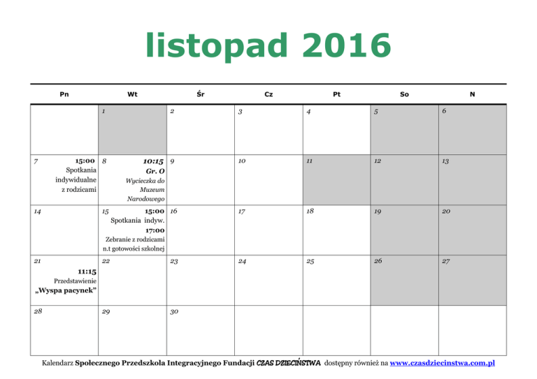 listopad 2016 Pn 7 Wt Śr 1 2 15:00 8 Spotkania indywidualne z rodzicami 10:15 9 14 15 Cz Pt So N 3 4 5 6 10 11 12 13 17 18 19 20 24 25 26 27 Gr. O Wycieczka do Muzeum Narodowego 15:00 16 Spotkania indyw. 17:00 Zebranie z rodzicami n.t gotowości szkolnej 21 22 23 29 30 11:15 Przedstawienie „Wyspa pacynek” 28 Kalendarz Społecznego Przedszkola Integracyjnego Fundacji CZAS DZIECIŃSTWA dostępny również na www.czasdziecinstwa.com.pl
