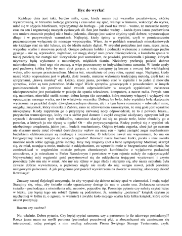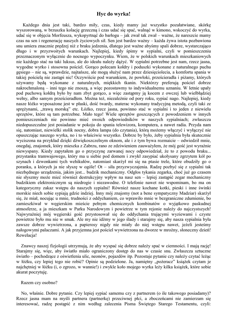 Hyc do wyrka! Każdego dnia jest taki, bardzo miły, czas, kiedy mamy już wszystko pozałatwiane, skórkę wyszorowaną, w brzuszku kolację grzeczną i czas udać się spać, walnąć w kimono, wskoczyć do wyrka, udać się w objęcia Morfeusza, wykopyrtnąć do barłogu – jak zwał tak zwał – ważne, że nareszcie mamy czas na sen i regenerację naszych życiowych sił. Sen jest bardzo ważny – każda żywa istota pozbawiona snu umiera znacznie prędzej niż z braku jedzenia, dlatego jest ważne abyśmy spali dobrze, wystarczająco długo i w przyzwoitych warunkach. Najlepiej, kiedy śpimy w sypialni, czyli w pomieszczeniu przeznaczonym wyłącznie do nocnego wypoczynku. Wiem, że w polskich warunkach mieszkaniowych nie każdego stać na taki luksus, ale do ideału należy dążyć. W sypialni potrzebne jest nam, rzecz jasna, wygodne wyrko i stosowna pościel. Gorąco polecam kołdry i poduszki wykonane z naturalnego puchu gęsiego – nie są, wprawdzie, najtańsze, ale mogą służyć nam przez dziesięciolecia, a komfortu spania w takiej pościelą nie zastąpi nic! Oczywiście pod warunkiem, że powłoki, prześcieradła i piżamy, których używamy będą wykonane z naturalnych, miękkich tkanin. Niektórzy preferują pościel dobrze nakrochmaloną – inni tego nie znoszą, a więc pozostawmy to indywidualnemu uznaniu. W letnie upały pod puchową kołdrą było by nam zbyt gorąco, a więc zastąpmy ją kocem z owczej lub wielbłądziej wełny, albo samym prześcieradłem. Można też, niezależnie od pory roku, sypiać nago. Najlepiej, kiedy nasze łóżko wyposażone jest w płaski, dość twardy, materac wykonany tradycyjną metodą, czyli taki ze sprężynami, „trawą morską” etc. Łóżko, rzecz jasna, powinno stać w sypialni i to jeden z niewielu sprzętów, które są tam potrzebne. Mało tego! Wiele sprzętów goszczących z powodzeniem w innych pomieszczeniach nie powinno mieć swoich odpowiedników w naszych sypialniach; zwłaszcza niedopuszczalne jest posiadanie w pokoju do spania telewizora, komputera, a nawet radia. Przyda nam się, natomiast, niewielki stolik nocny, dobra lampa (do czytania), którą możemy włączyć i wyłączyć nie opuszczając naszego wyrka, no i to właściwie wszystko. Dobrze by było, żeby sypialnia była skutecznie wyciszona na przykład dzięki dźwiękoszczelnym oknom, ale i z tym bywa rozmaicie – odwiedził mnie, onegdaj, znajomek, który mieszka z Zabrzu, rano ze zdziwieniem zauważyłem, że mój gość jest wyraźnie niewyspany. Kiedy zapytałem go o przyczynę zarwanej nocy odpowiedział, że to z powodu braku... przystanku tramwajowego, który ma u siebie pod domem i zwykł zasypiać ukołysany zgrzytem kół po szynach i dzwonkami tych wehikułów, natomiast skarżył mi się na ptasie trele, które obudziły go o poranku, a których ja nie słyszę w ogóle! Ot – siła przyzwyczajenia. Radzę pozbyć się z sypialni tak niezbędnego urządzenia, jakim jest... budzik mechaniczny. Odgłos tykania zegarka, choć już go czasem nie słyszmy może mieć również destrukcyjny wpływ na nasz sen – lepiej zastąpić zegar mechaniczny budzikiem elektronicznym są niedrogie i niezawodne. O telefonie nawet nie wspominam, bo ma on kategoryczny zakaz wstępu do naszych sypialni! Również nasze kochane kotki, pieski i inne świnki morskie niech sobie sypiają gdzie indziej. Inny mój znajomy (not a bene sympatyczny Madziar) skarżył się, że miał, nocując u mnie, trudności z oddychaniem, co wprawiło mnie w bezgraniczne zdumienie, bo zamieszkiwał w węgierskim mieście pełnym chemicznych kombinatów o wyjątkowo paskudnej atmosferze, a ja mieszkam w Parku Narodowym i powietrze w tym rejonie należy do najczystszych! Najwyraźniej mój węgierski gość przystosował się do oddychania trującymi wyziewami i czyste powietrze było mu nie w smak. Ale my nie idźmy w jego ślady i starajmy się, aby nasza sypialnia była zawsze dobrze wywietrzona, a papierosy nigdy nie miały do niej wstępu nawet, jeżeli jesteśmy nałogowymi palaczami. A jak przyjemna jest pościel wywietrzona na dworze w mroźny, słoneczny dzień! Rewelacja! Znawcy naszej fizjologii utrzymują, że aby wyspać się dobrze należy spać w ciemności. I mają rację! Starajmy się, więc, aby światło miało ograniczony dostęp do nas w czasie snu. Zwłaszcza sztuczne światło – pochodzące z oświetlenia ulic, neonów, pojazdów itp. Pozostaje pytanie czy należy czytać leżąc w łóżku, czy lepiej tego nie robić? Opinie są podzielone. Ja, namiętny „pożeracz” książek czytam je najchętniej w łóżku (i, o zgrozo, w wannie!) i zwykle koło mojego wyrka leży kilka książek, które sobie akurat poczytuję. Razem czy osobno? No, właśnie. Dobre pytanie. Czy lepiej sypiać samemu czy z partnerem (o ile takowego posiadamy)? Rzecz jasna mam na myśli partnera (partnerkę) przeciwnej płci, a zboczeńcami nie zamierzam się interesować, radzę postąpić z nim według zalecenia Pisma Świętego Starego Testamentu, czyli: wyprowadzić za miasto i ukamienować. No, może nie dosłownie. Odpowiedź jest jednoznaczna zdecydowanie lepiej jest sypiać z bliską osobą niż samemu. I to z kilku różnych przyczyn. Wspólne łóżko ułatwia utrzymanie więzi pomiędzy kobietą i mężczyzną. Rozmowy na istotne dla związku tematy najlepiej przeprowadzać właśnie w łóżku, kiedy nie jesteśmy skrępowani obecnością innych domowników, rozproszeni pracą i codzienną bieganiną. Oprócz tego fizyczna bliskość drugiej osoby jest, po prostu, zdrowa dla naszego ciała, a uzupełniające i komplementarne pola elektryczne (bioelektronika Sedlaka!) kobiety i mężczyzny powodują, że sen jest pełniejszy i siły organizmu regeneruje odczuwalnie sprawniej. (Tutaj autor zrobił przerwę i poszedł podziwiać zaćmienie słońca). Z przymrużeniem oka dodam, że można zaoszczędzić nieco na ogrzewaniu grzejąc się wzajemnie pod pierzyn